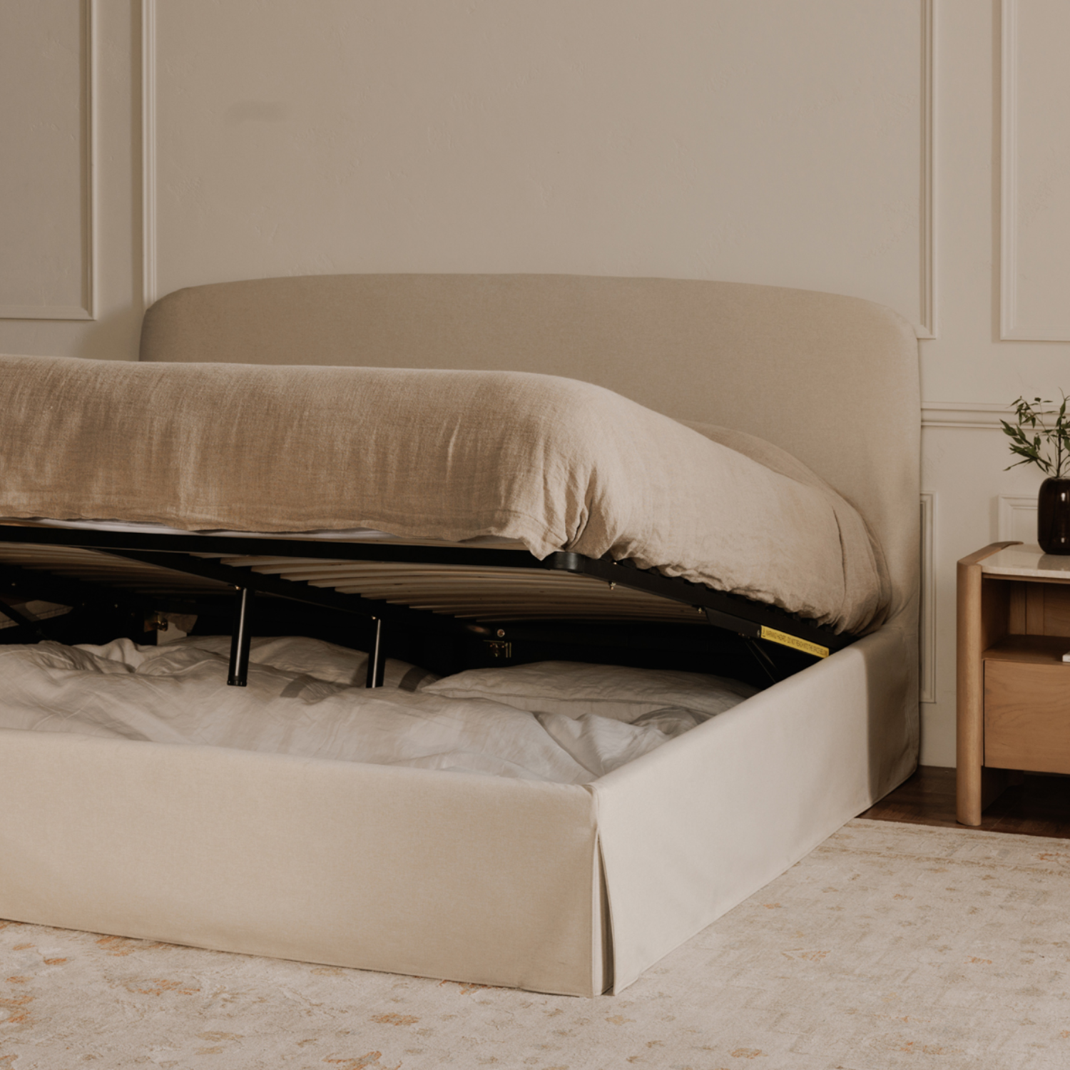 Le lit Joan est plus que ce que l'on voit, avec un compartiment caché, innovant avec goût et facile d'accès. Sous le matelas, un système hydraulique révèle un grand espace de rangement soigneusement rangé, tandis qu'une housse entièrement amovible permet un nettoyage facile.