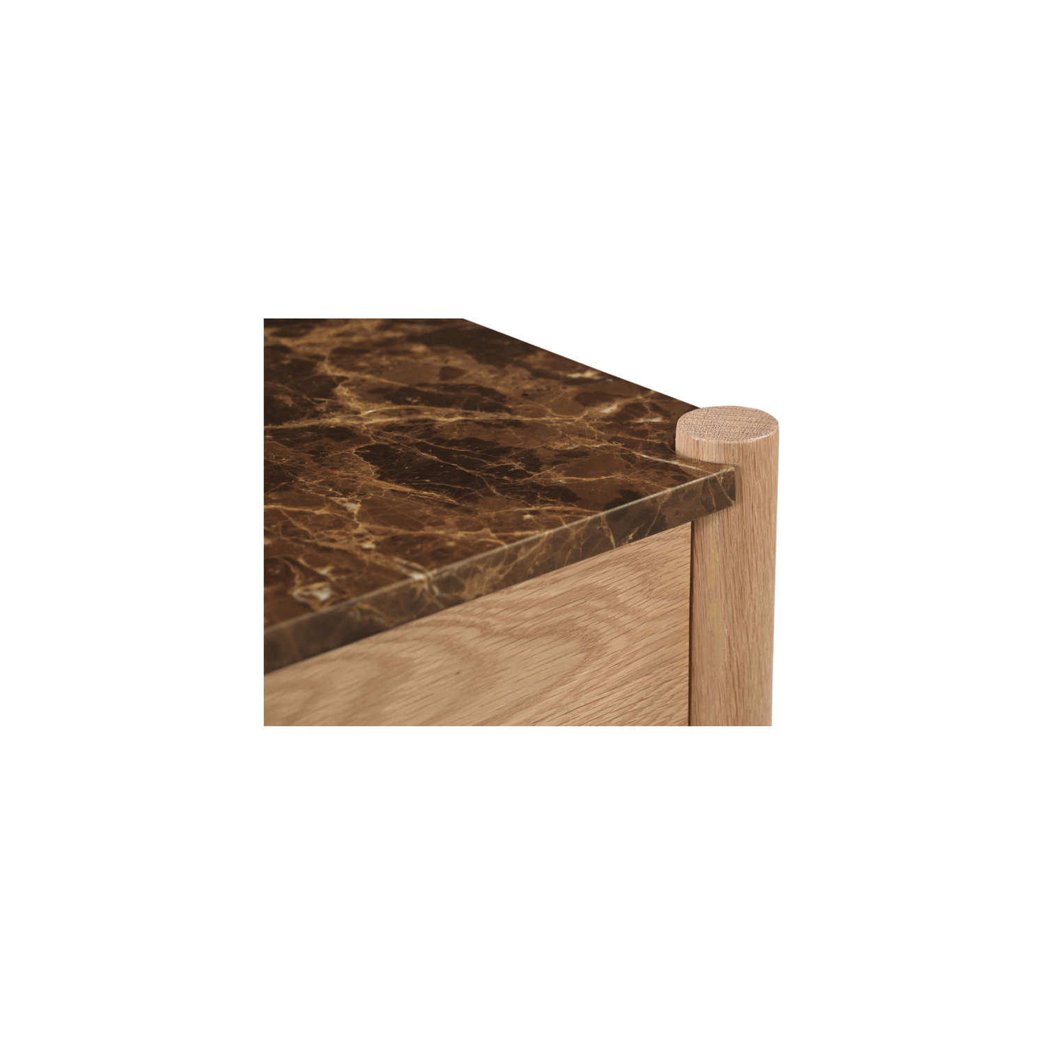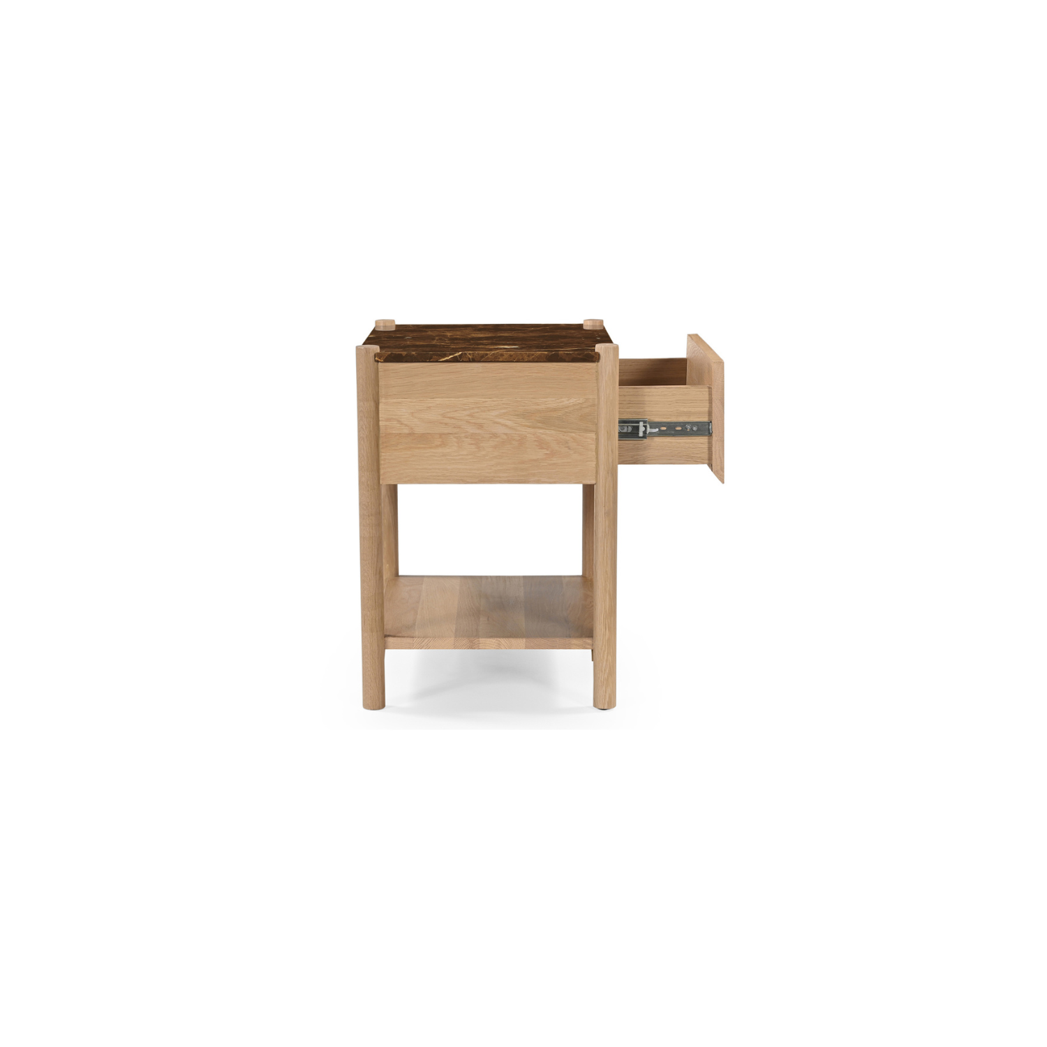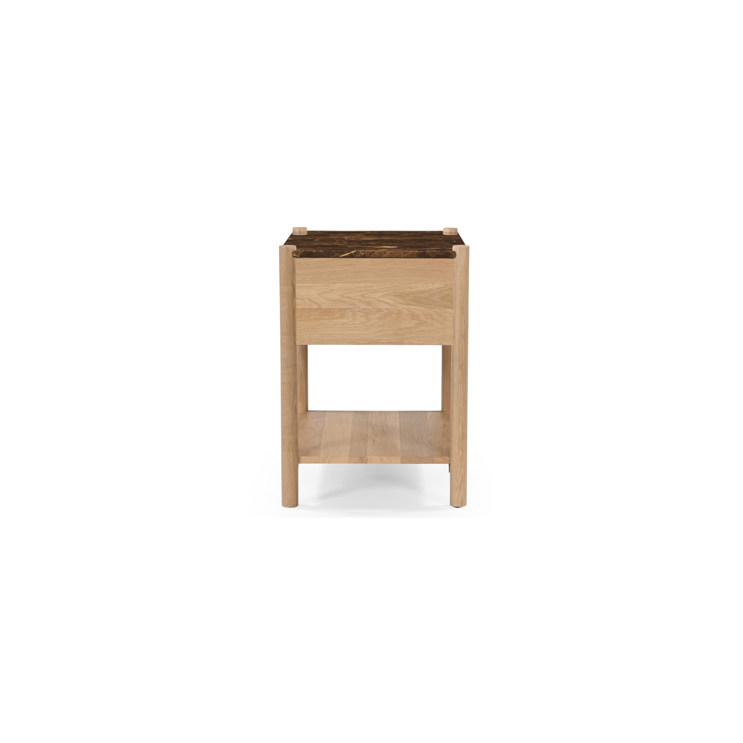 Les riches tons du marbre foncé Emperador se marient harmonieusement à la chaleur naturelle du chêne, créant une pièce au luxe discret. Un plateau en marbre, une étagère en chêne et un tiroir à fermeture amortie allient style et fonctionnalité. Des découpes distinctives sur le plateau ajoutent un intérêt visuel, tandis que le veinage unique du marbre confère à chaque pièce un caractère unique.