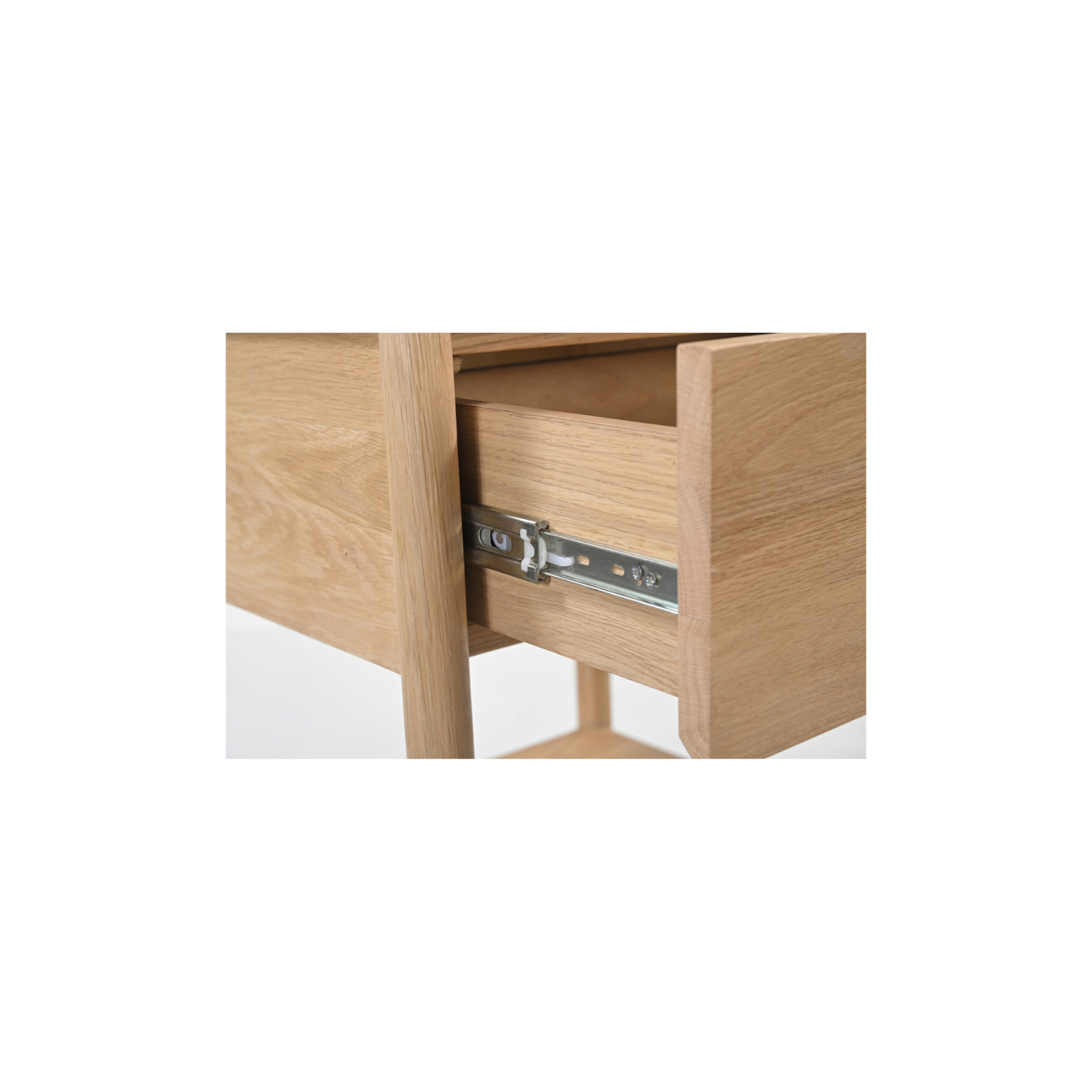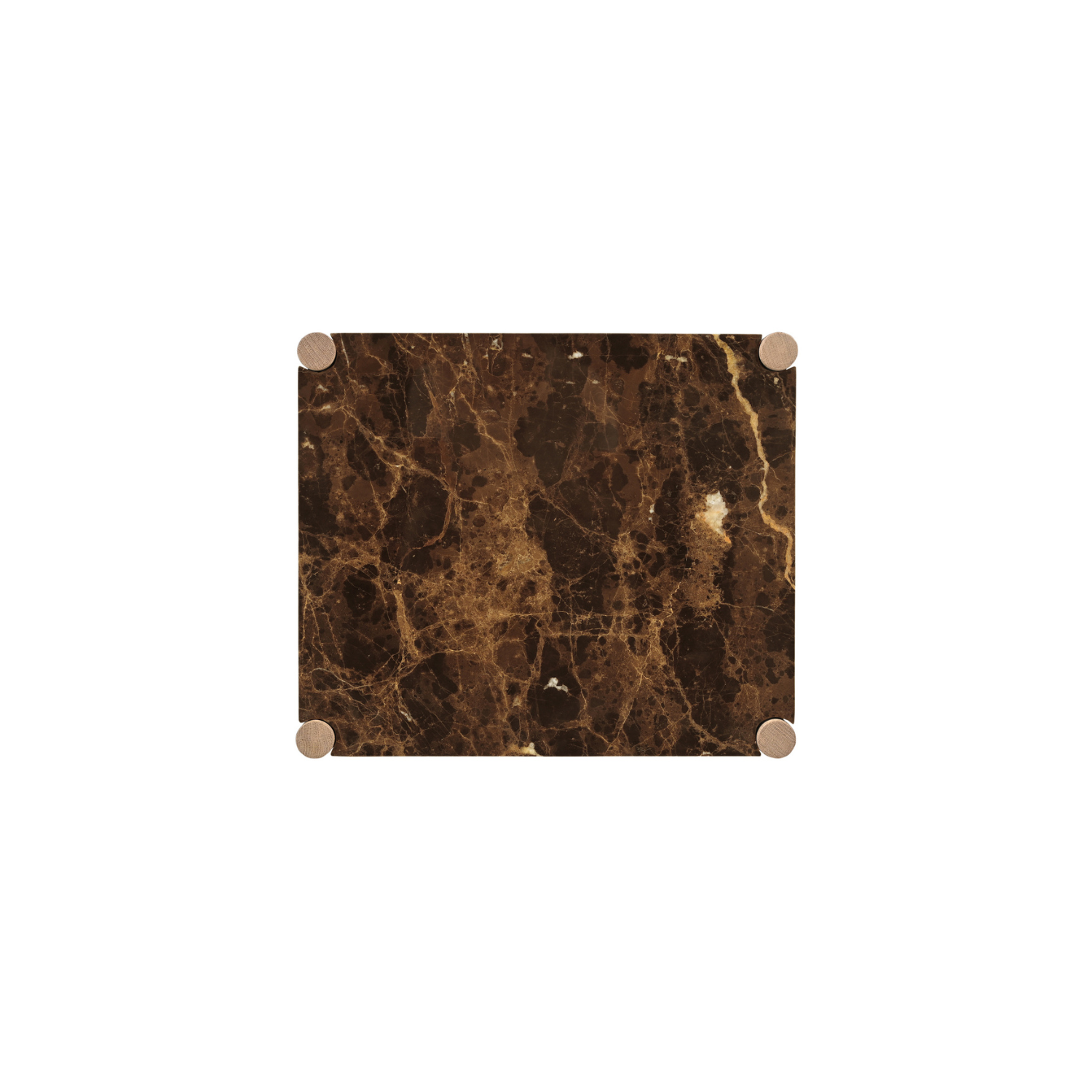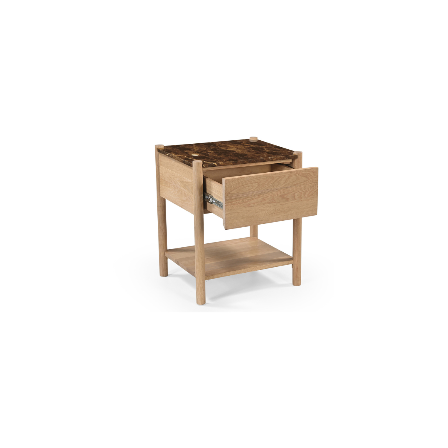 Les riches tons du marbre foncé Emperador se marient harmonieusement à la chaleur naturelle du chêne, créant une pièce au luxe discret. Un plateau en marbre, une étagère en chêne et un tiroir à fermeture amortie allient style et fonctionnalité. Des découpes distinctives sur le plateau ajoutent un intérêt visuel, tandis que le veinage unique du marbre confère à chaque pièce un caractère unique.