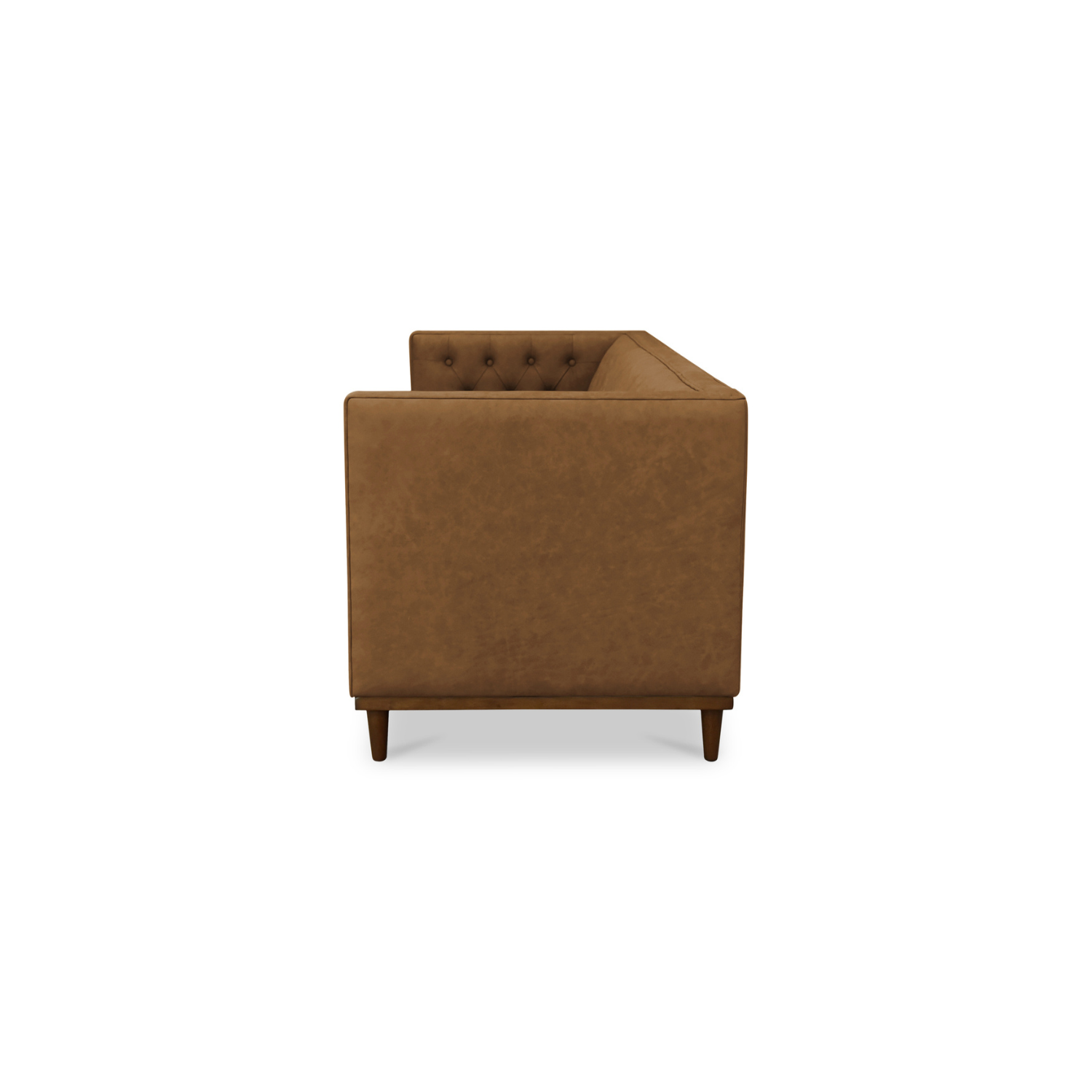 Le canapé Fielder allie élégance traditionnelle et résilience contemporaine, avec un revêtement en cuir brésilien de première qualité avec un léger gaufrage élégant et une finition très légère. La forme classique comprend des détails touffetés, faisant un clin d'œil à l'esthétique traditionnelle, tandis que les lignes épurées et la finition noyer chaleureuse de la base en bois apportent une touche moderne.