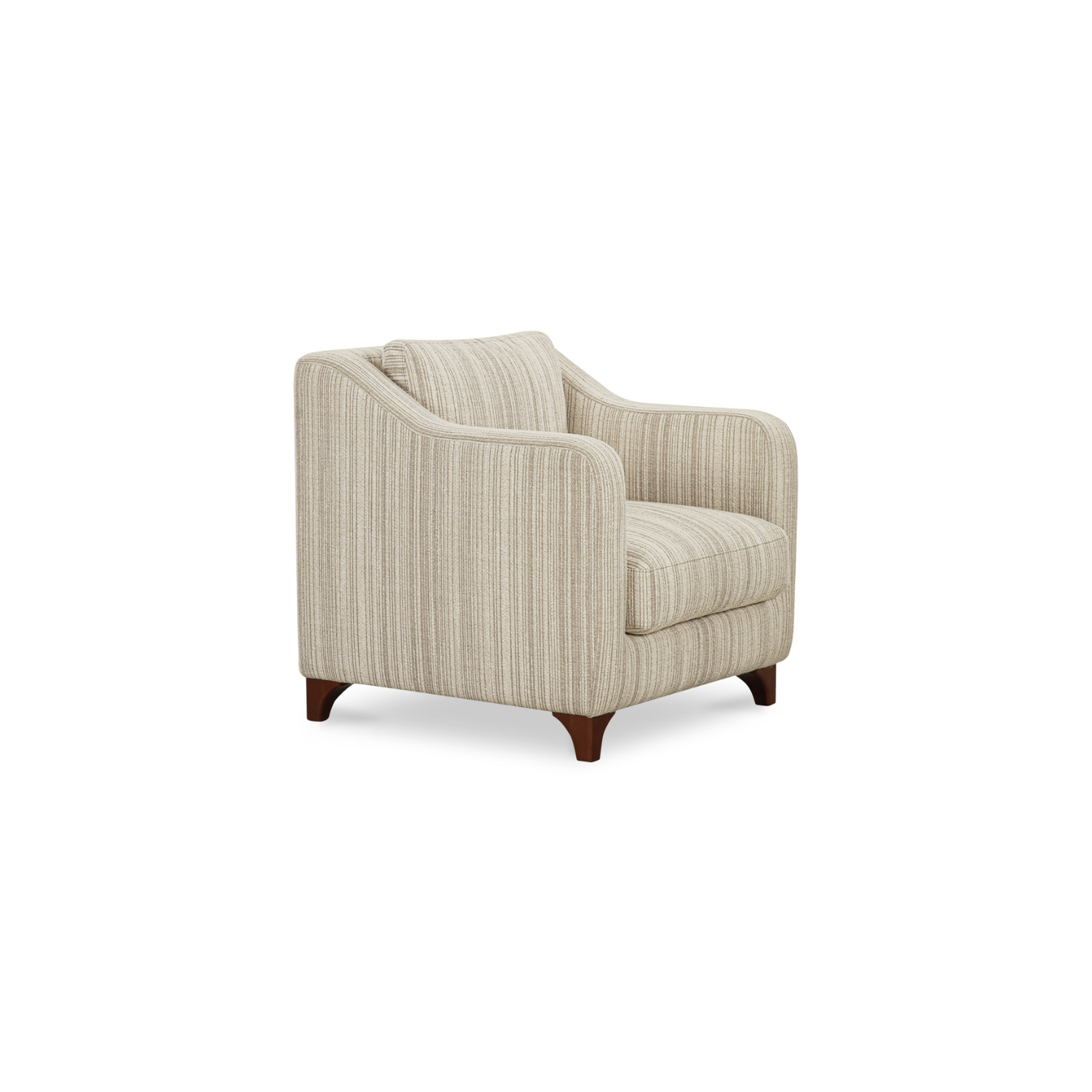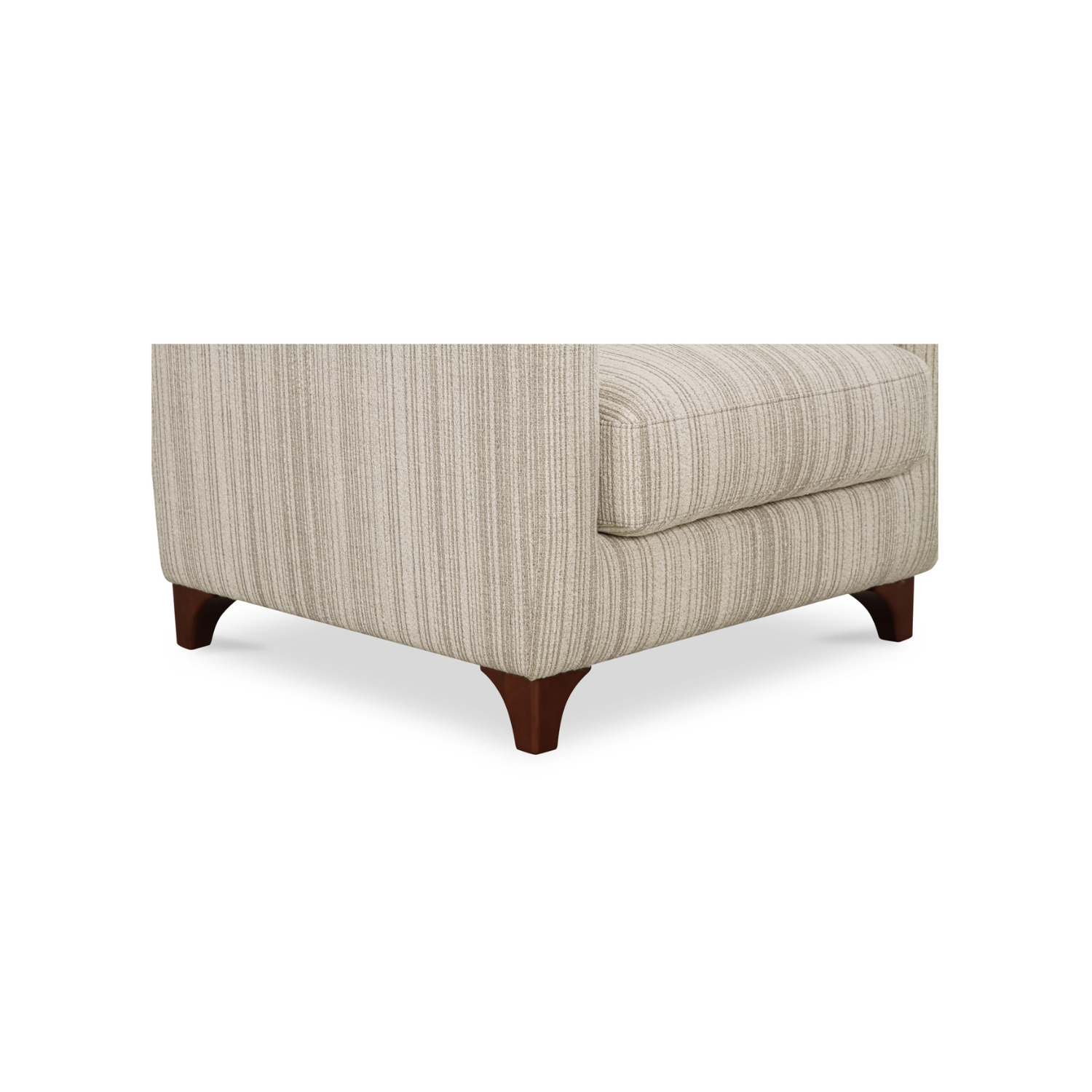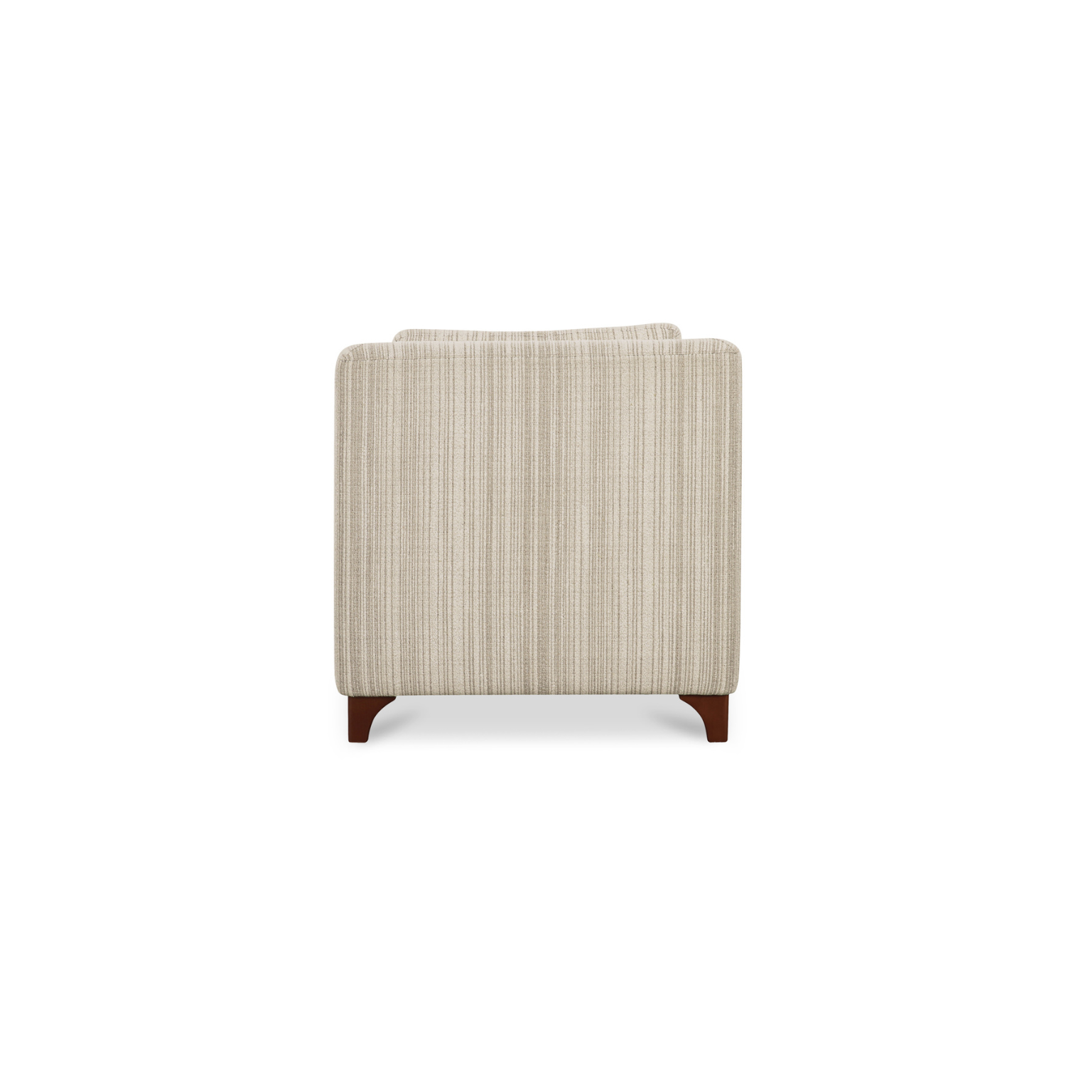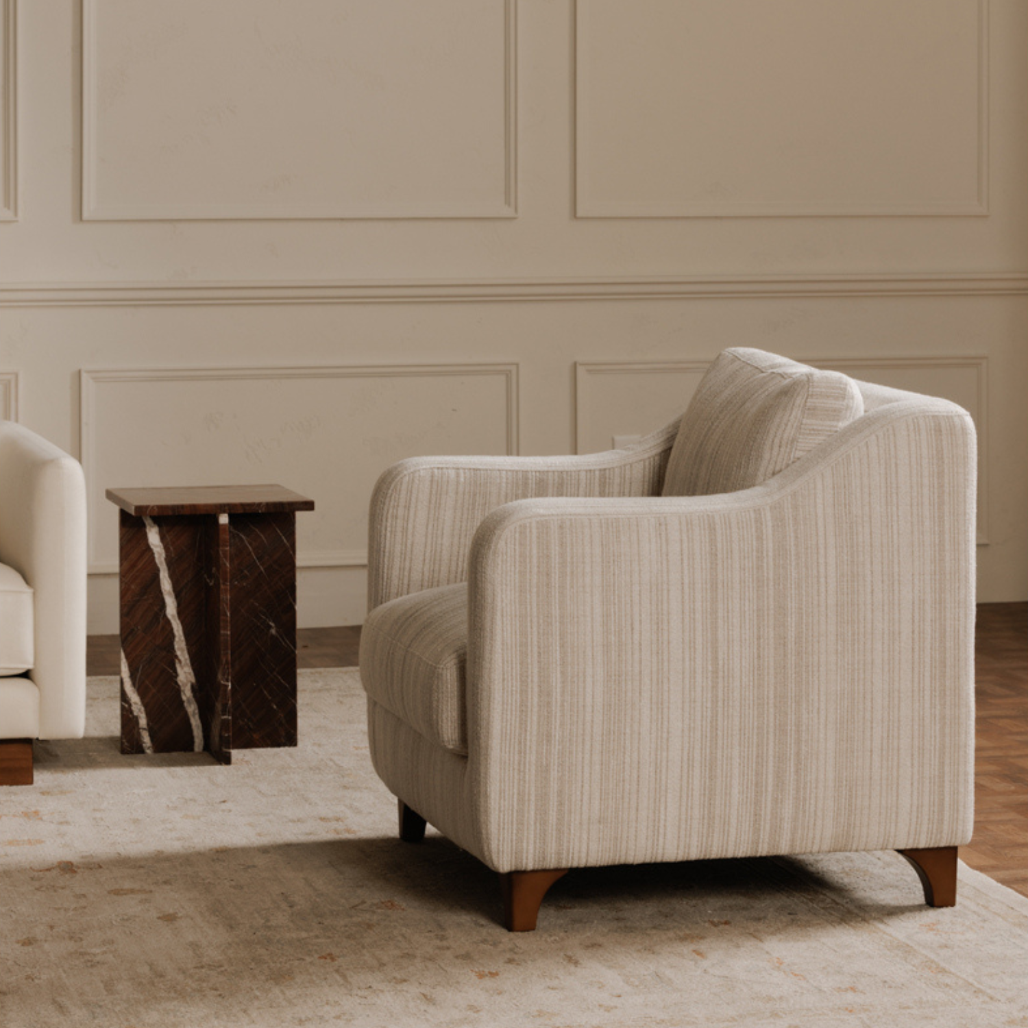Il est doté de coussins amovibles et réversibles pour un confort optimal, d'accoudoirs légèrement inclinés et d'un dossier haut favorisant une posture accueillante, ainsi que de pieds incurvés en bouleau massif qui ajoutent une touche d'élégance à sa structure.