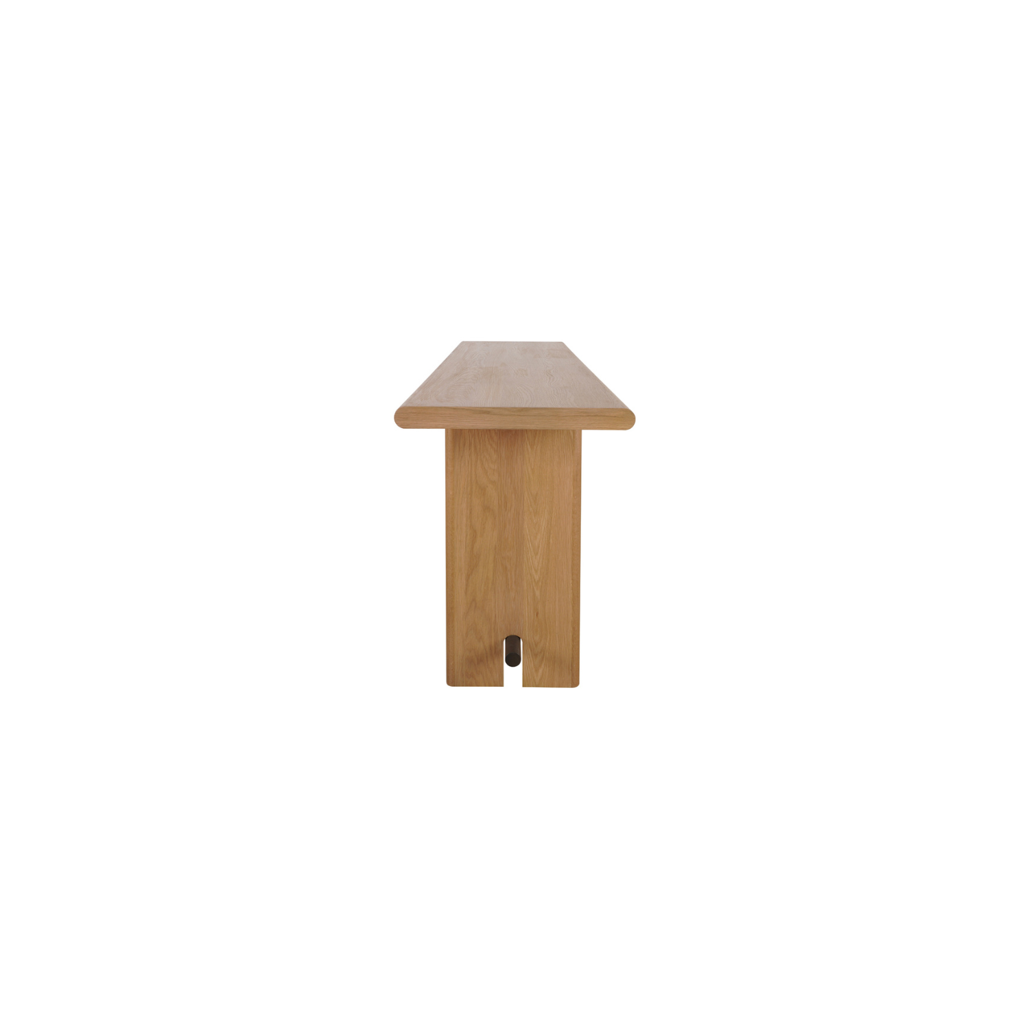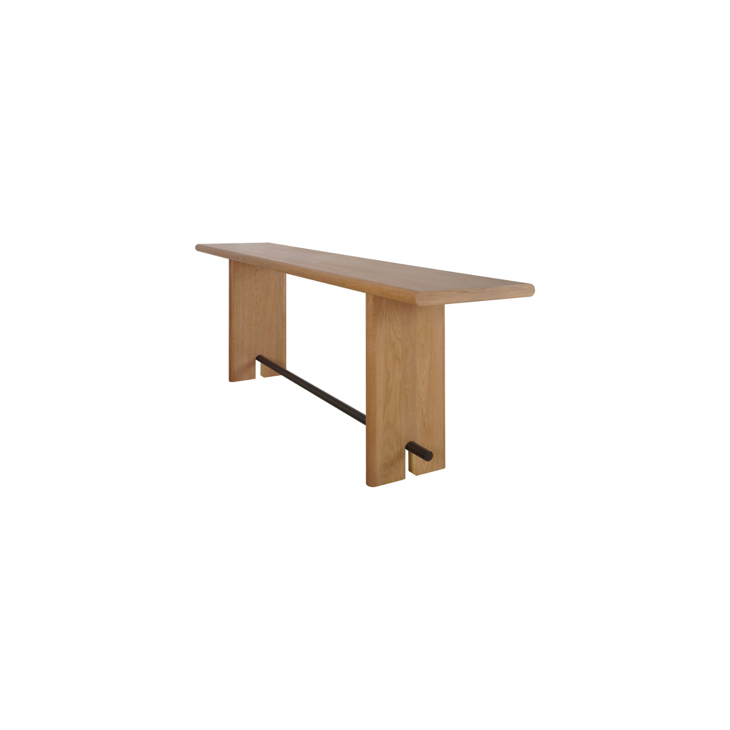 Des pieds sculptés, ornés de sculptures arquées, sont reliés par une barre en bronze noirci, insufflant un chic industriel subtil et offrant un point focal sophistiqué pour les entrées ou les salons.
