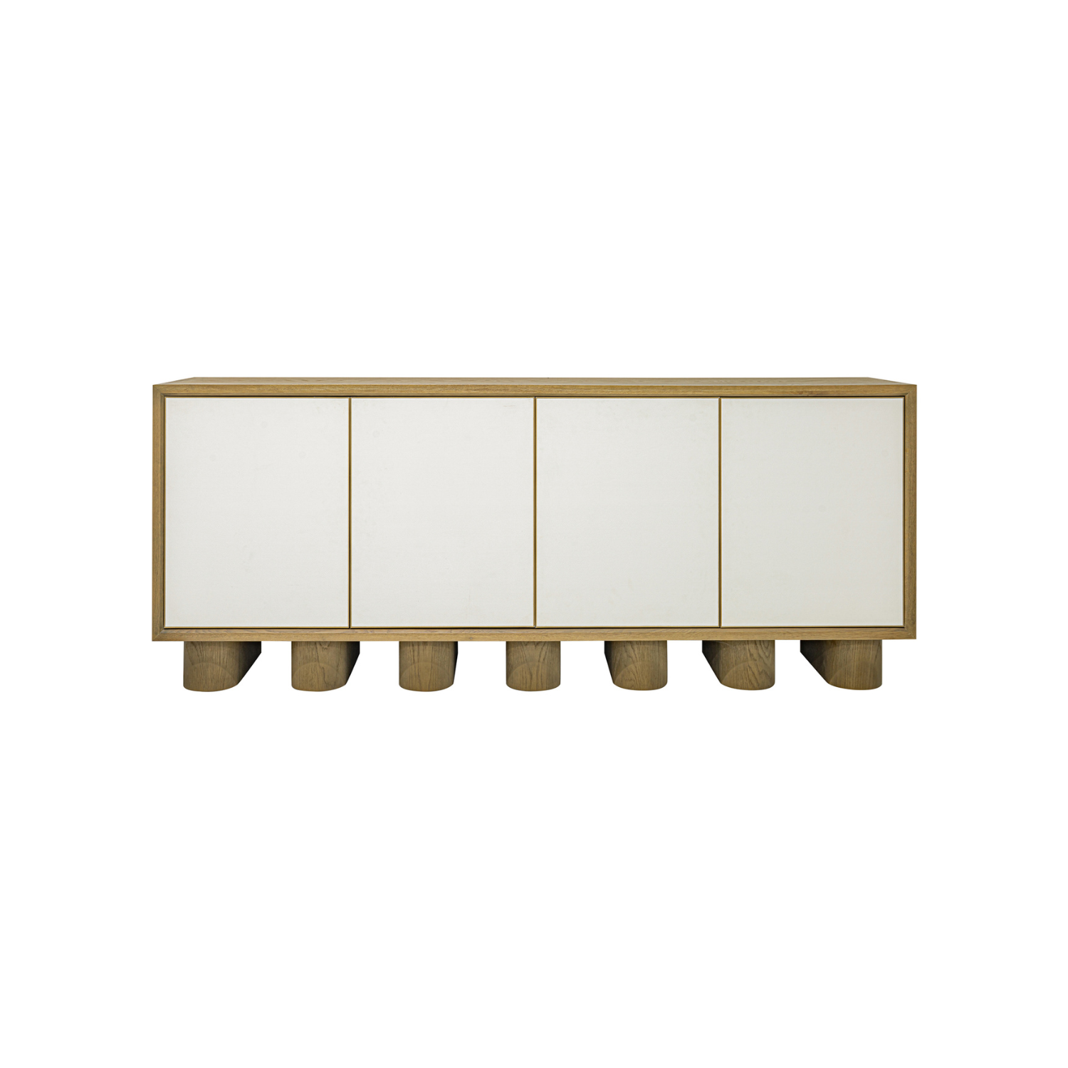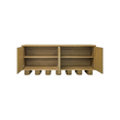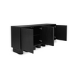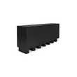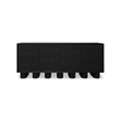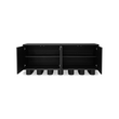 Le buffet Marcelle en noir incarne l'élégance minimaliste, tandis que des pieds ludiques et épais animent des lignes épurées. Le chêne brossé rencontre le galuchat noir élégant, encadré par des accents dorés antiques, créant une symphonie de textures. Les portes à ouverture par pression révèlent un grand espace de rangement, tandis que des trous discrets pour les supports assurent une gestion transparente des câbles.