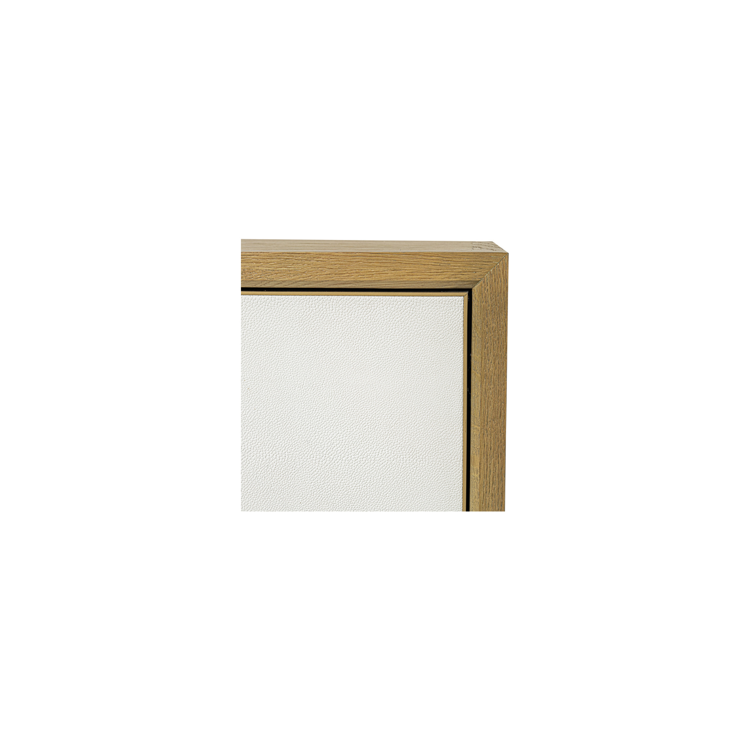- Cadre en métal doré antique entre le cadre en chêne brossé et la porte en galuchat noir. Dessus et panneaux latéraux en placage de chêne