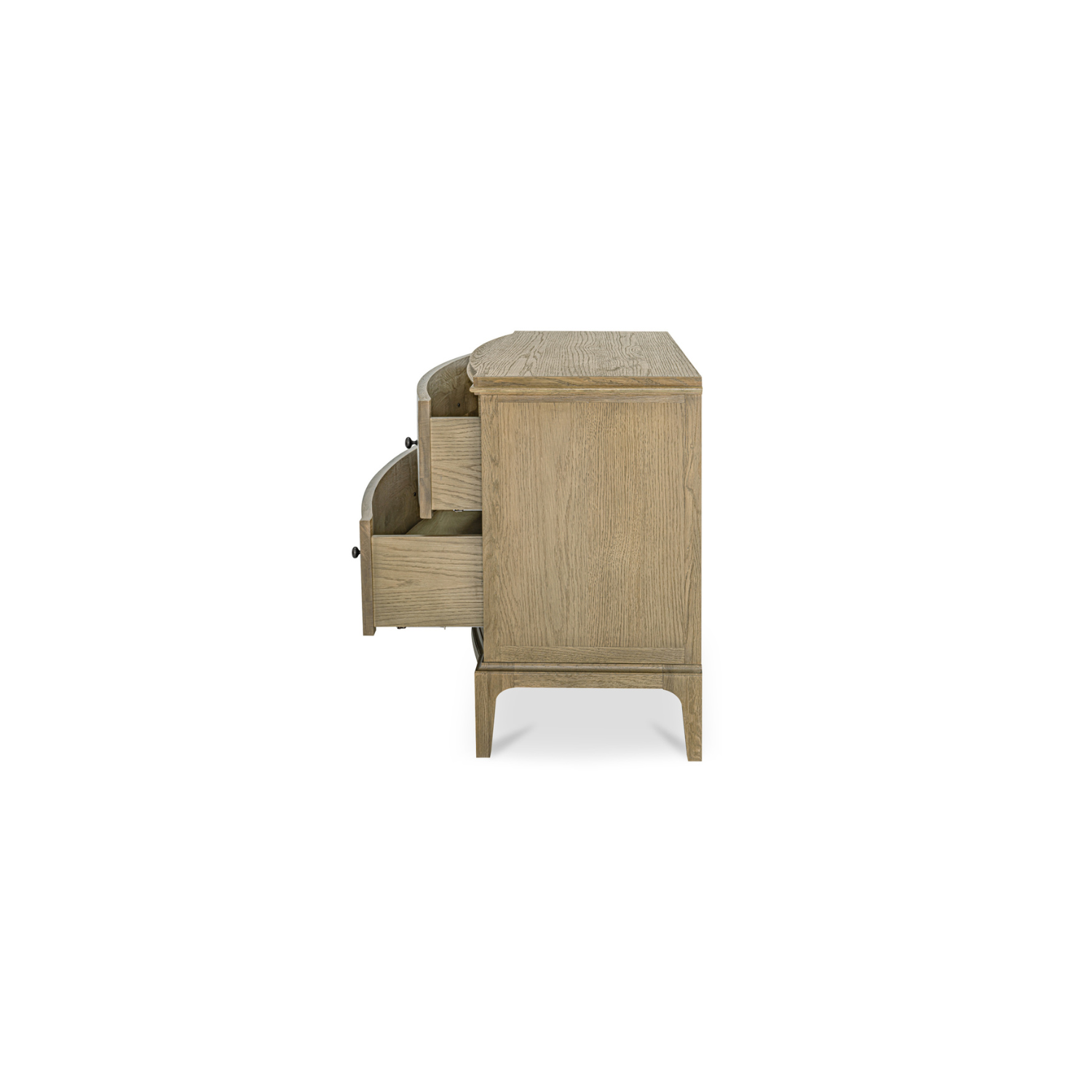 Les courbes douces et la finition en chêne brossé de la table de chevet Sadie incarnent le classicisme moderne. Son surplomb, aux bords arrondis et à la façade incurvée, offre un rythme visuel apaisant. Deux tiroirs spacieux offrent un grand espace de rangement, alliant forme et fonctionnalité.