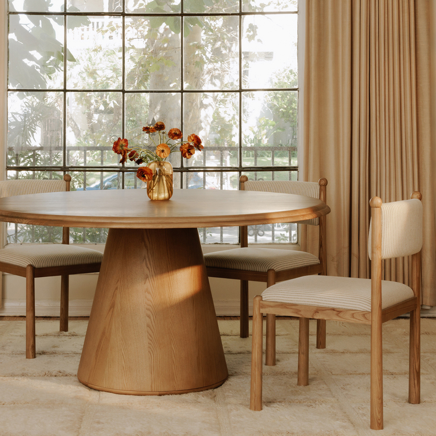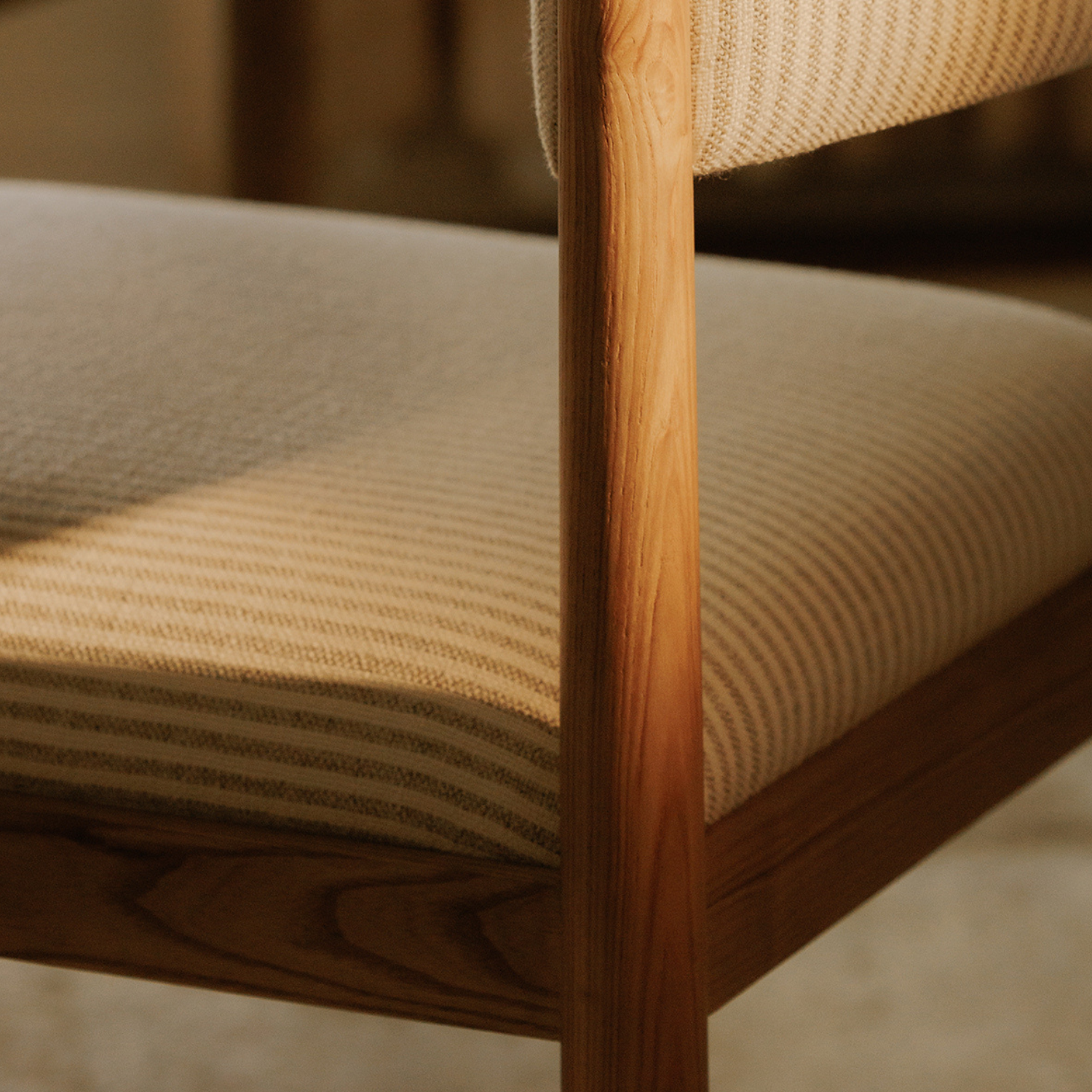 The Villetta dining chair echoes timeless allure. Showcasing classic stripes, each curve tells a story of heritage and finesse. Its warm, stained frame and whimsical finial touches draw inspiration from the vintage elegance of the '60s and '70s.