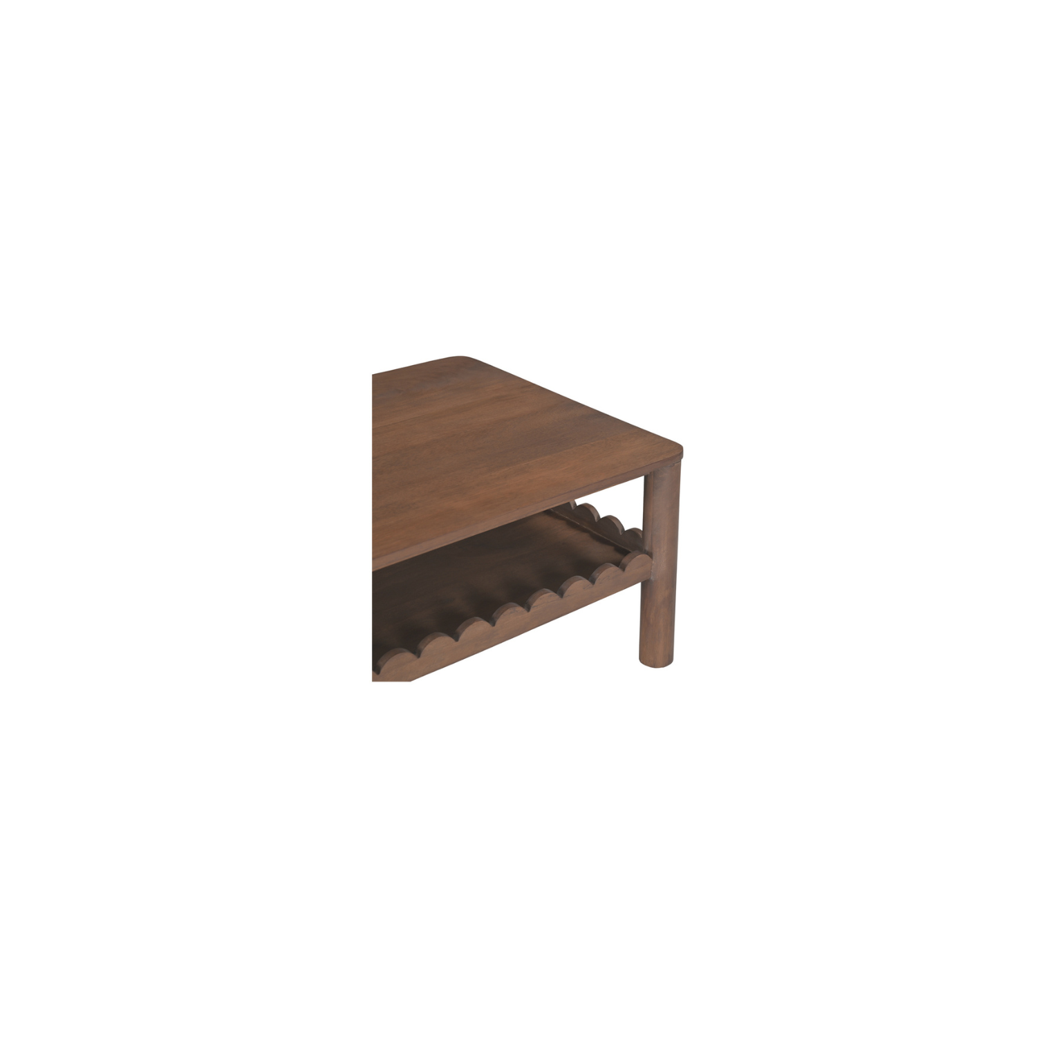 Conçue avec soin, sa forme élégante est définie par des courbes géométriques épurées qui ajoutent une touche captivante de modernité. Les pieds du poteau se dressent comme des piliers de force, ancrant la table basse avec leur présence discrète. Une vitrine de détails de bord festonnés complexes sur la face de l'étagère inférieure exposée confère un charme intemporel rappelant les influences classiques.