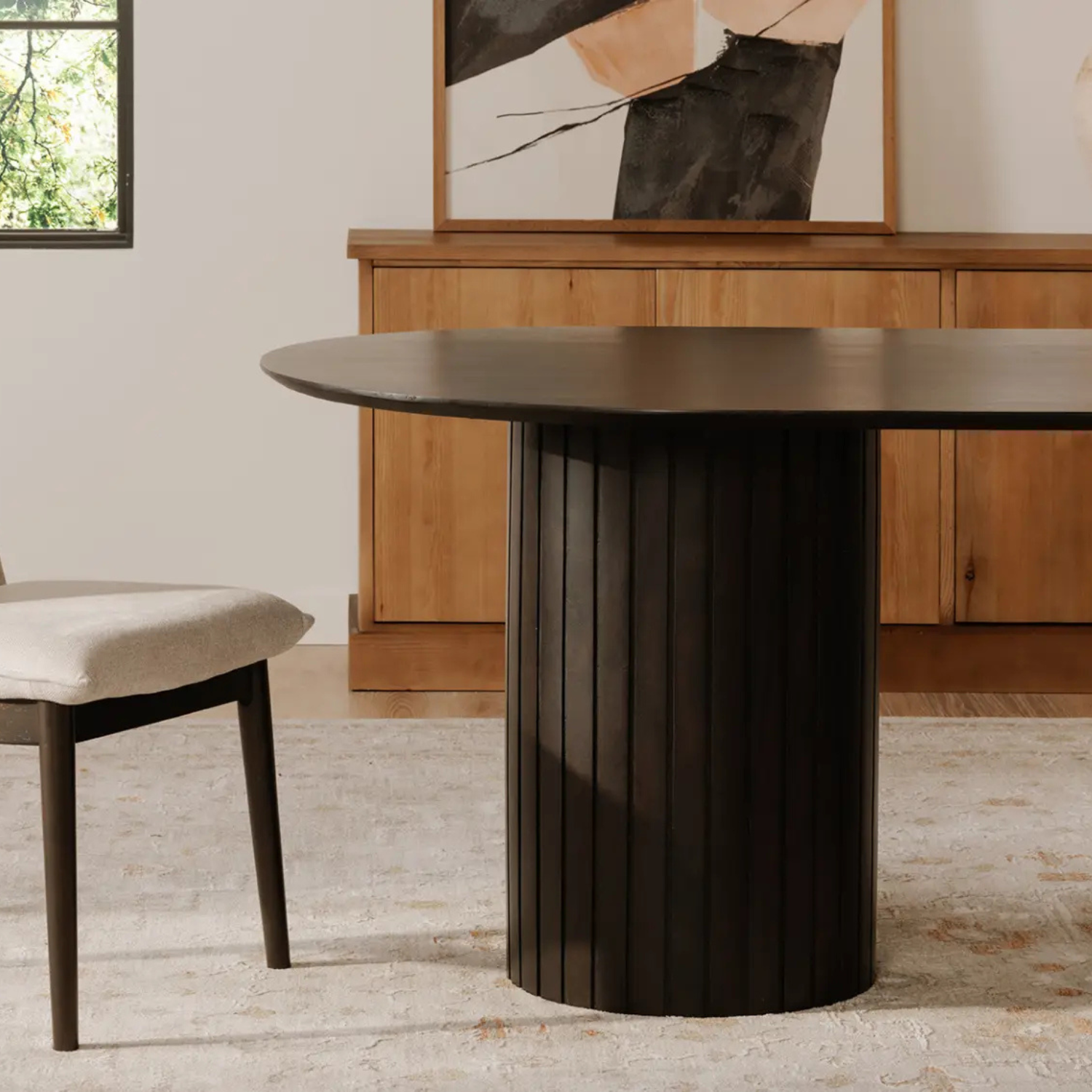 Convergence de formes et de formes, la table à manger Povera sera le pilier de votre salle à manger. Povera comporte deux grandes colonnes soutenant un plateau de table expansif, leurs nervures douces rappelant les ondulations et les vagues. Avec du bois d'acacia magnifiquement noirci, cette table de salle à manger utilise une géométrie simple et des matériaux naturels pour créer une expérience. Offrant un attrait audacieux, Povera intègre l'élégance du ratio dans votre salle à manger.