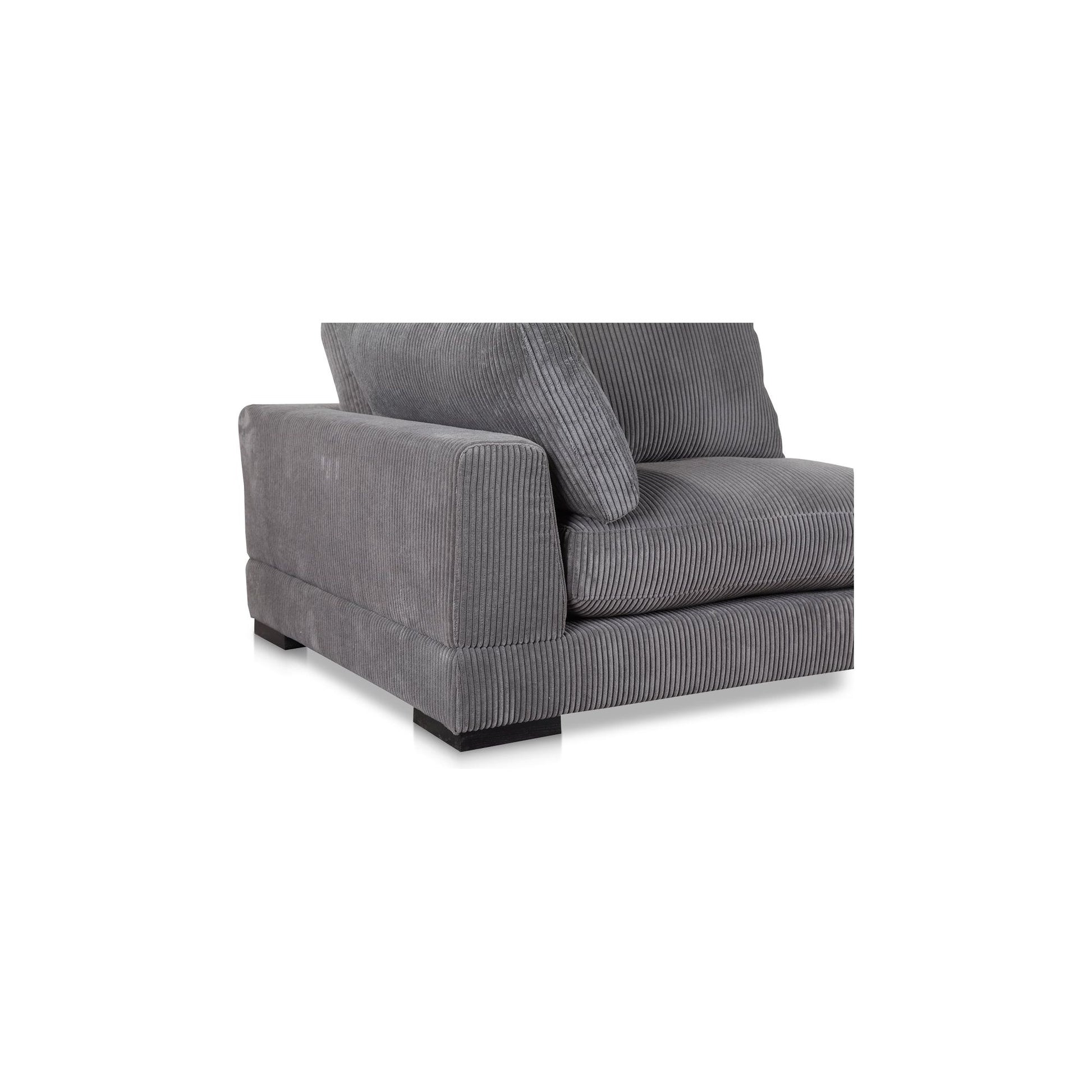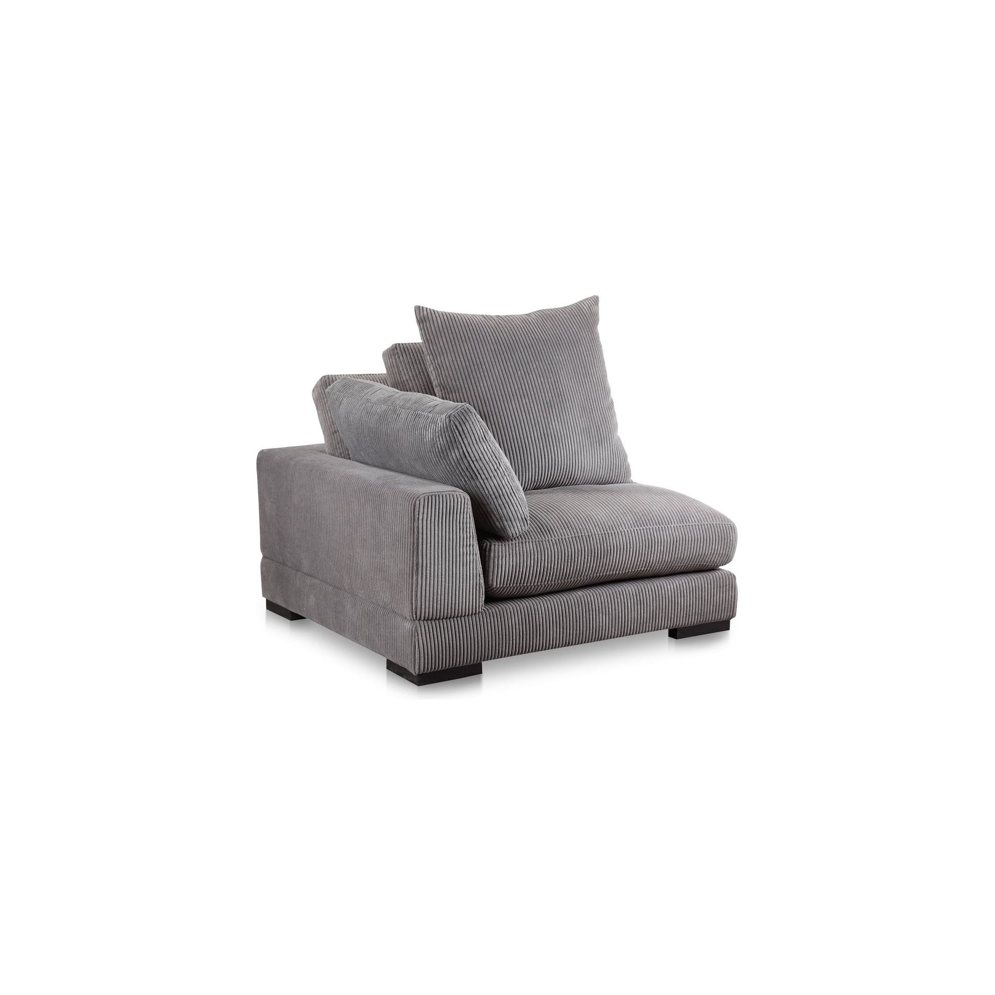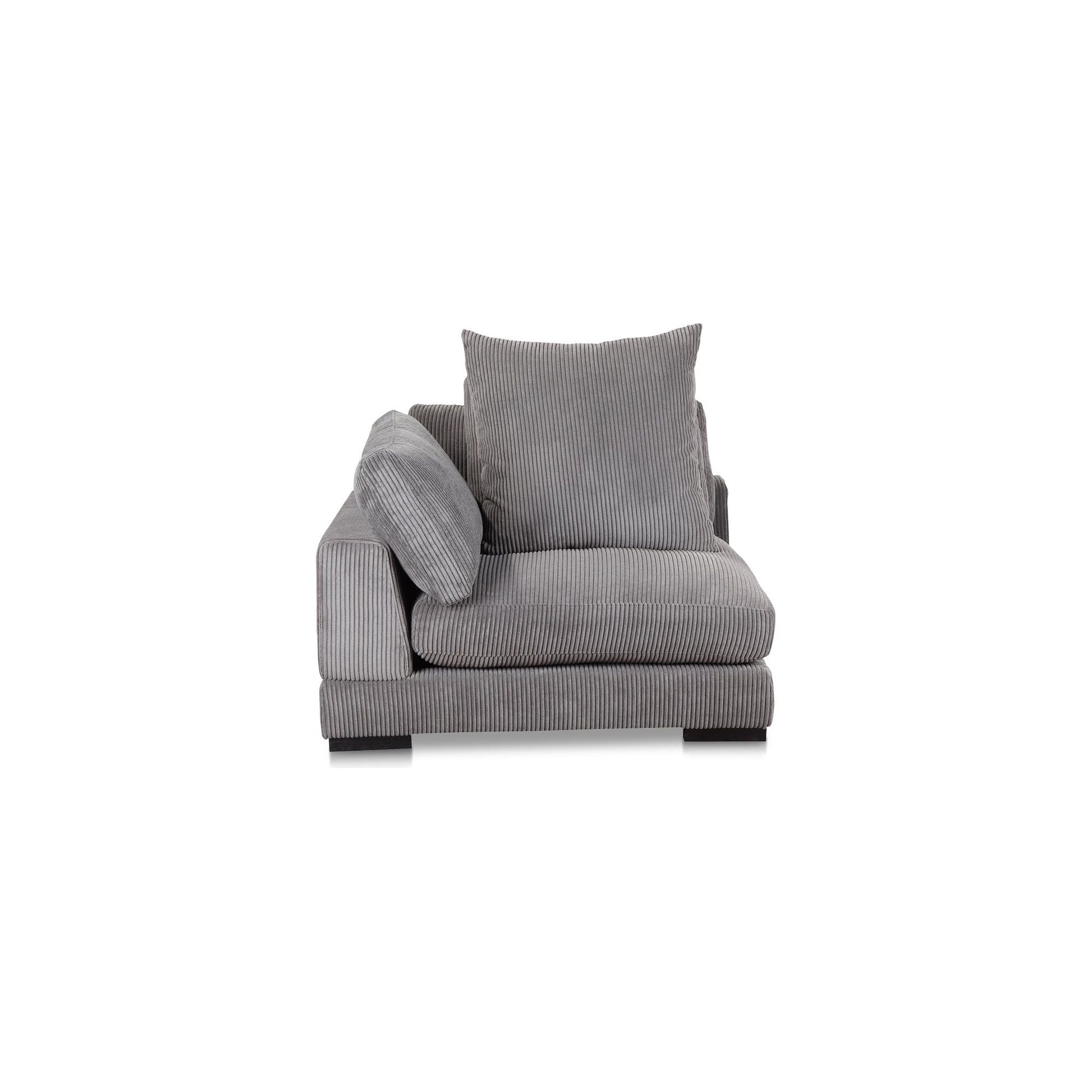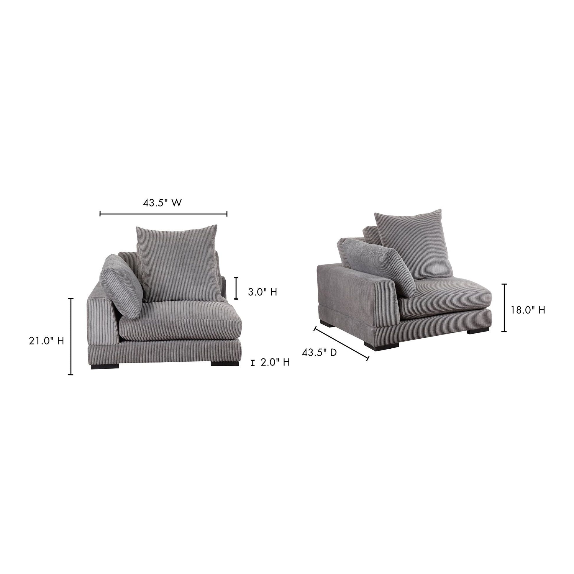 Une chaise d'angle idéale encadrée en bois d'eucalyptus massif avec des coussins de dossier supplémentaires entièrement rembourrés de duvet et amovibles. Le velours côtelé doux de cette chaise d'appoint ajoutera immédiatement de la dimension, de l'intrigue, de l'élévation et du confort à n'importe quel environnement.
