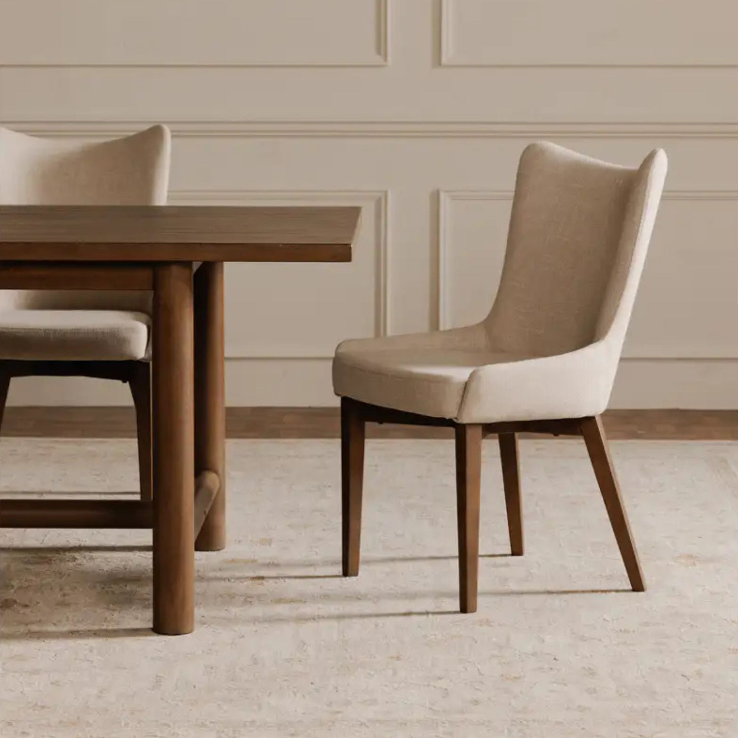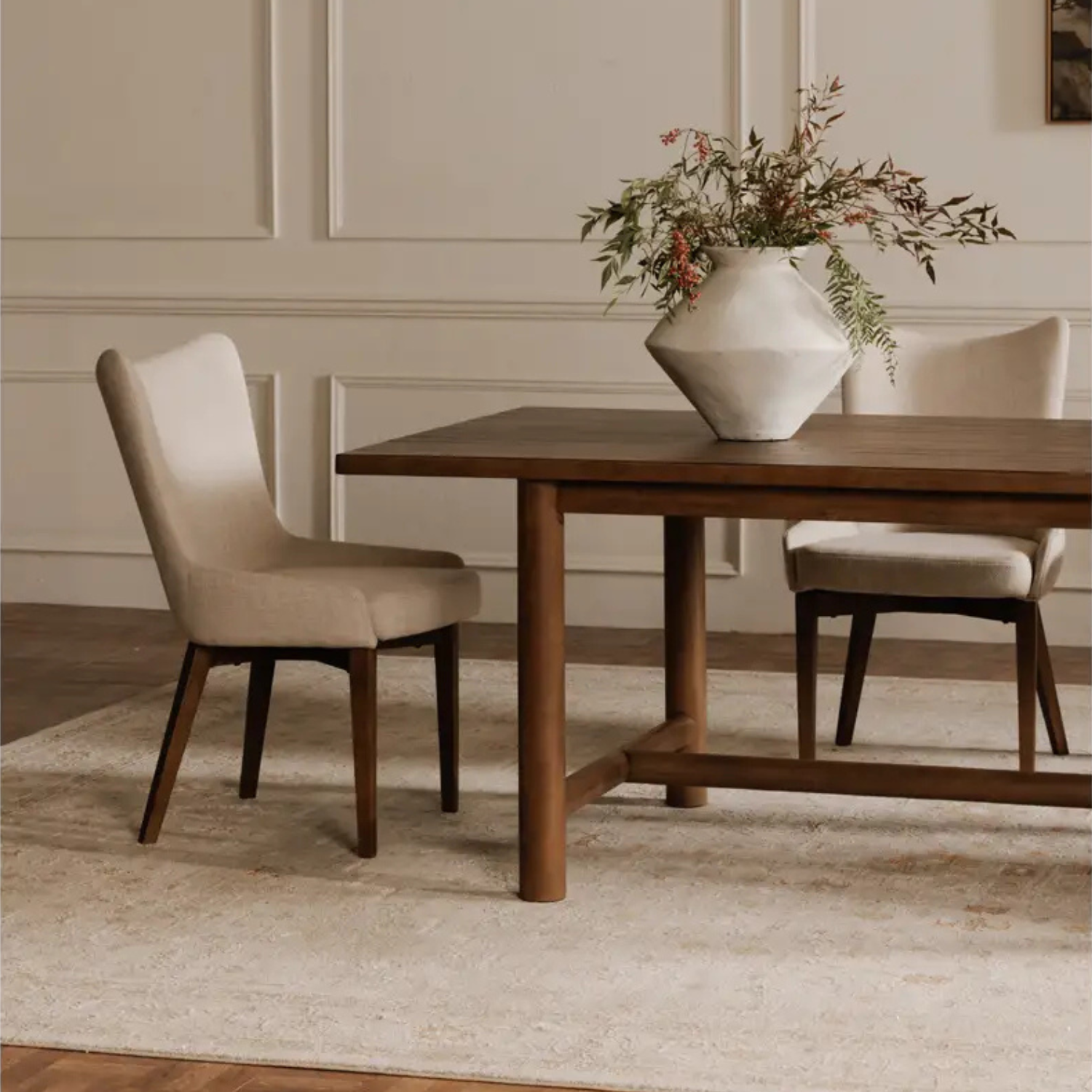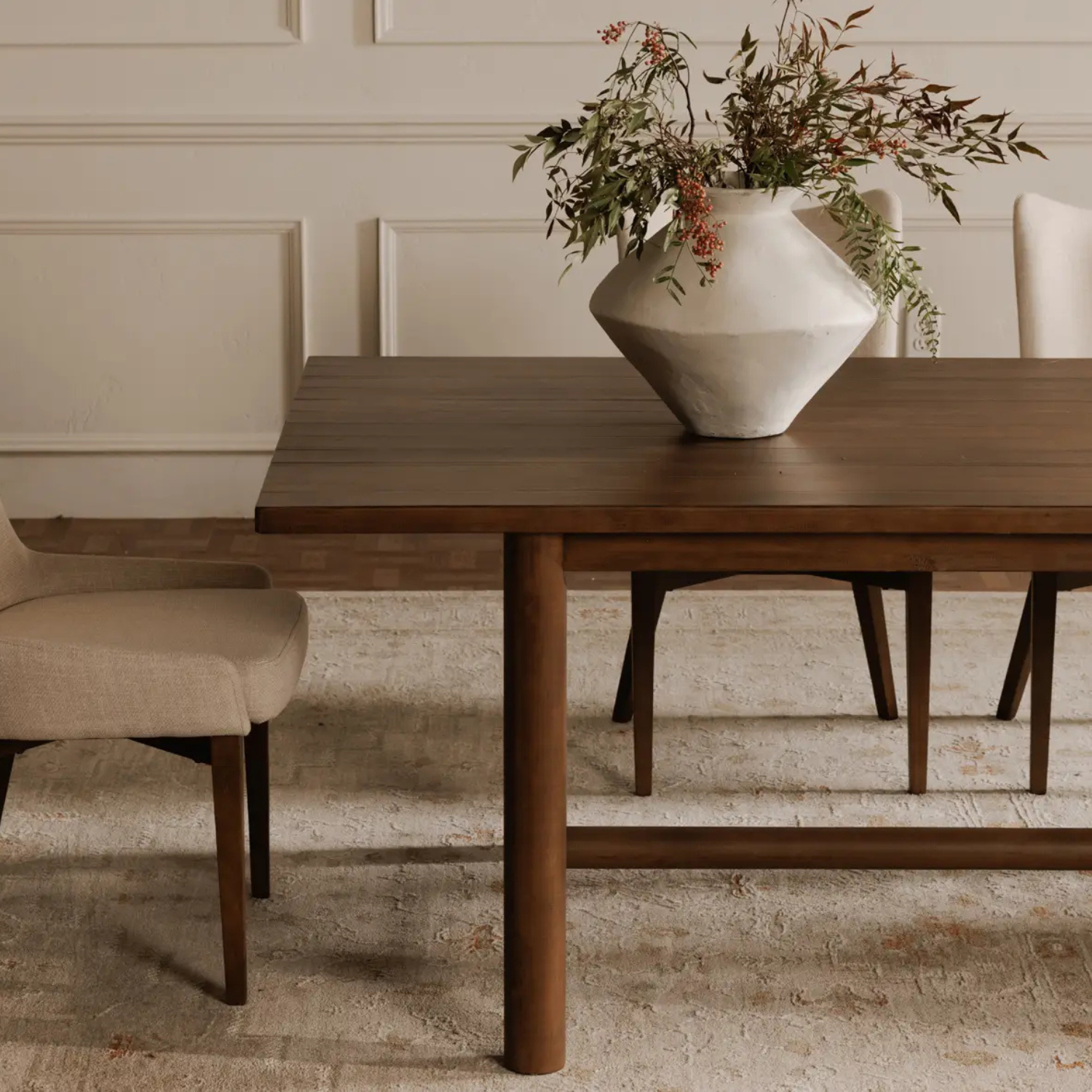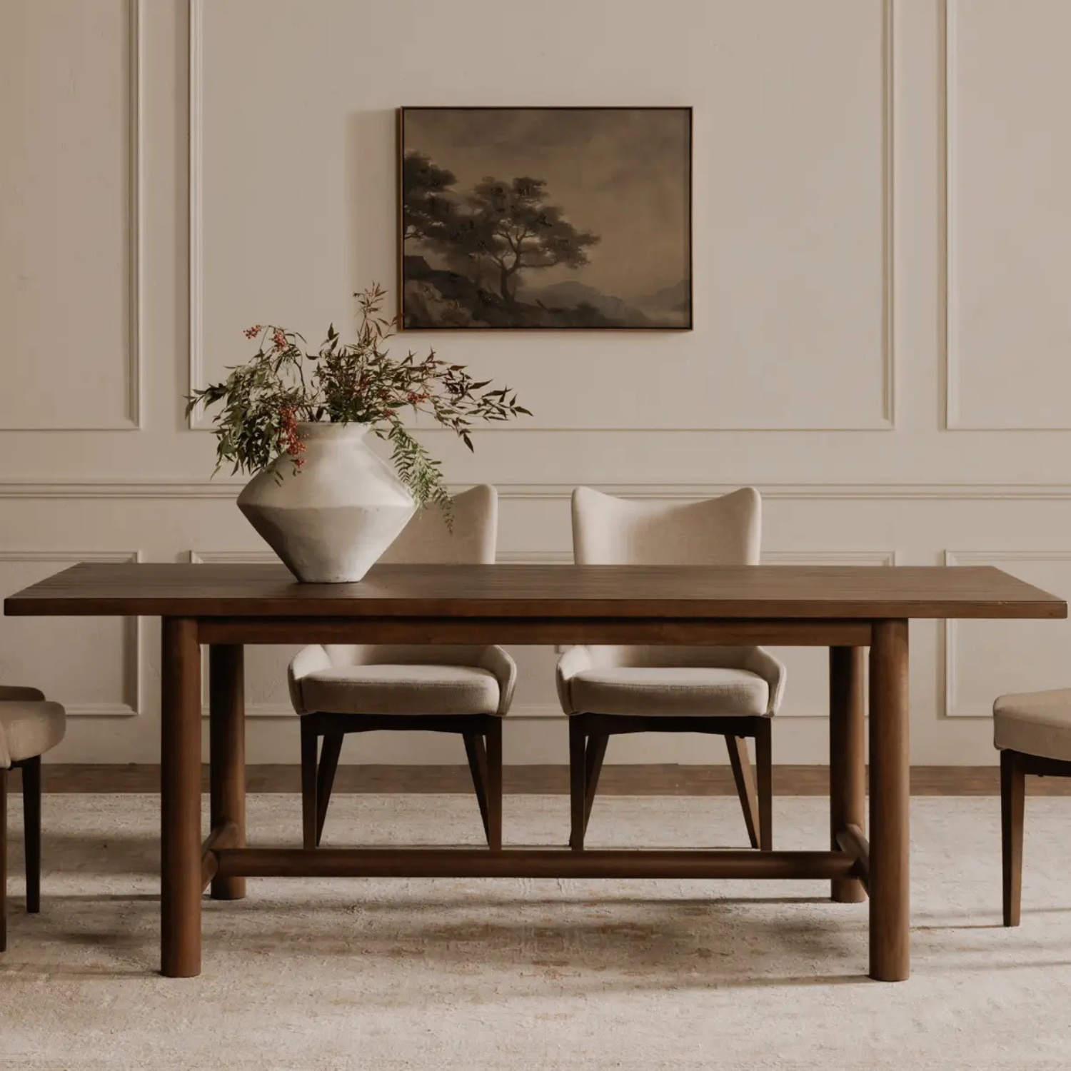 The Arden dining table's straight-edge tabletop exudes modern elegance while retaining a timeless charm. Its four cylindrical legs offer a softened silhouette juxtaposed with the table's clean lines and visual lightness. Stretcher bars infuse a touch of rustic appeal with its pine construction's rich, dark brown finish.