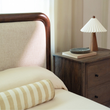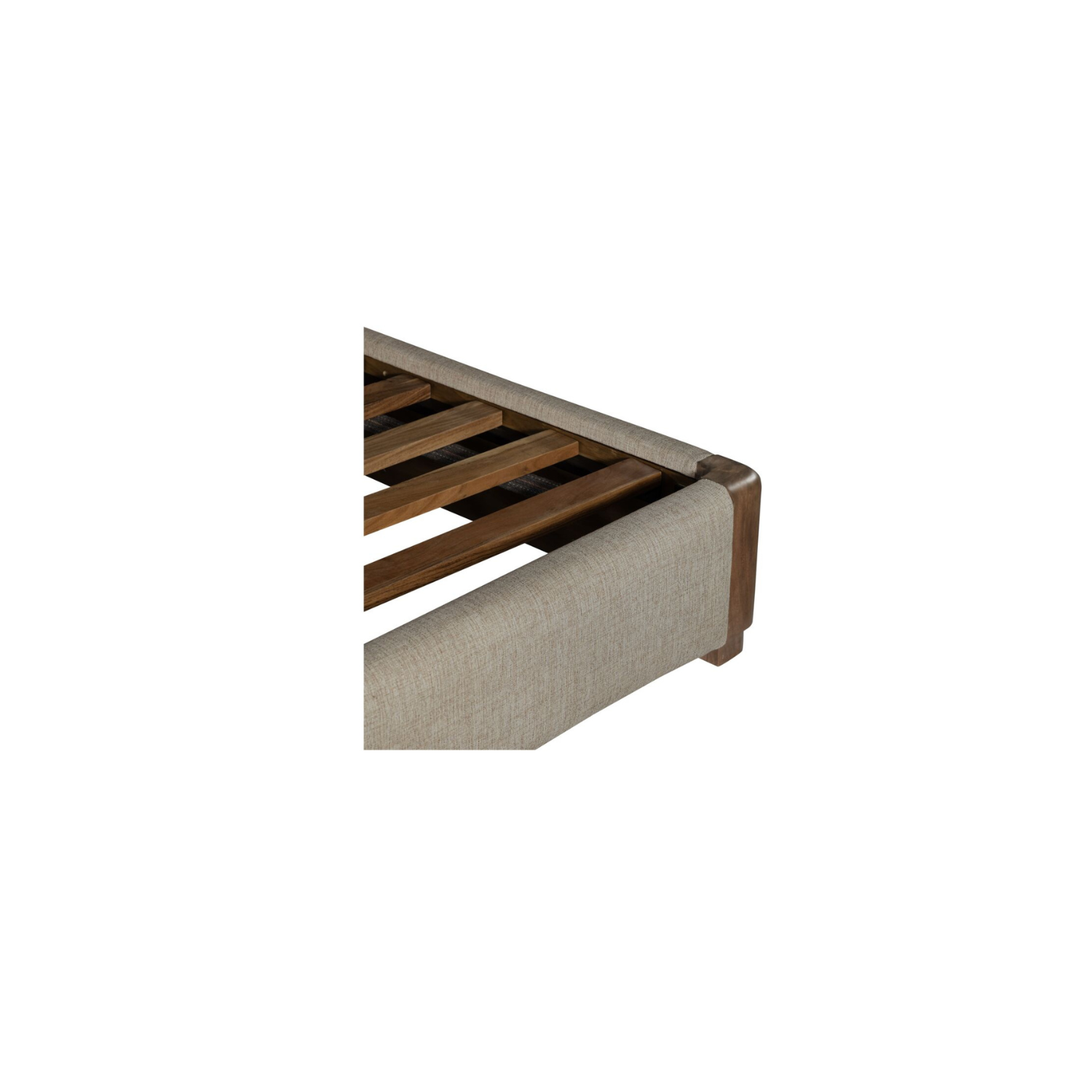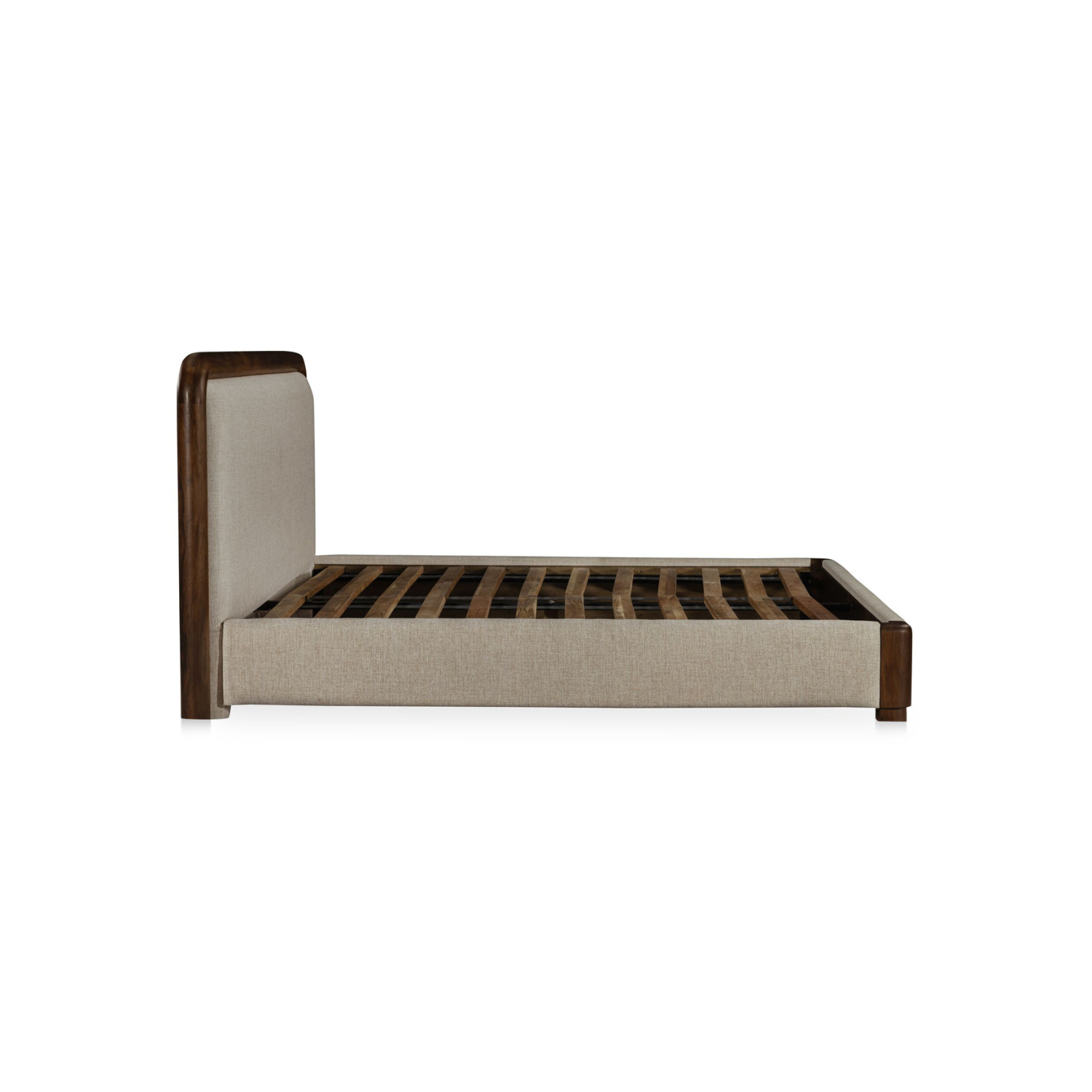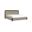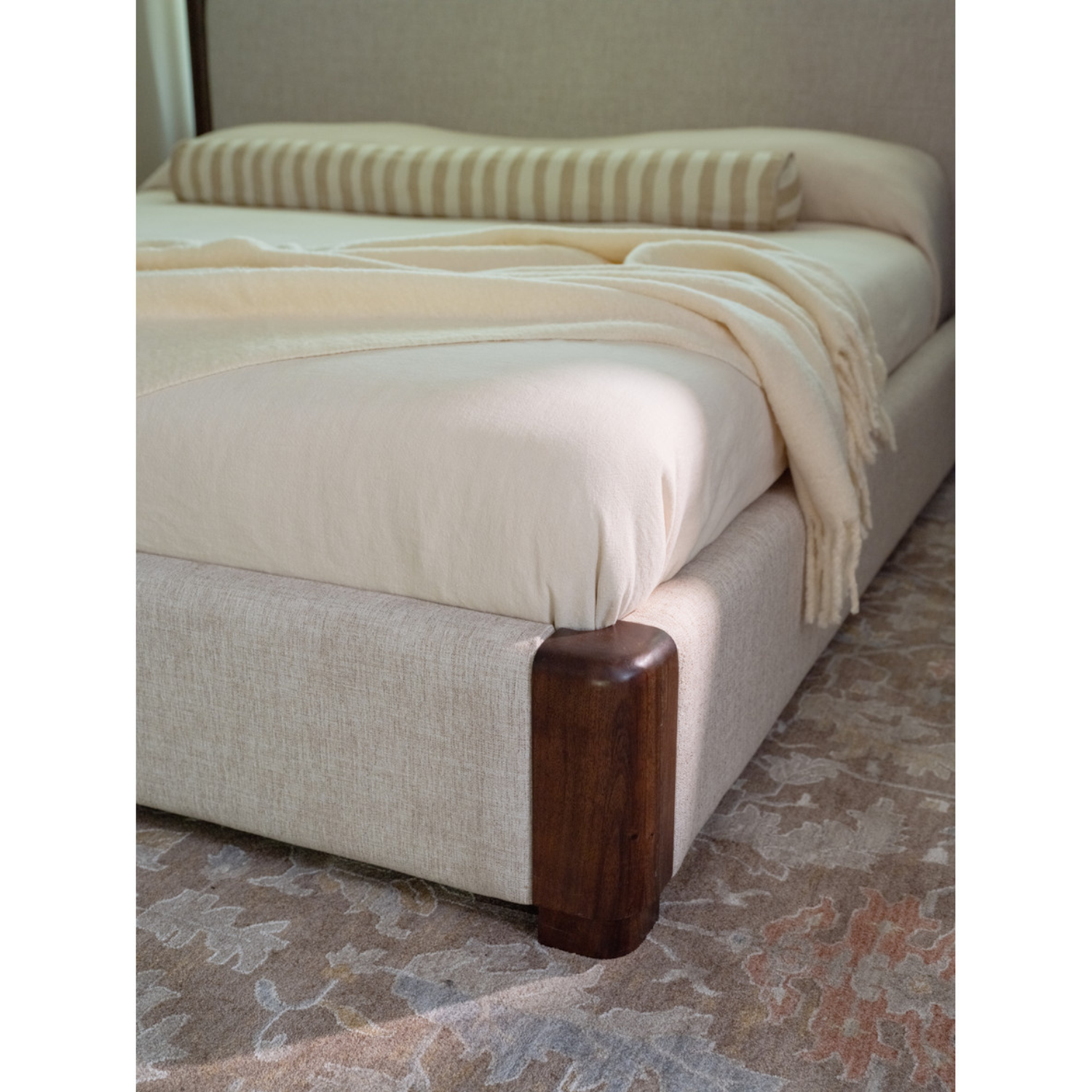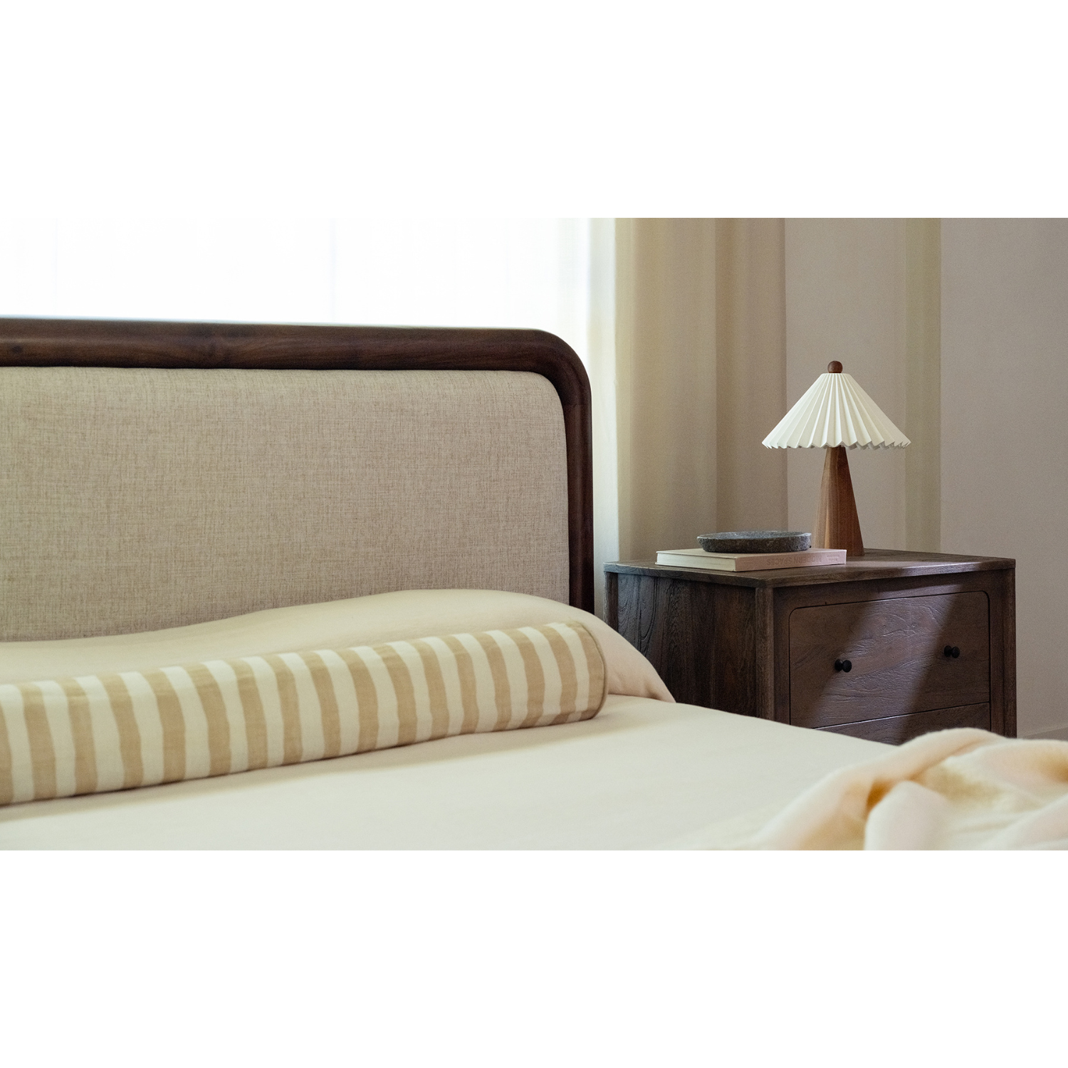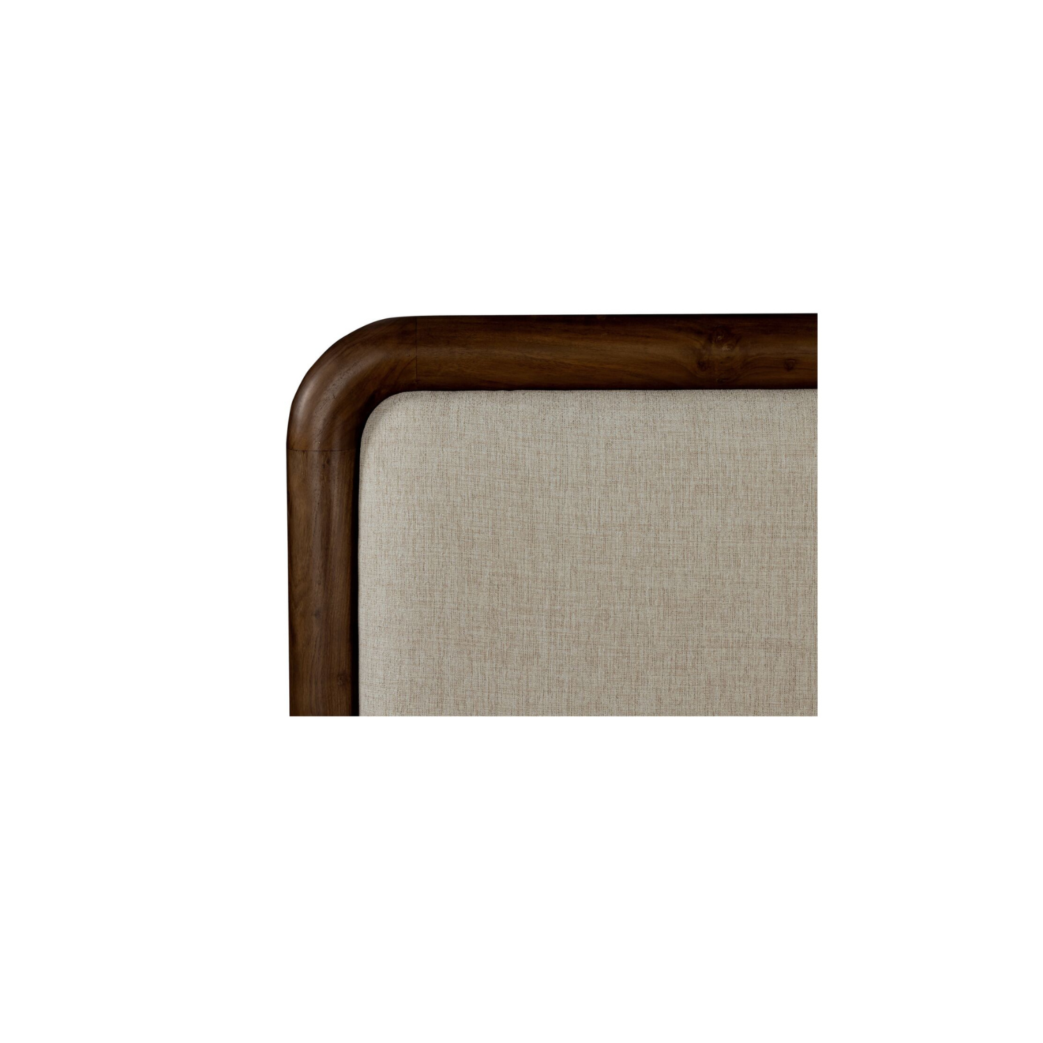 Soft shape. Strong statement. Bower balances sculptural lines with tailored comfort. A cylindrical Acacia wood frame wraps its linen-blend headboard, with wood corner details that add structure and visual weight. The silhouette is generous and grounded—designed to anchor the room with ease. With its warm materials and refined form, this bed holds its space with quiet confidence and lasting style.