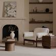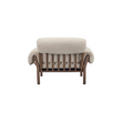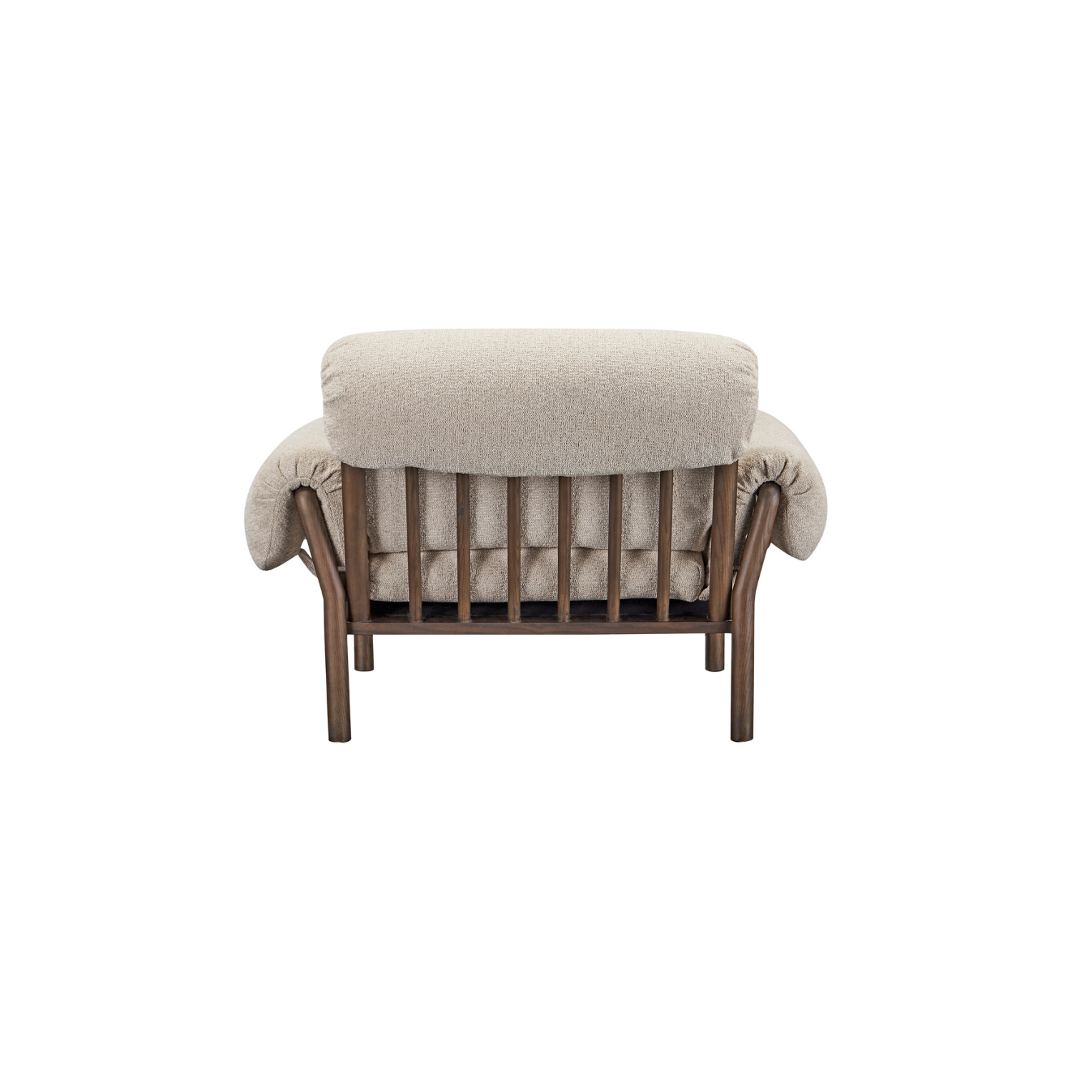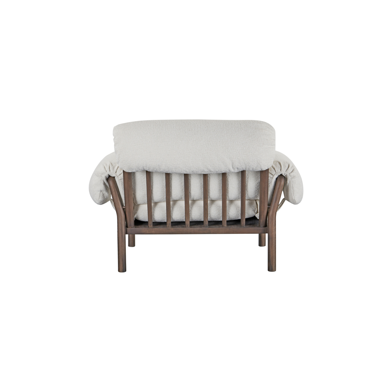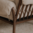 The Cardero lounge chair's solid ash frame, stained to a rich dark finish, showcases nature's artistry through intricate grain patterns. Timeless spindle back and flared wooden arms complement the generously proportioned seat and feather and fiber fill, inviting serene relaxation. Fold-over details with ruche texturing and tie detail add a touch of casual sophistication.