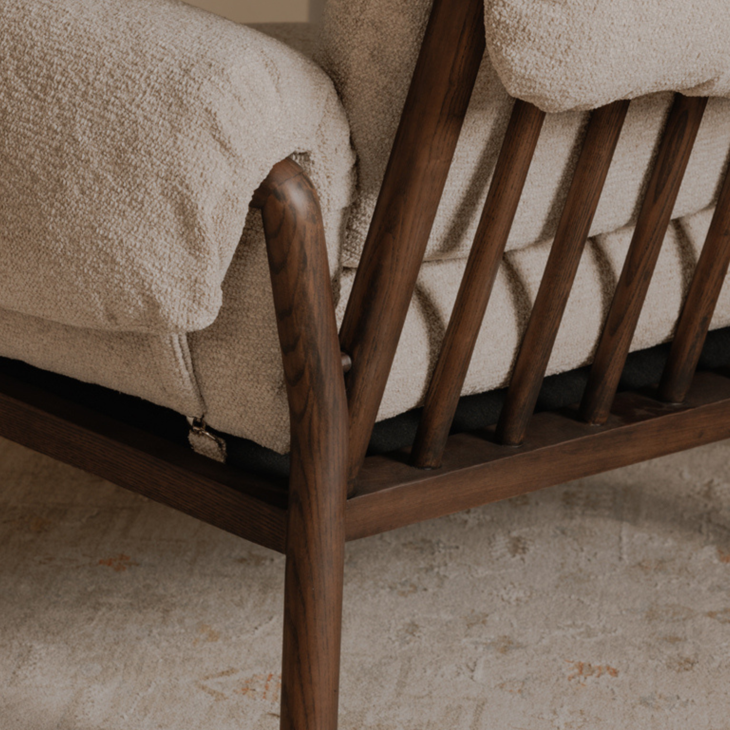 - Dark stained wooden frame with spindle back detail & slightly flared arm with fold-over cushion detailing