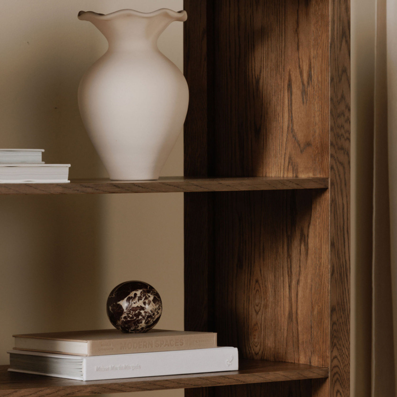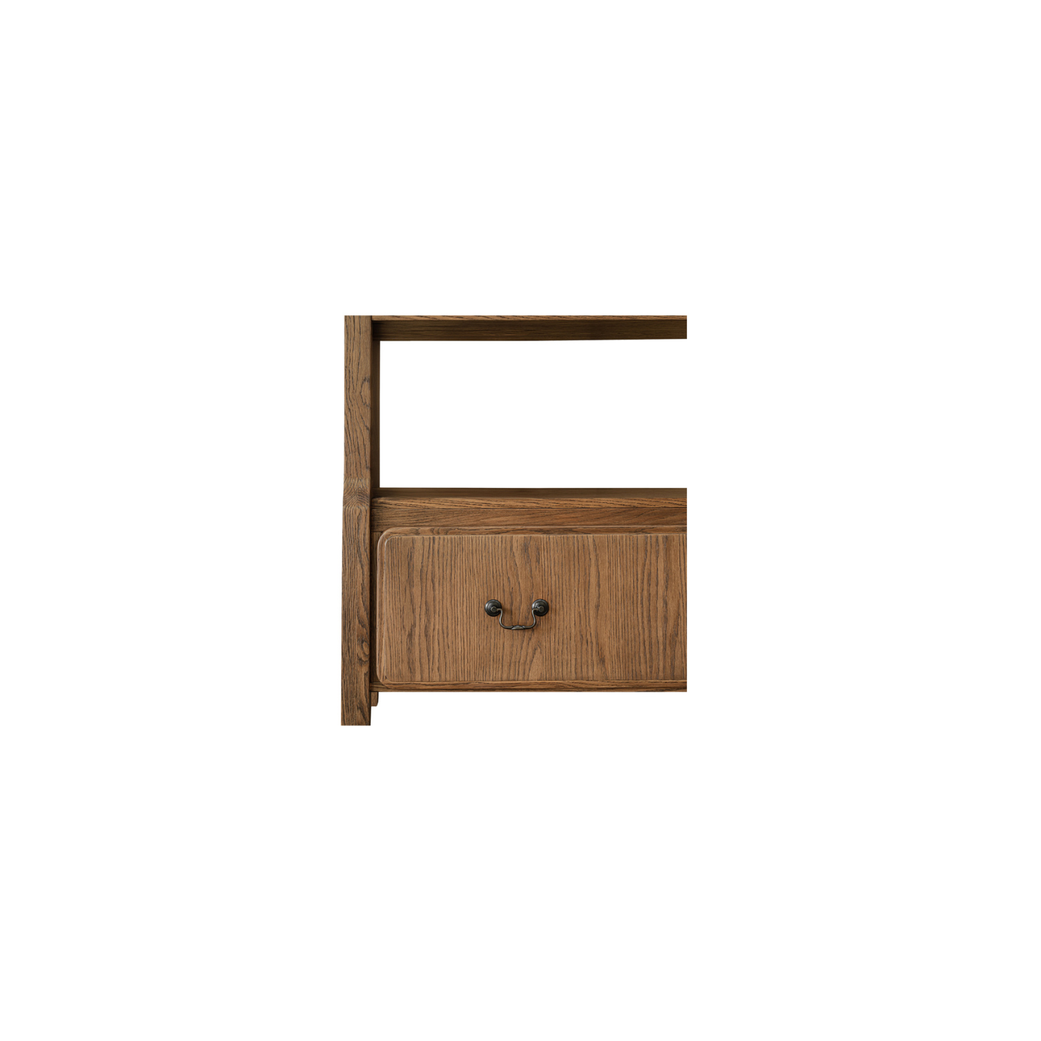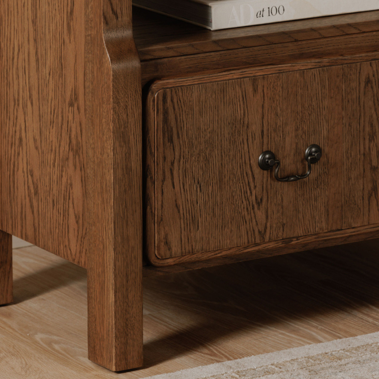 The Caroline bookcase features an overhanging top and curved front legs that soften its silhouette. Rounded edges on the bottom drawer echo the leg curvature, adding fluidity and grace.