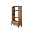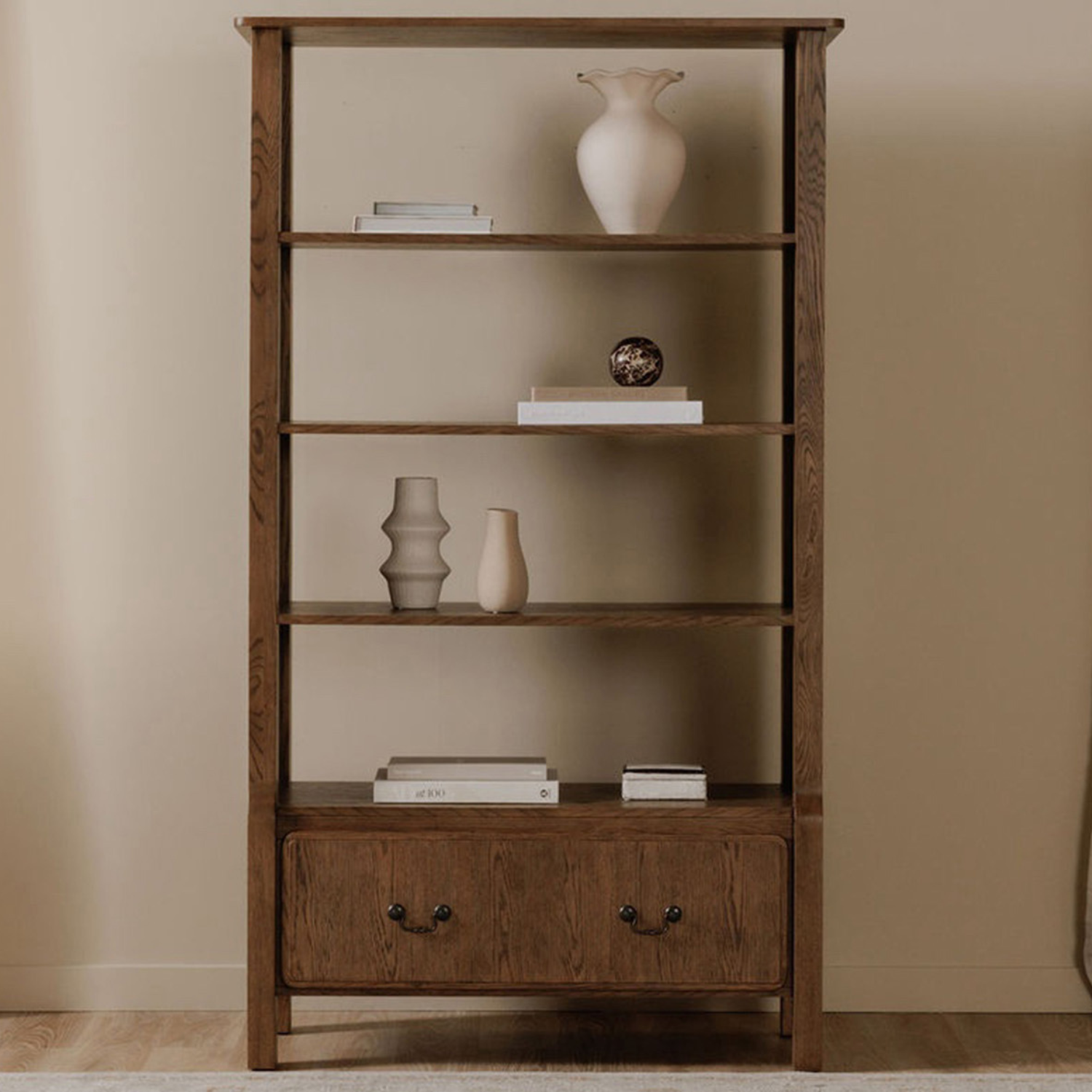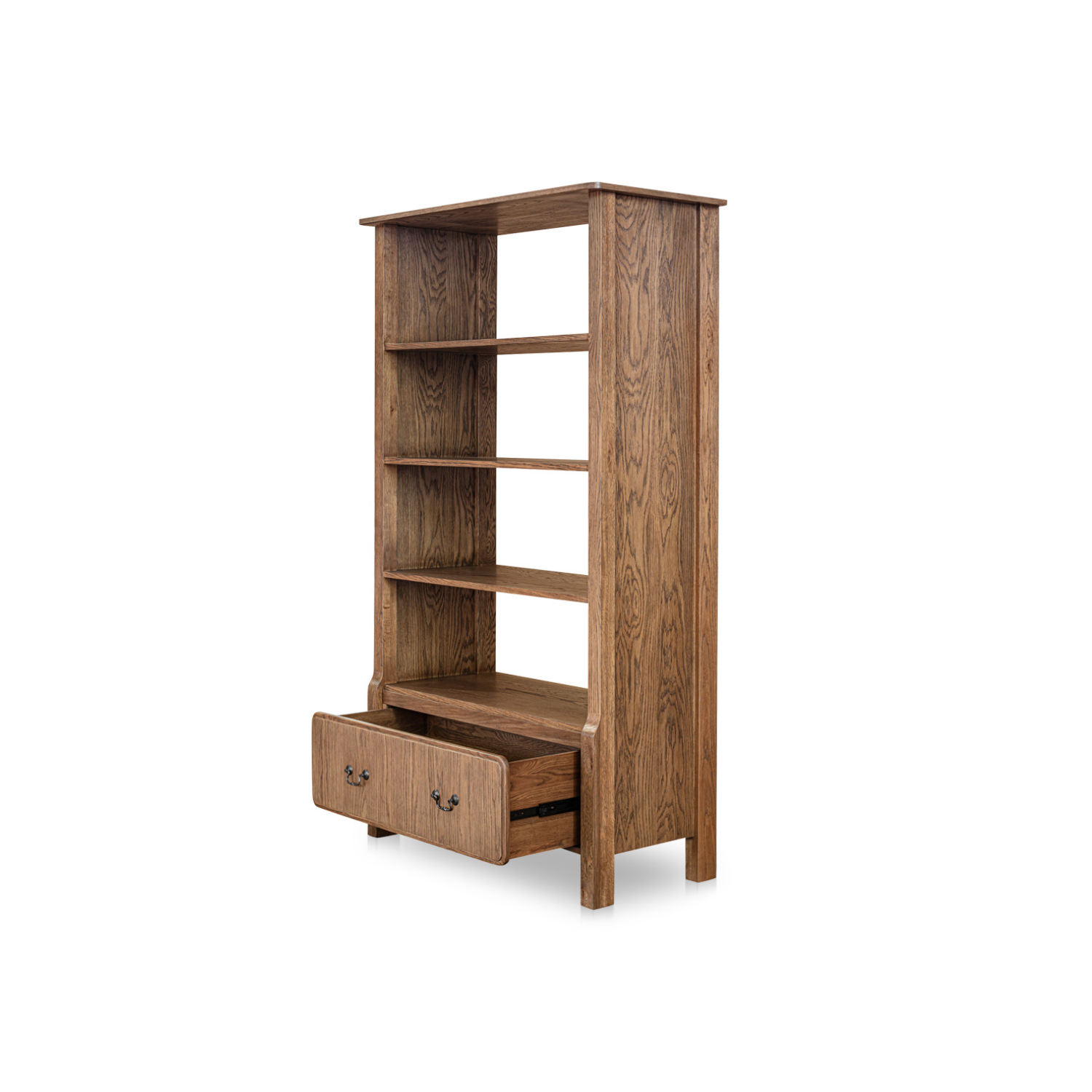 This piece features four fixed shelves and a bottom drawer for ample storage and is finished in a mid-tone brown with a wire-brushed texture.