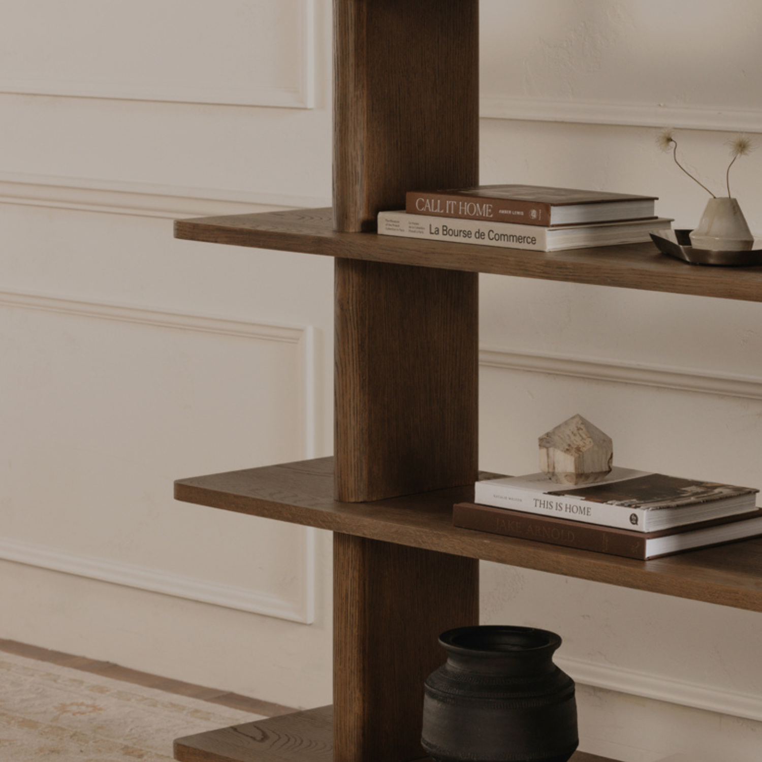 The Casey bookcase embodies contemporary elegance, marrying form and function with understated sophistication. A vertical support with a bullnose edge softens the silhouette, introducing an organic feel to the rectangular shelving.