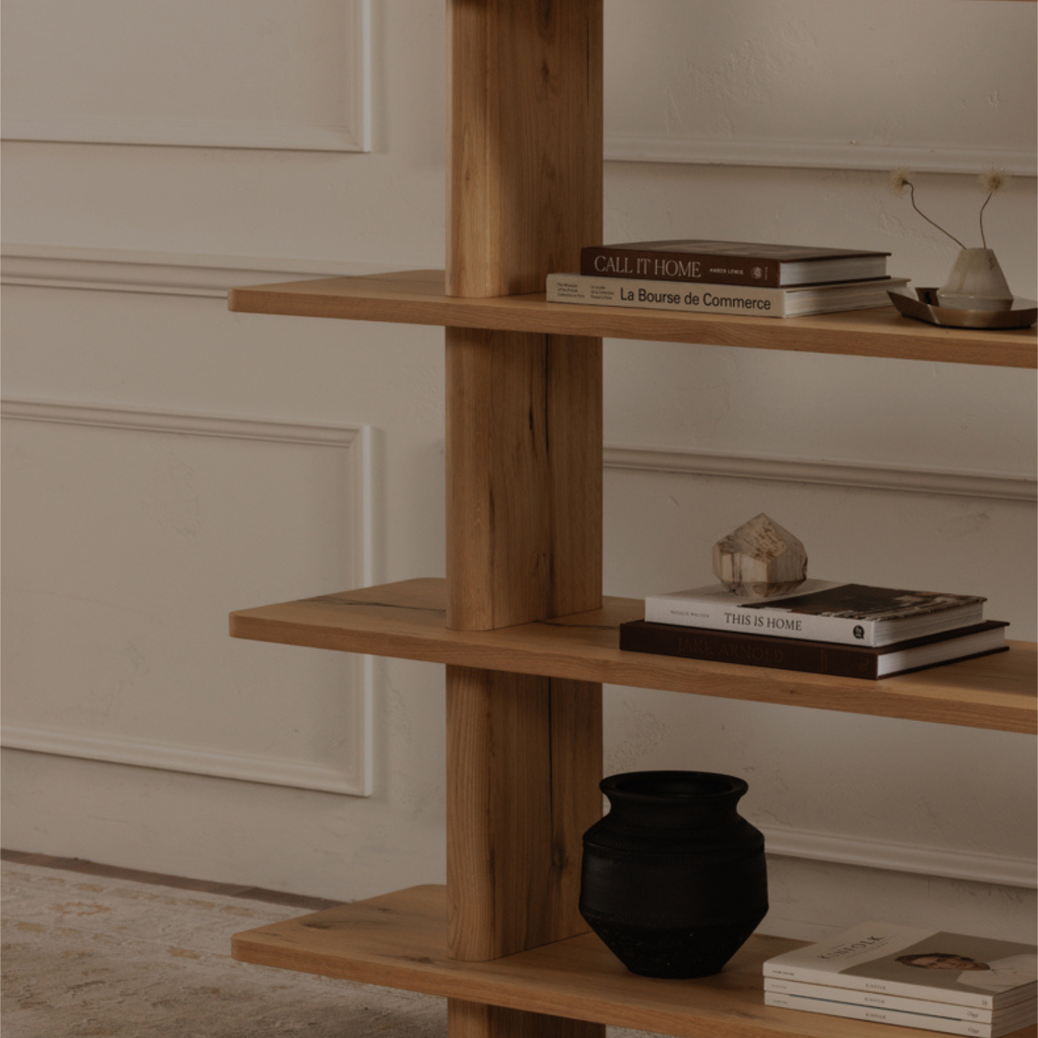 The Casey bookcase embodies contemporary elegance, marrying form and function with understated sophistication. A vertical support with a bullnose edge softens the silhouette, introducing an organic feel to the rectangular shelving.