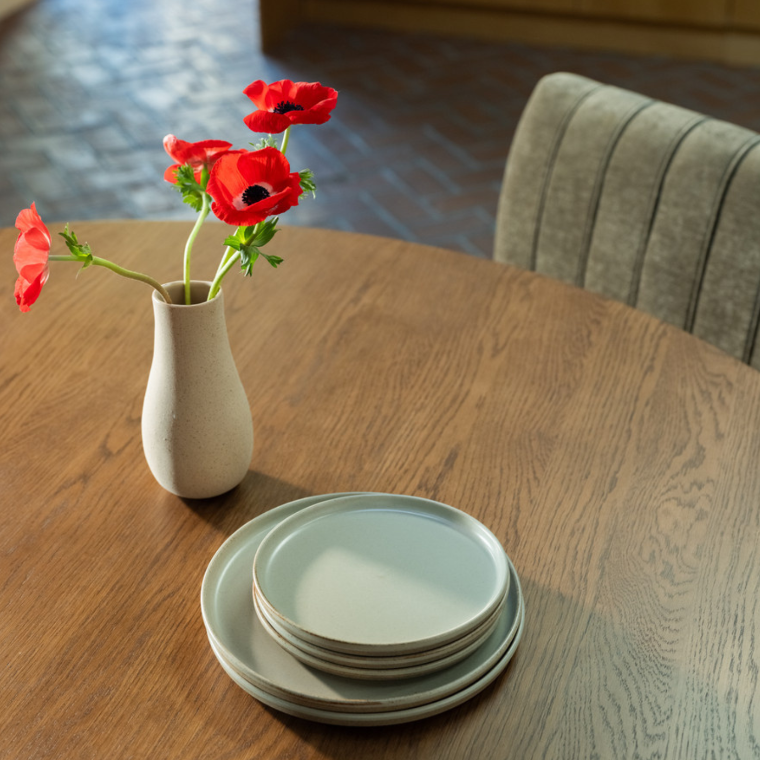 Curves with a sense of direction. Clayton finds its form in motion, drawing from spinning tops and stacked dishware.