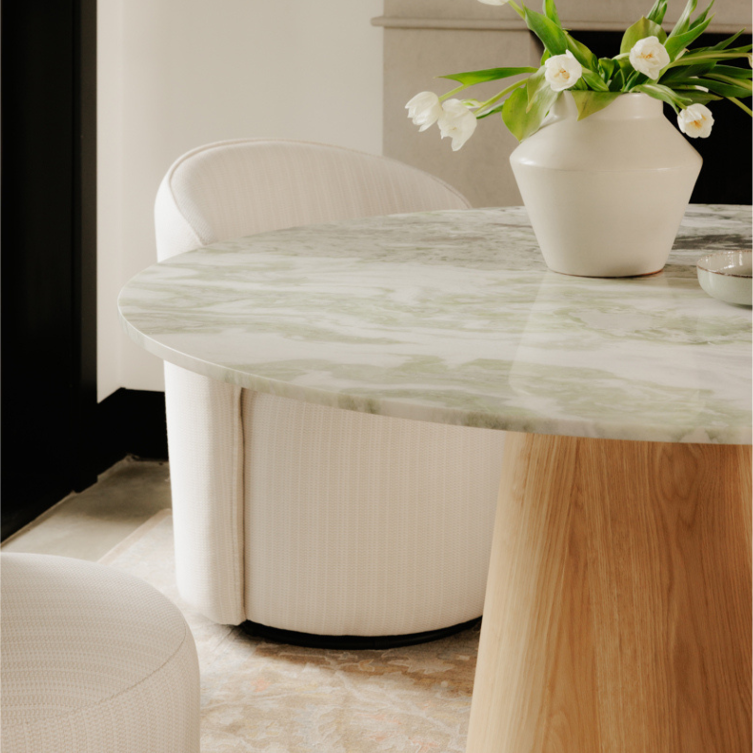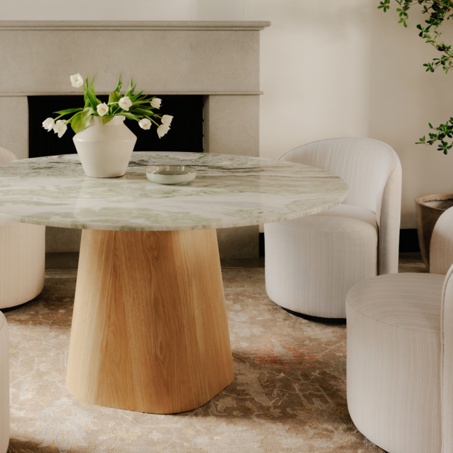 With five connected sides equipped with softened, rounded edges, the base assumes an organic appearance, its natural color subtly softening the marble top for enduring visual appeal.