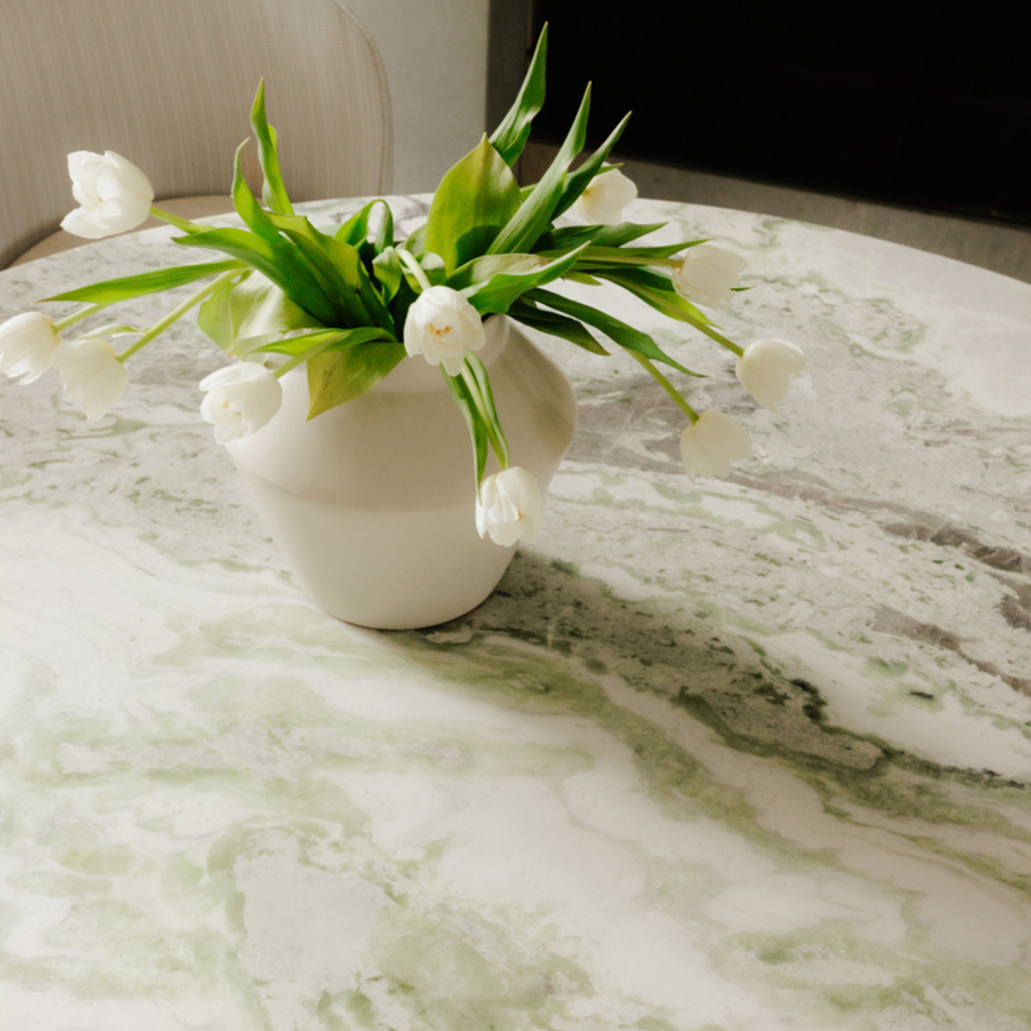 The Evelyn coffee table is a harmonious contrast of materiality and tactility, where a weighty base meets a green onyx marble top.