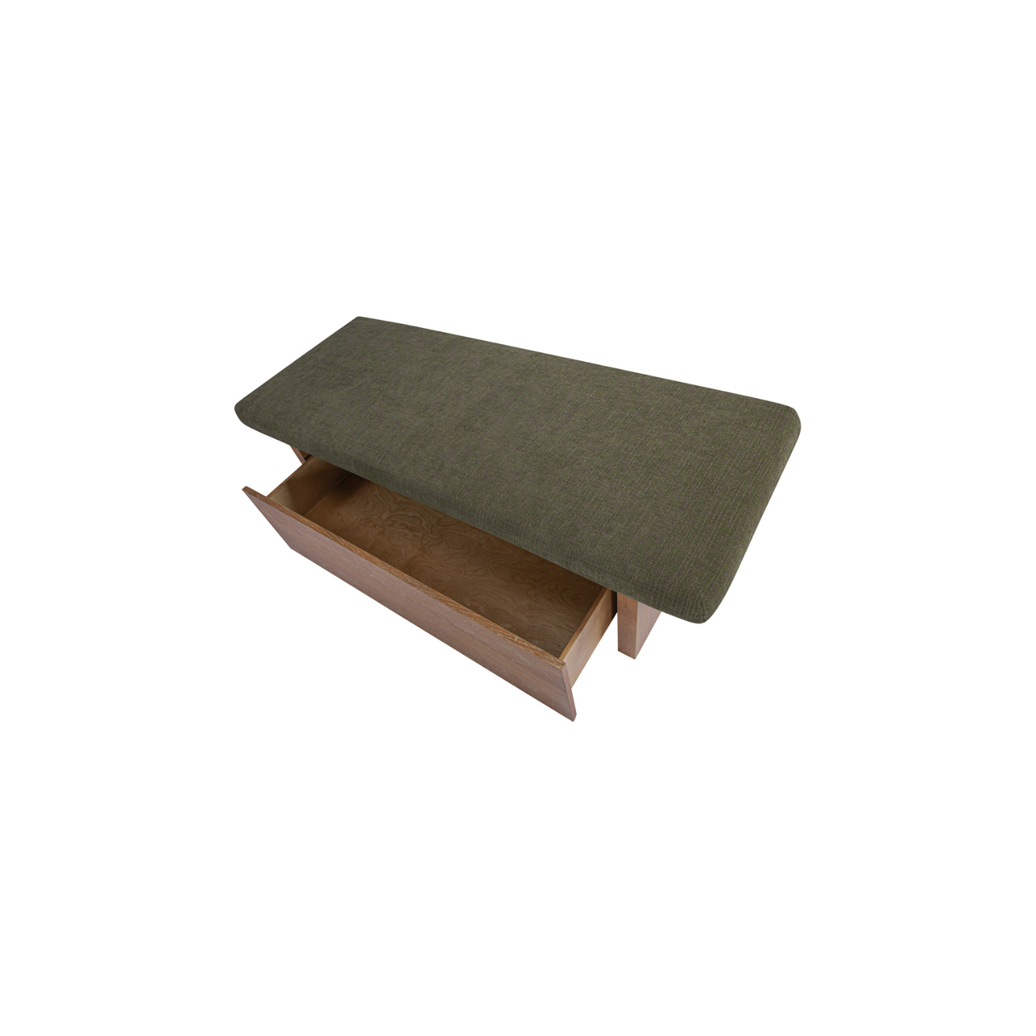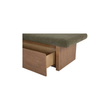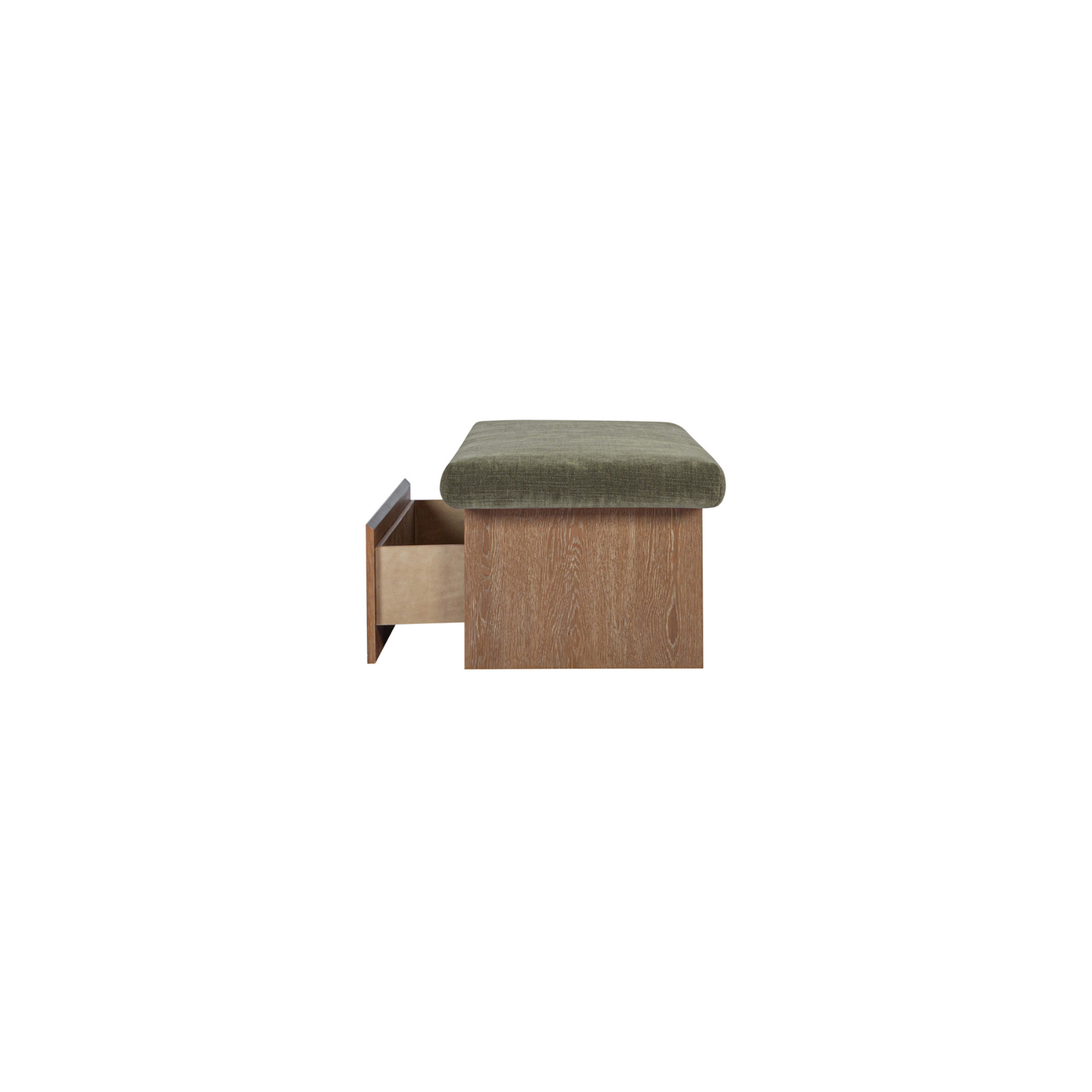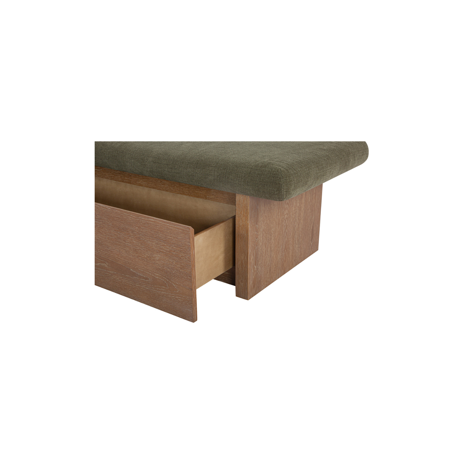 Its generous, deep-seated top is wrapped in a soft, muted chenille, that effortlessly transitions the bench from entryway statement to sophisticated coffee table or seating at the foot of a bed. The recessed wooden base invites functional repose as a sleek wire-brushed drawer offers ample storage.