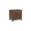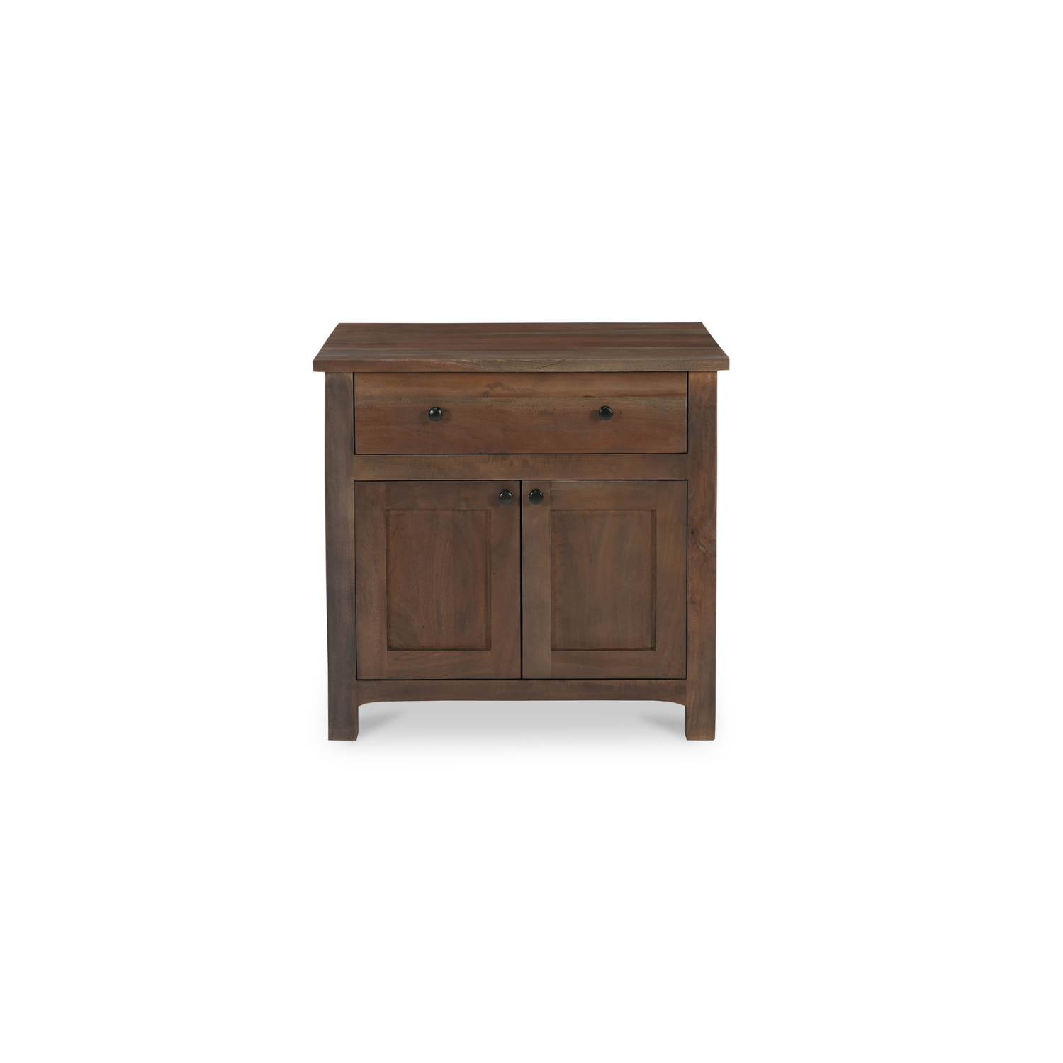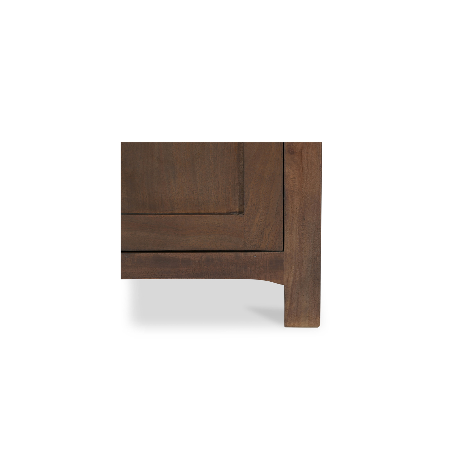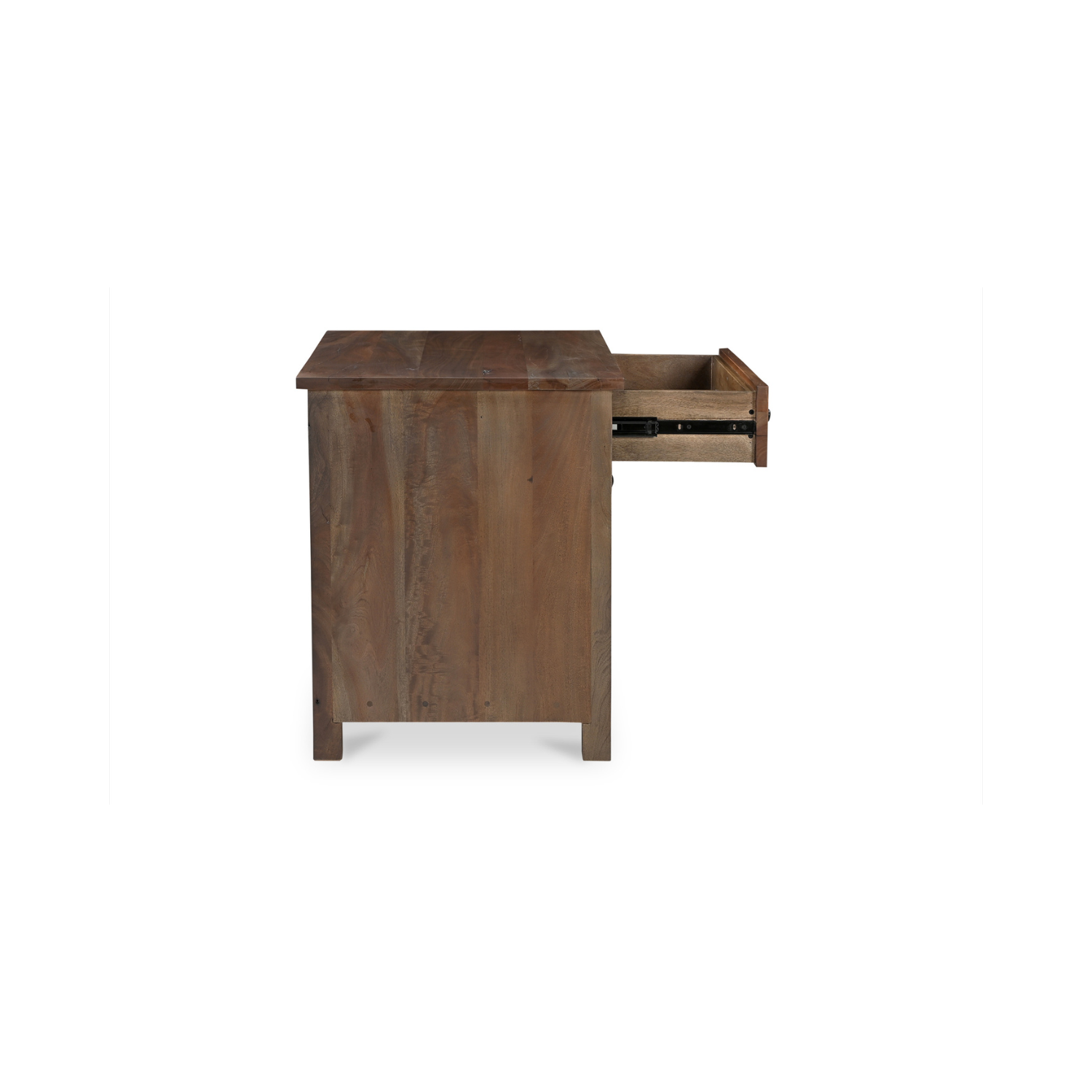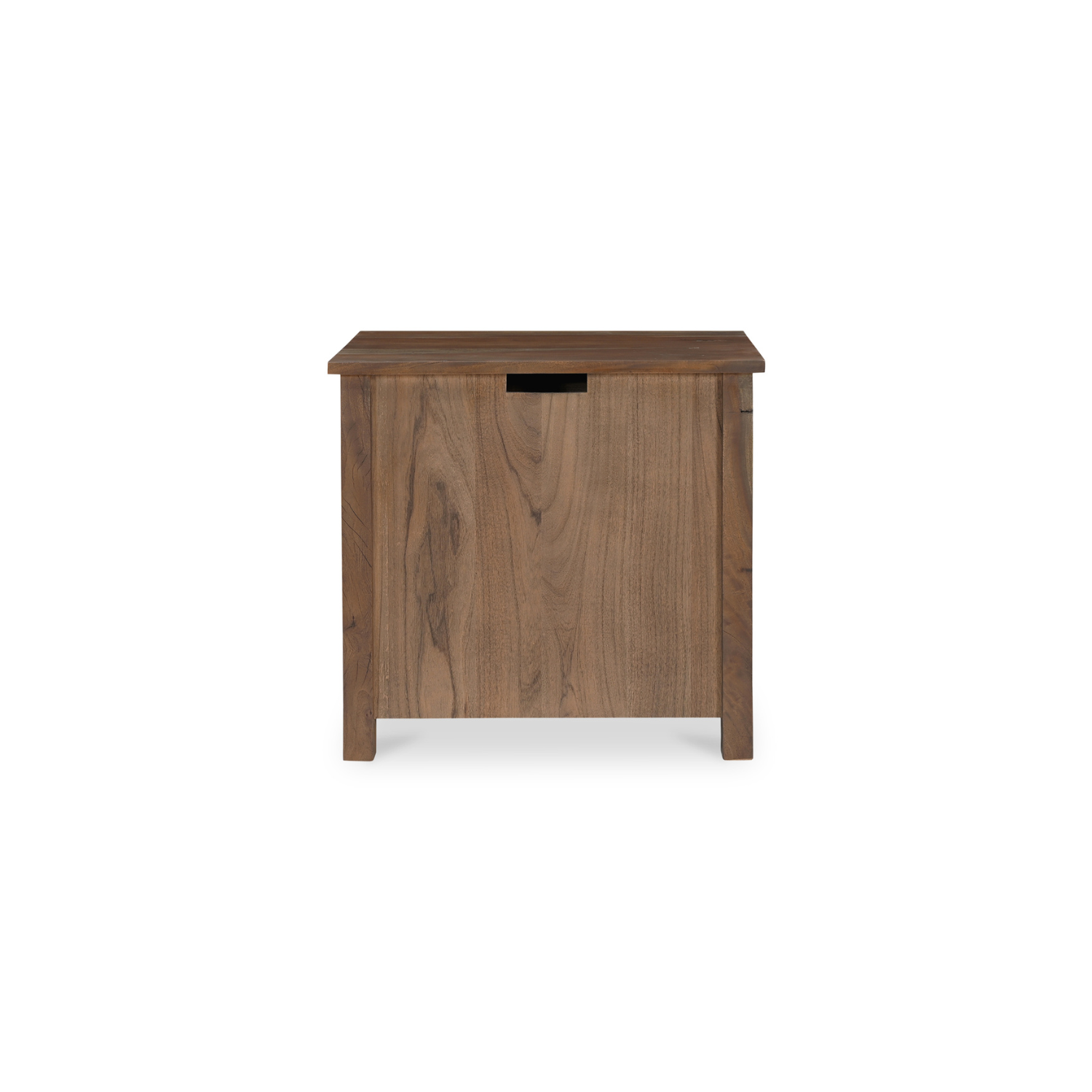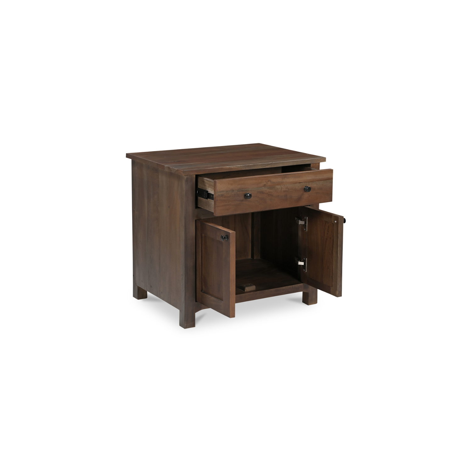 Finished in a rich dark brown, this reclaimed neem wood Gene charging nightstand offers a harmonious blend of form and function, merging modern technology with timeless elegance. Two doors reveal open shelving, while a soft-close drawer provides discreet storage.