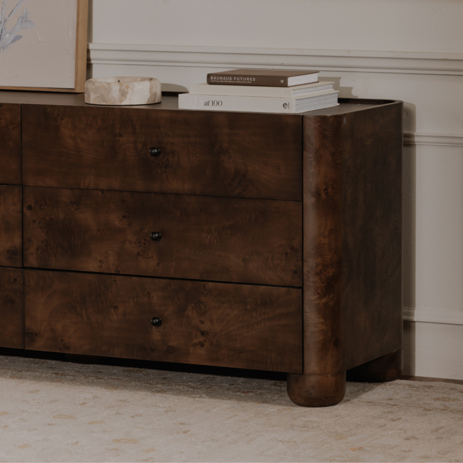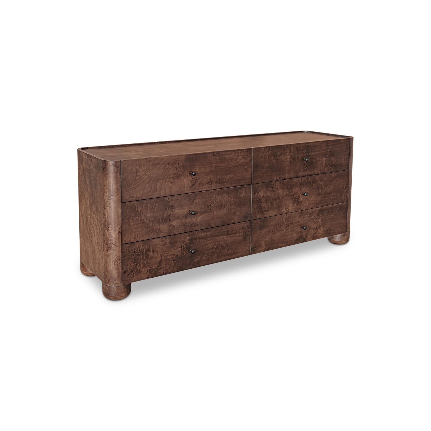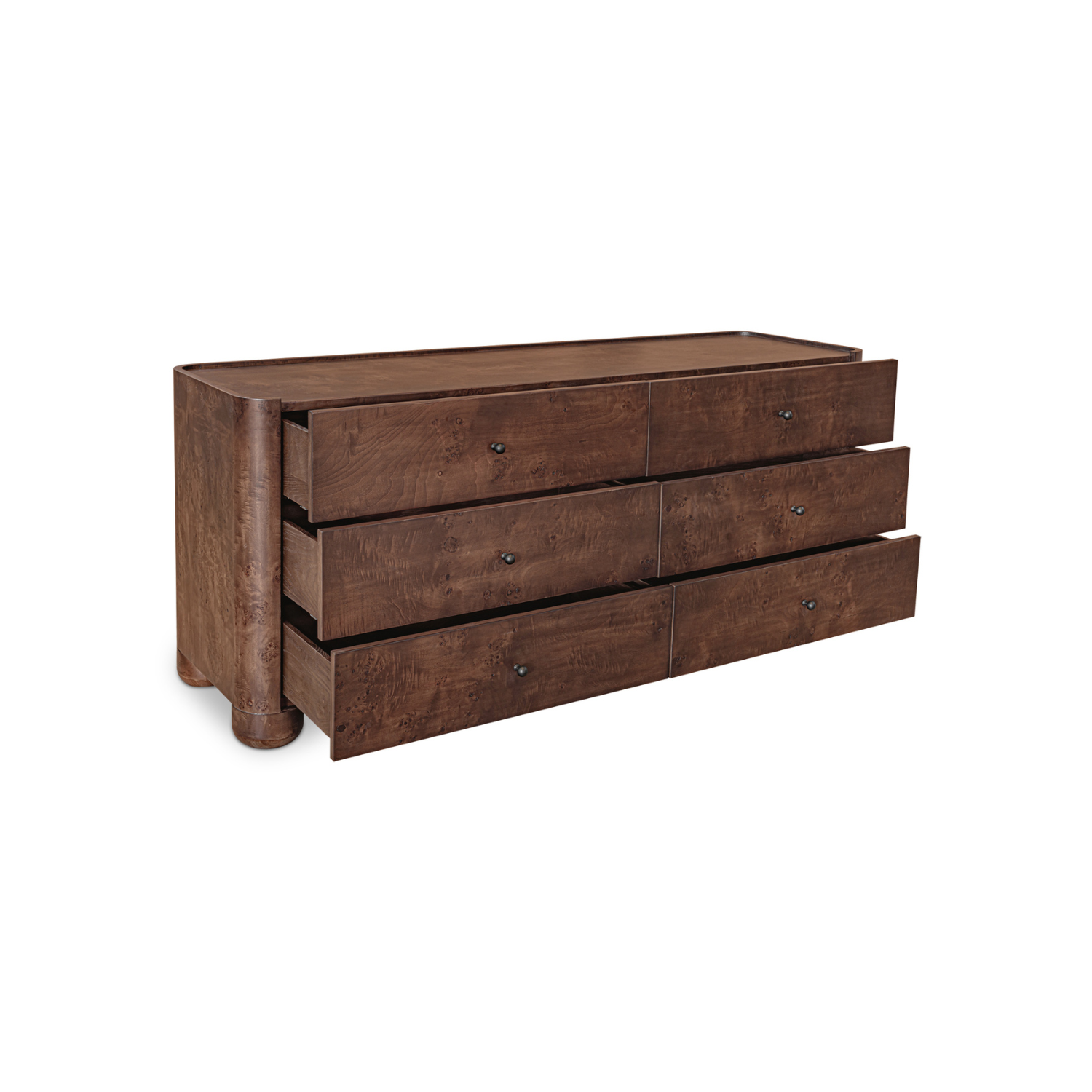 Crafted from solid oak with beautifully grained burl veneer, this piece marries durability with sophistication. Playful lip detailing and 6 soft-close drawers add unexpected charm with its timeless appeal and meticulous craftsmanship.