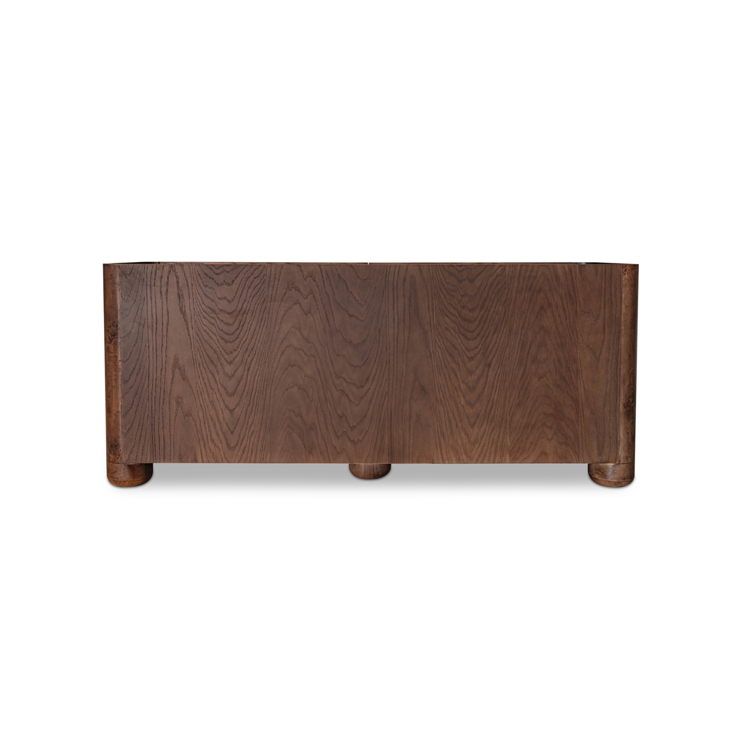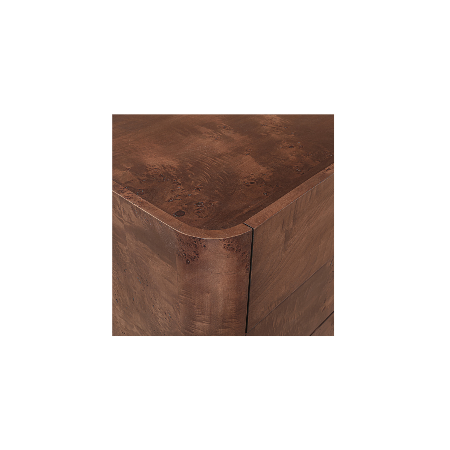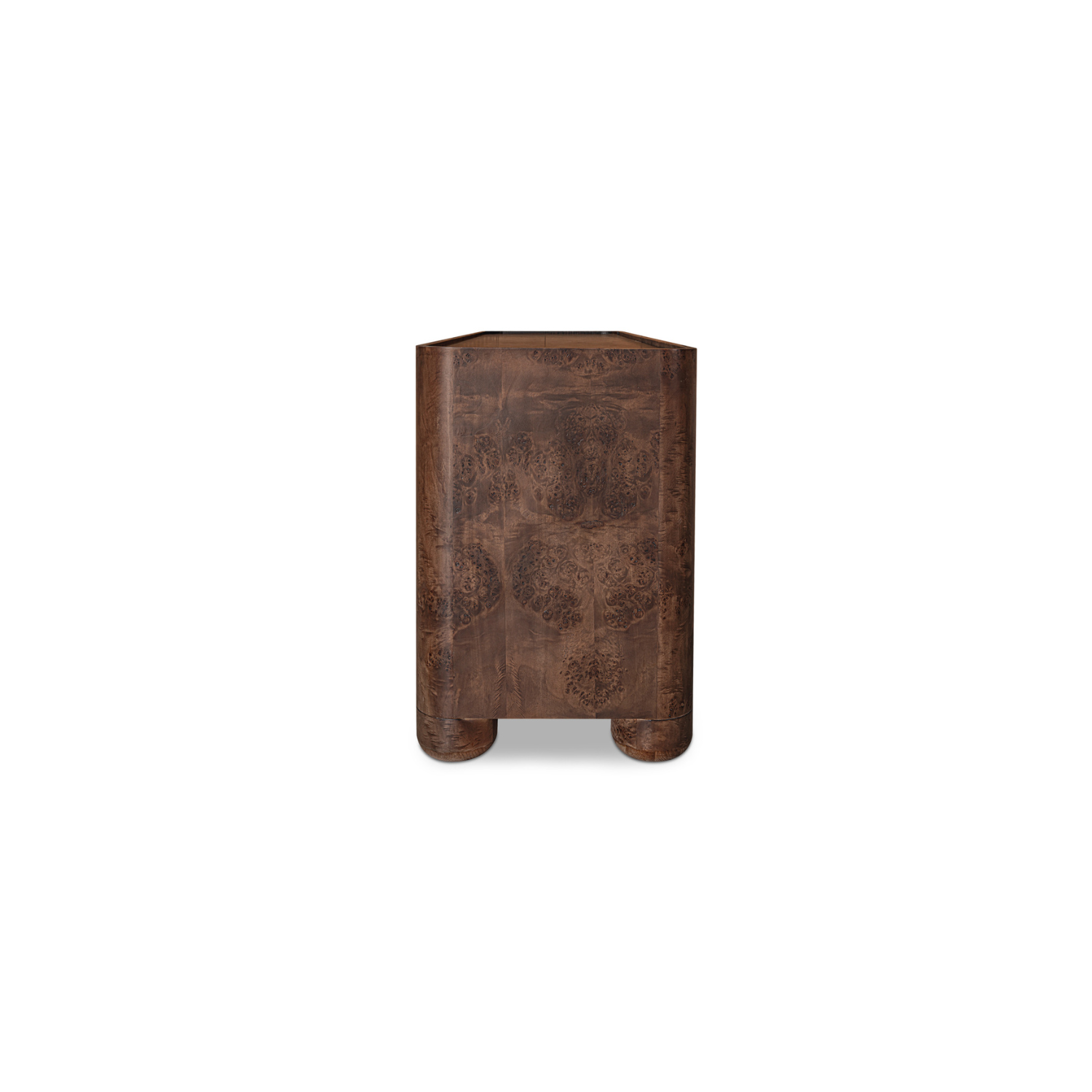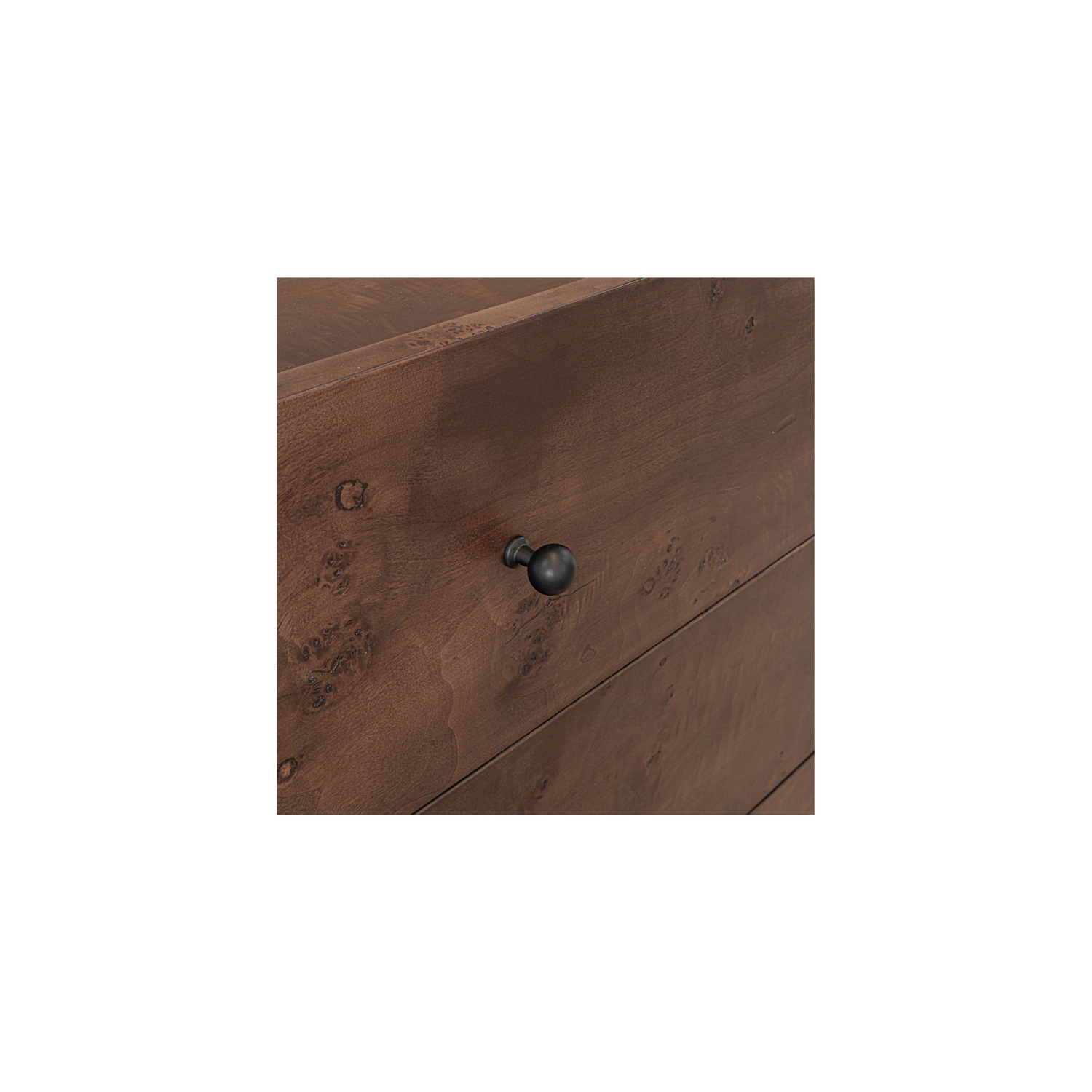 Crafted from solid oak with beautifully grained burl veneer, this piece marries durability with sophistication. Playful lip detailing and 6 soft-close drawers add unexpected charm with its timeless appeal and meticulous craftsmanship.