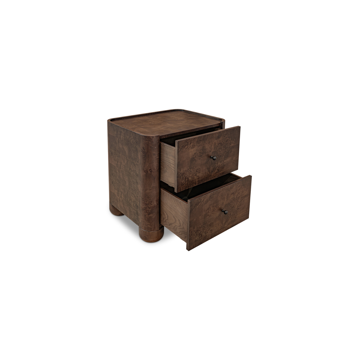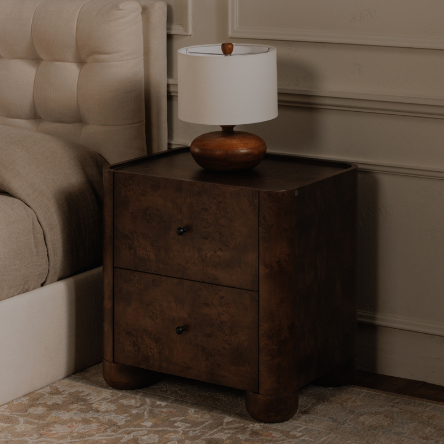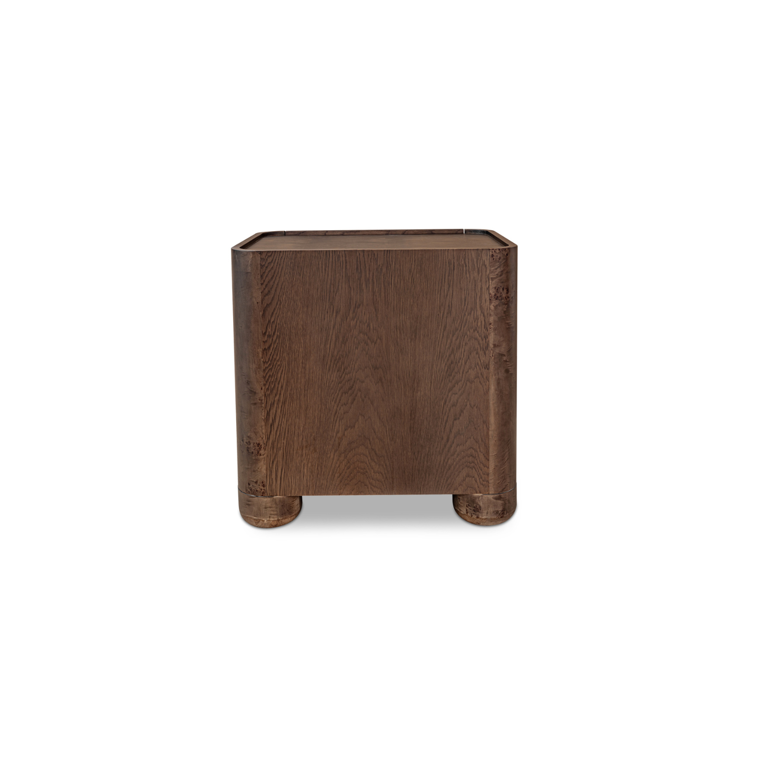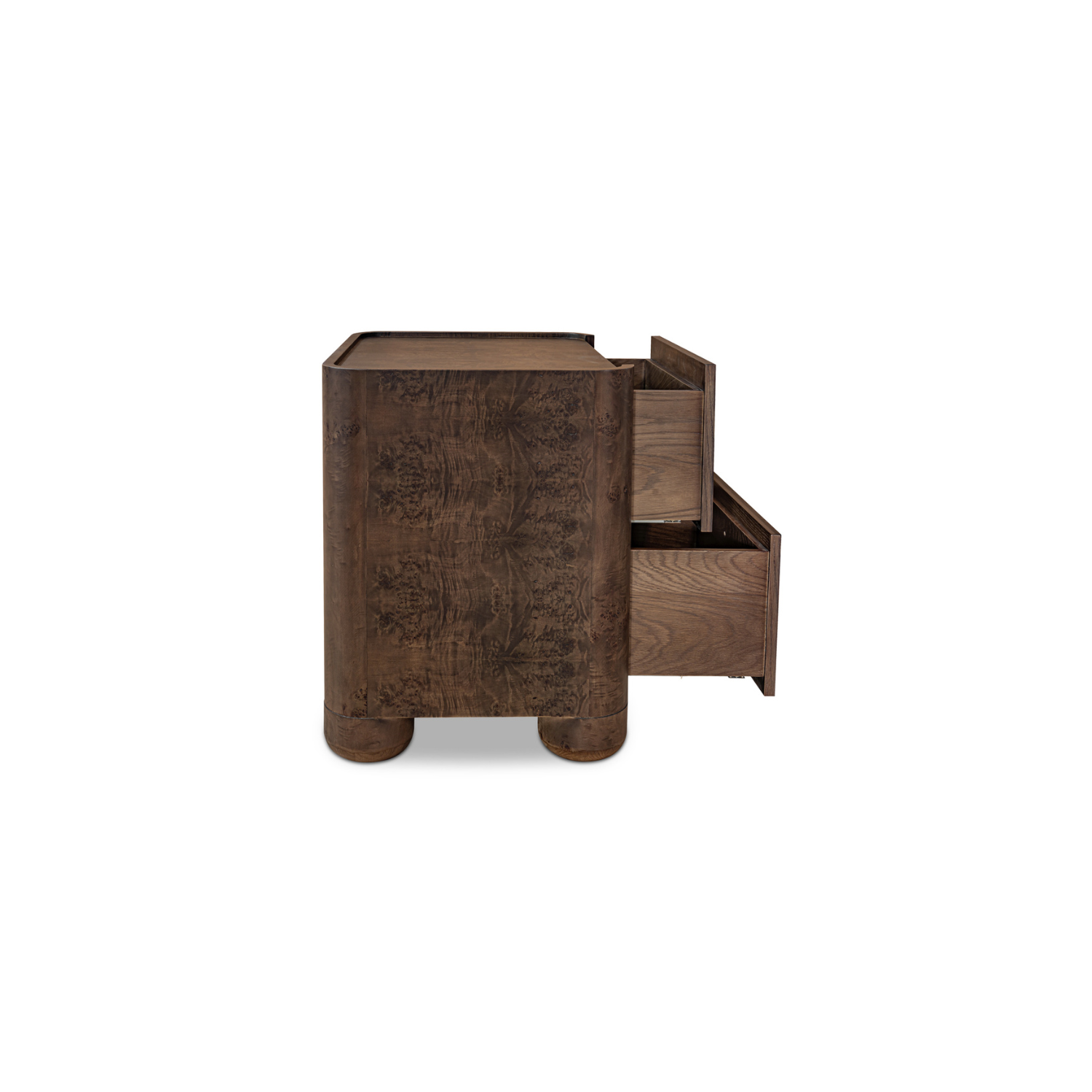 Crafted from solid oak with beautifully grained burl veneer, this piece marries durability with sophistication. Playful lip detailing and a soft-close drawer add unexpected charm with its timeless appeal and meticulous craftsmanship.