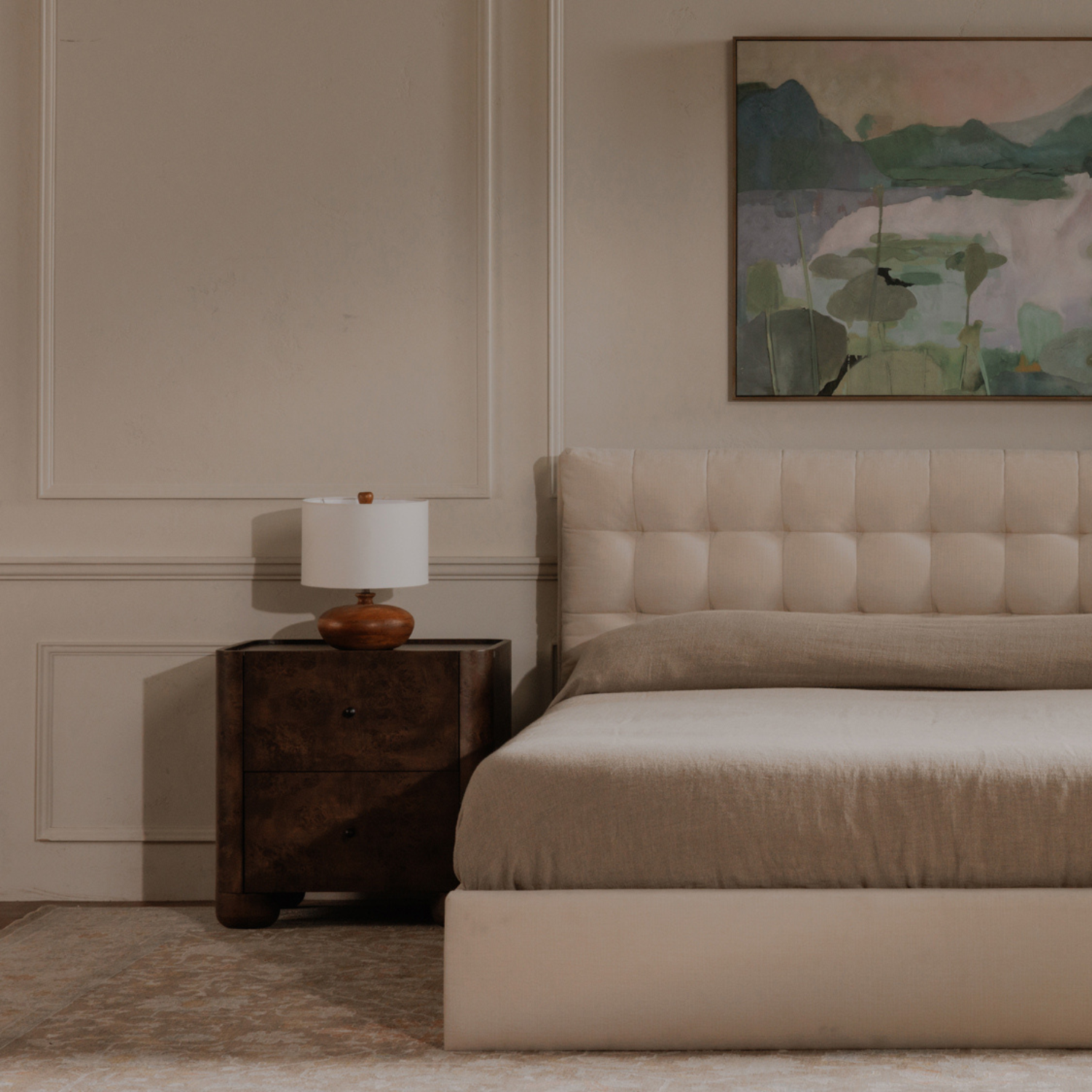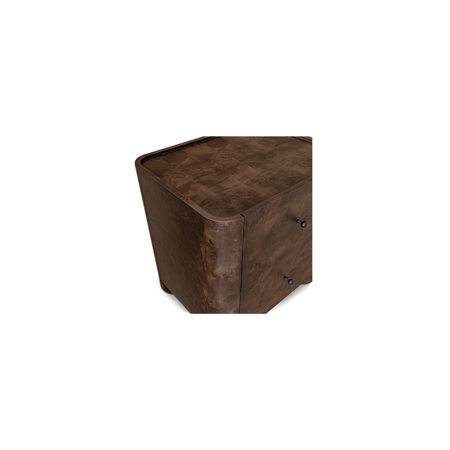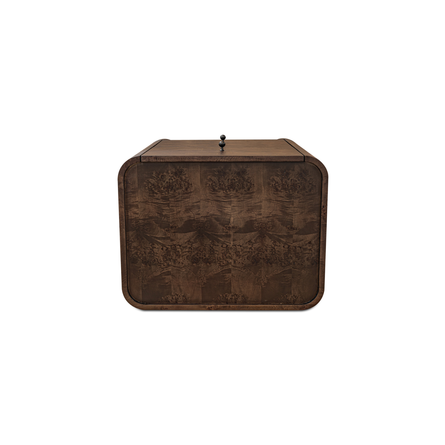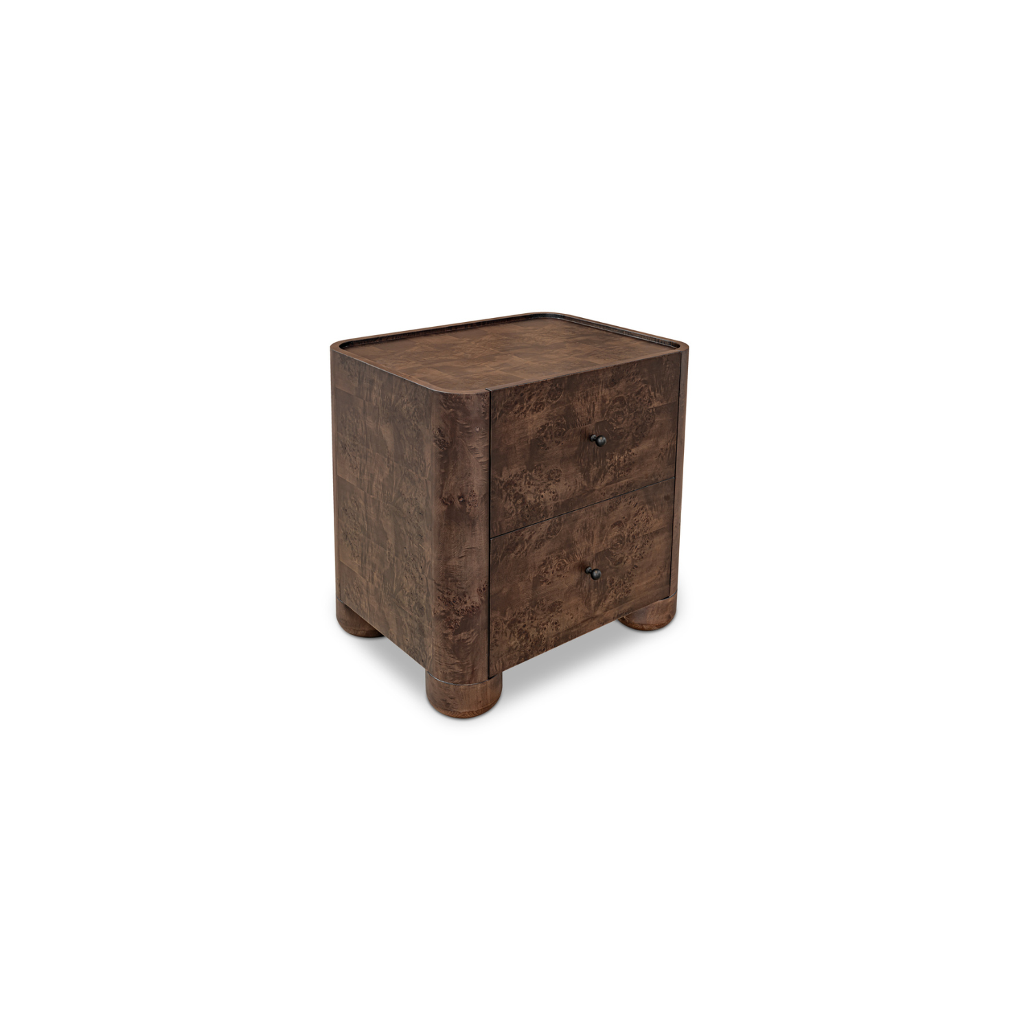 Crafted from solid oak with beautifully grained burl veneer, this piece marries durability with sophistication. Playful lip detailing and a soft-close drawer add unexpected charm with its timeless appeal and meticulous craftsmanship.
