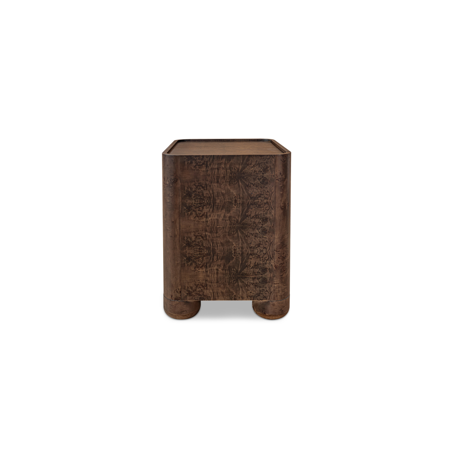 The Gibson nightstand's fluid design seamlessly integrates the leg panel into the frame, creating a captivating visual flow.