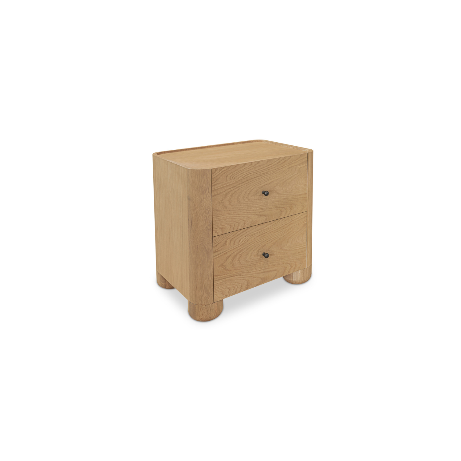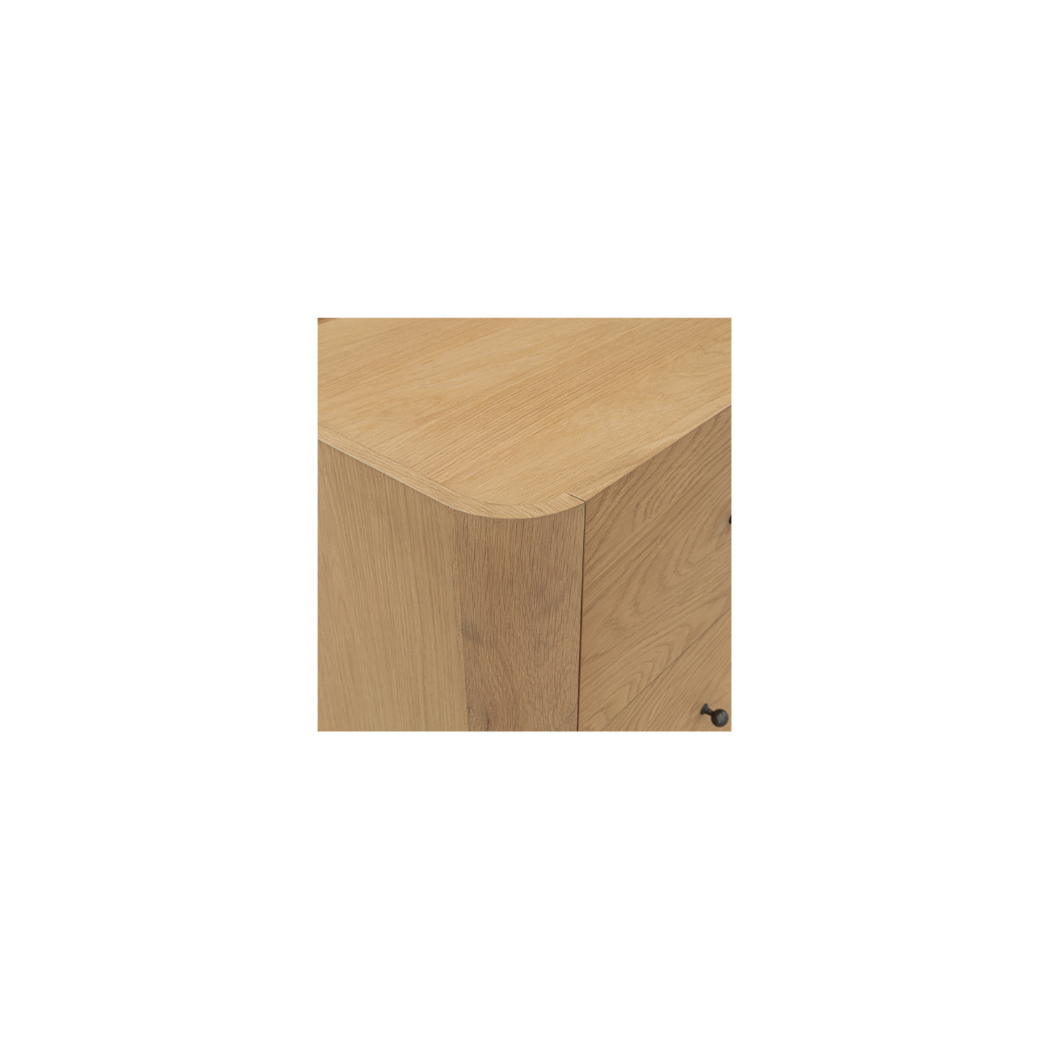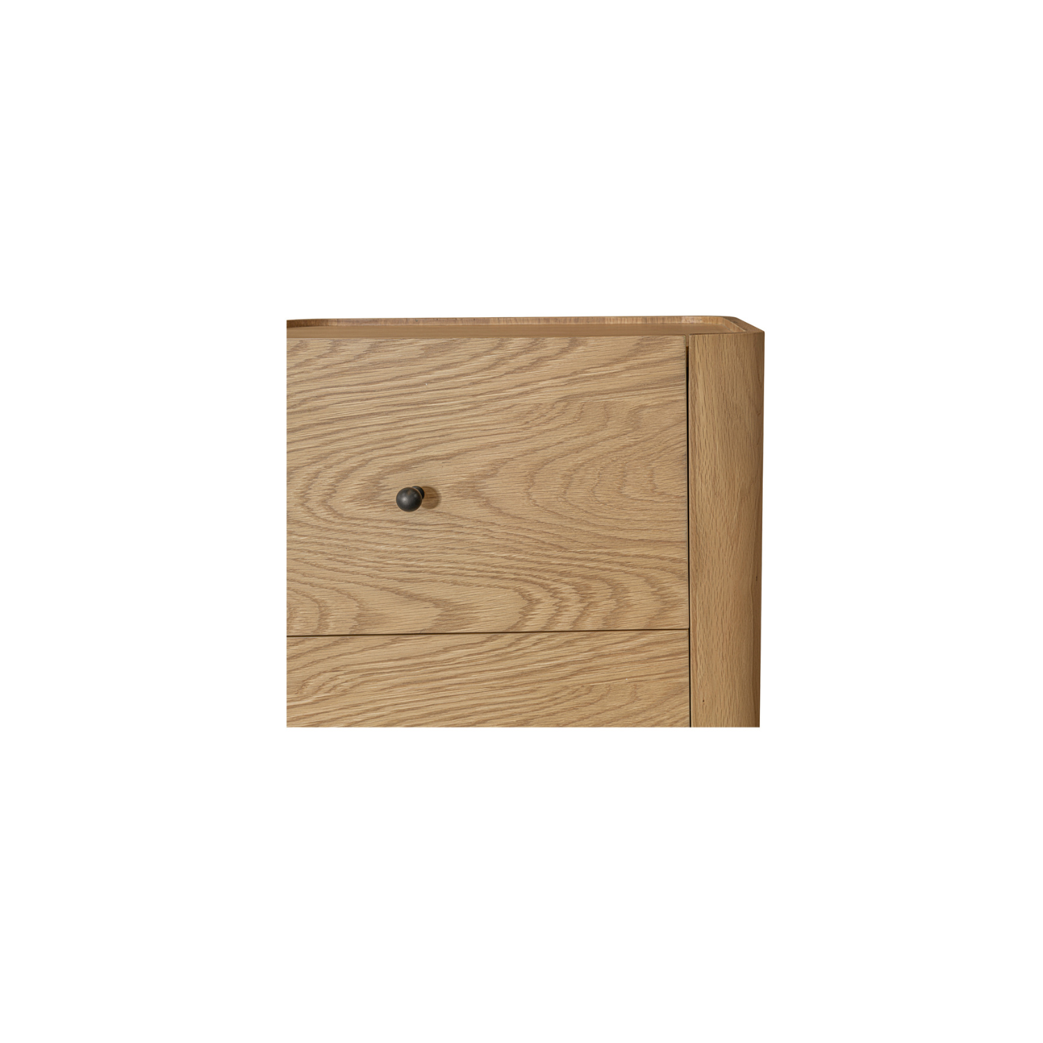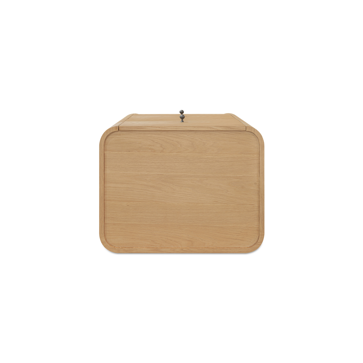 Crafted from solid oak with oak veneer, this piece marries durability with sophistication. Playful lip detailing and a soft-close drawer add unexpected charm with its timeless appeal and meticulous craftsmanship.