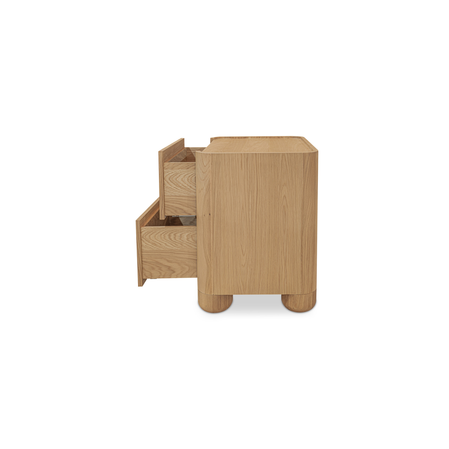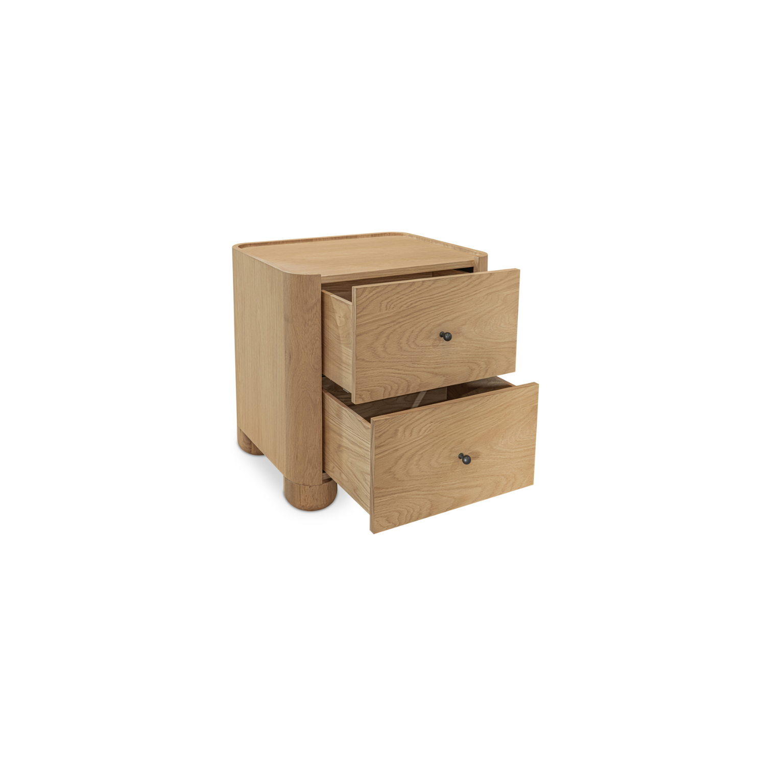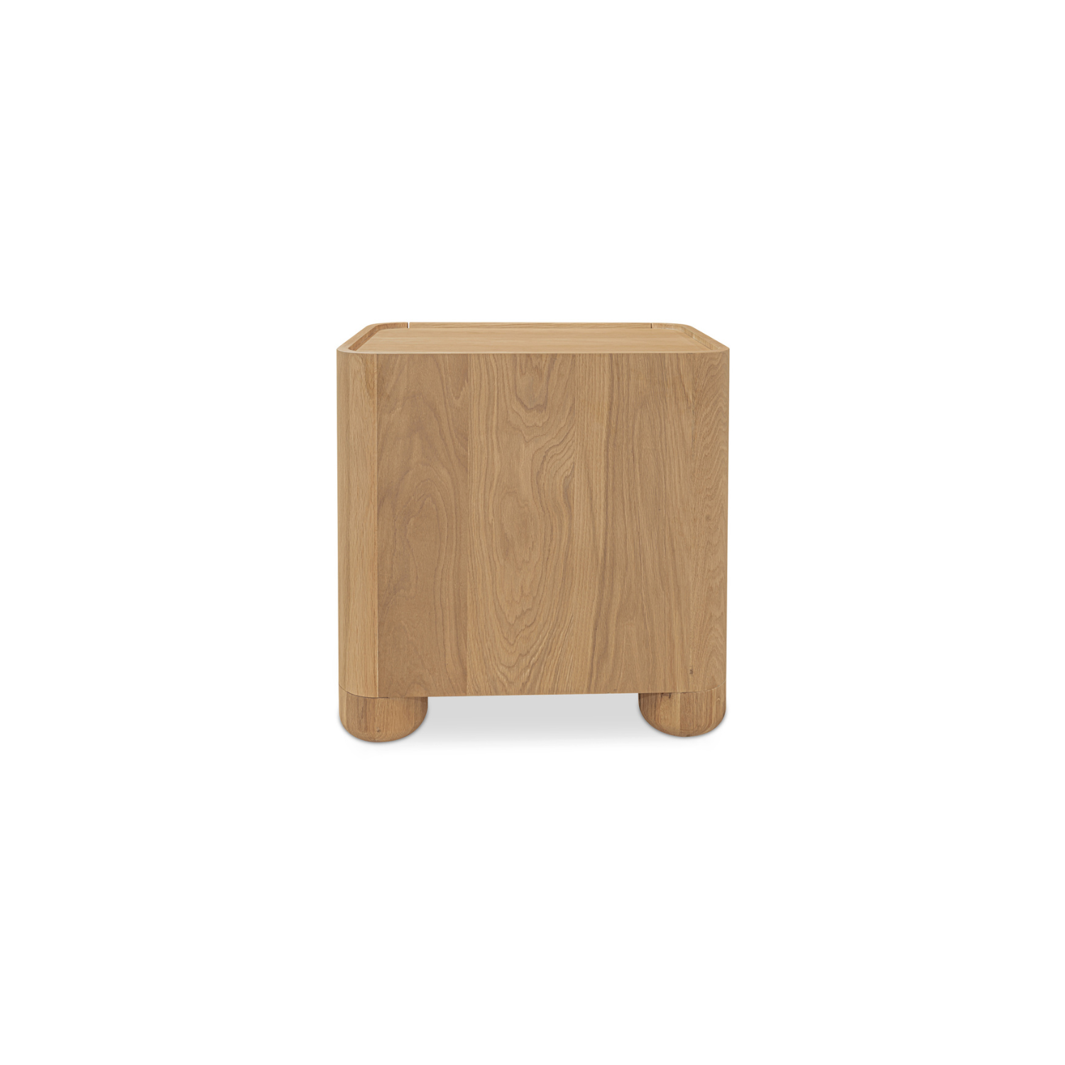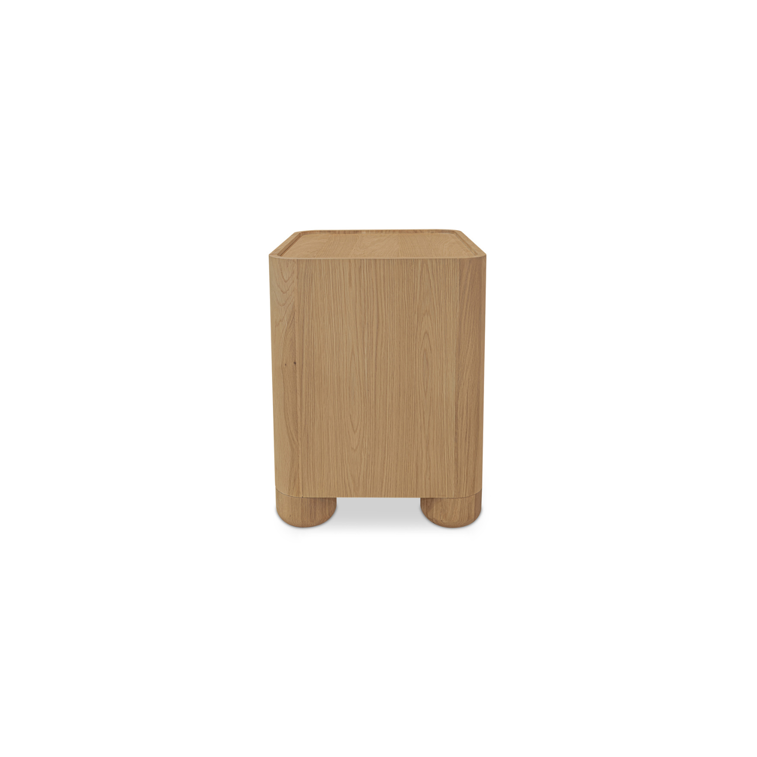 Crafted from solid oak with oak veneer, this piece marries durability with sophistication. Playful lip detailing and a soft-close drawer add unexpected charm with its timeless appeal and meticulous craftsmanship.