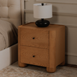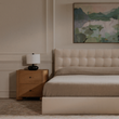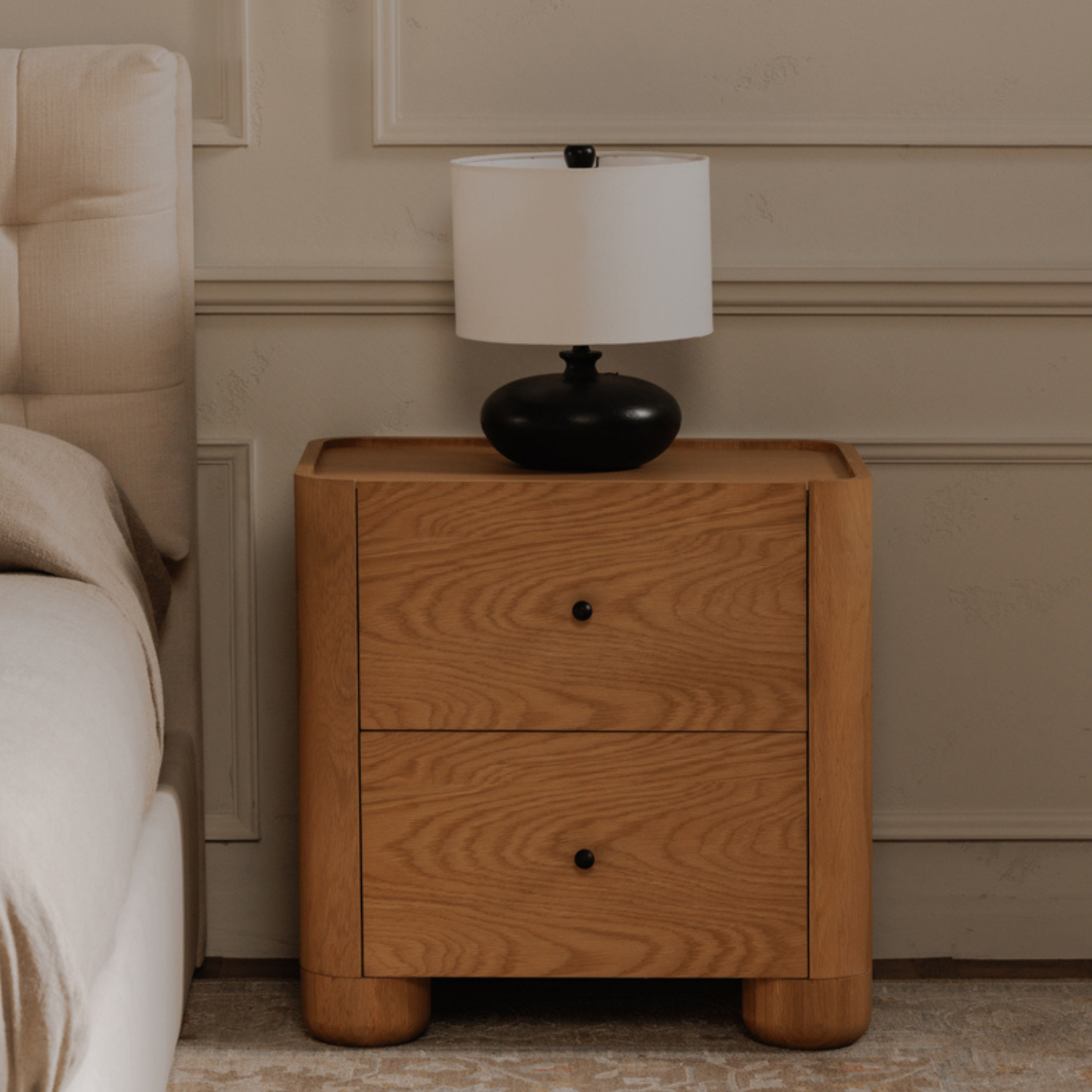The Gibson nightstand's fluid design seamlessly integrates the leg panel into the frame, creating a captivating visual flow.