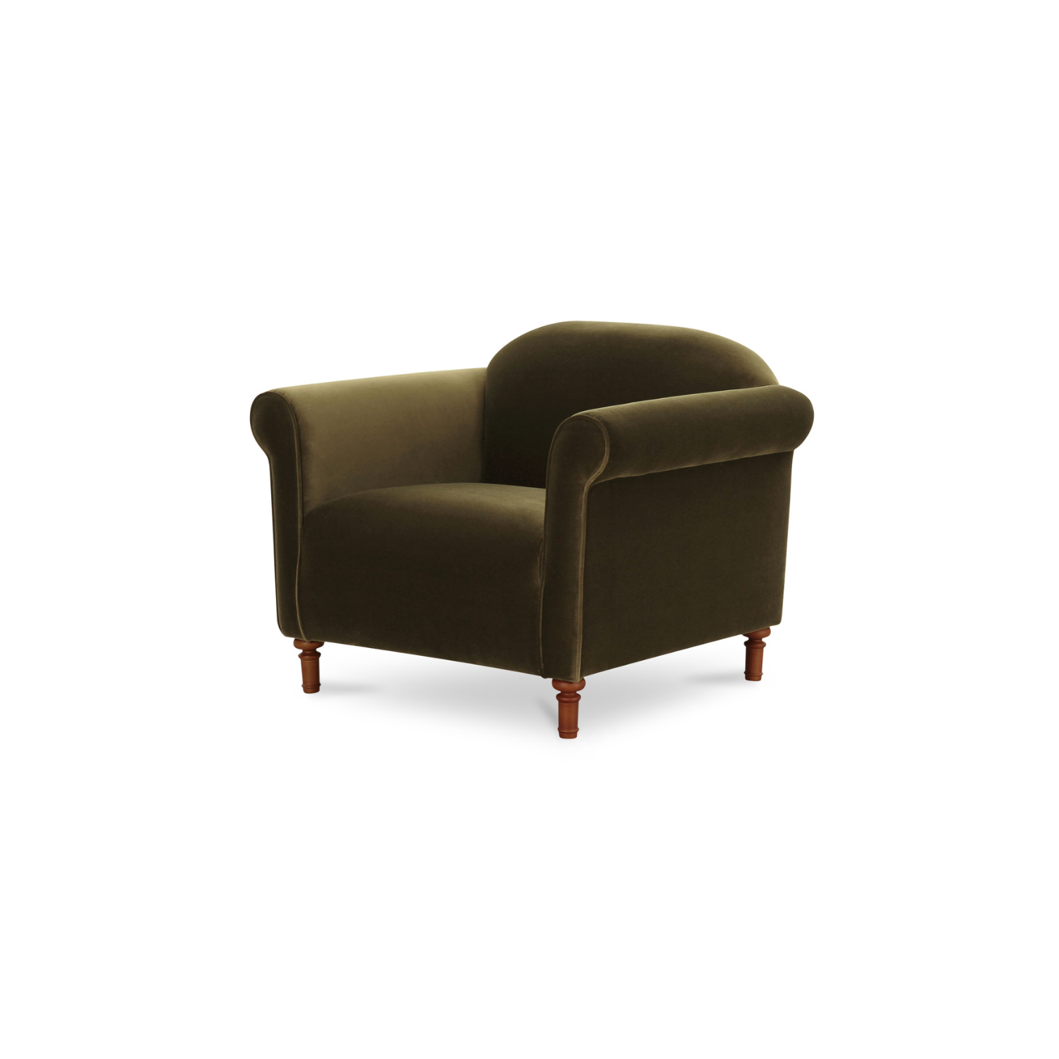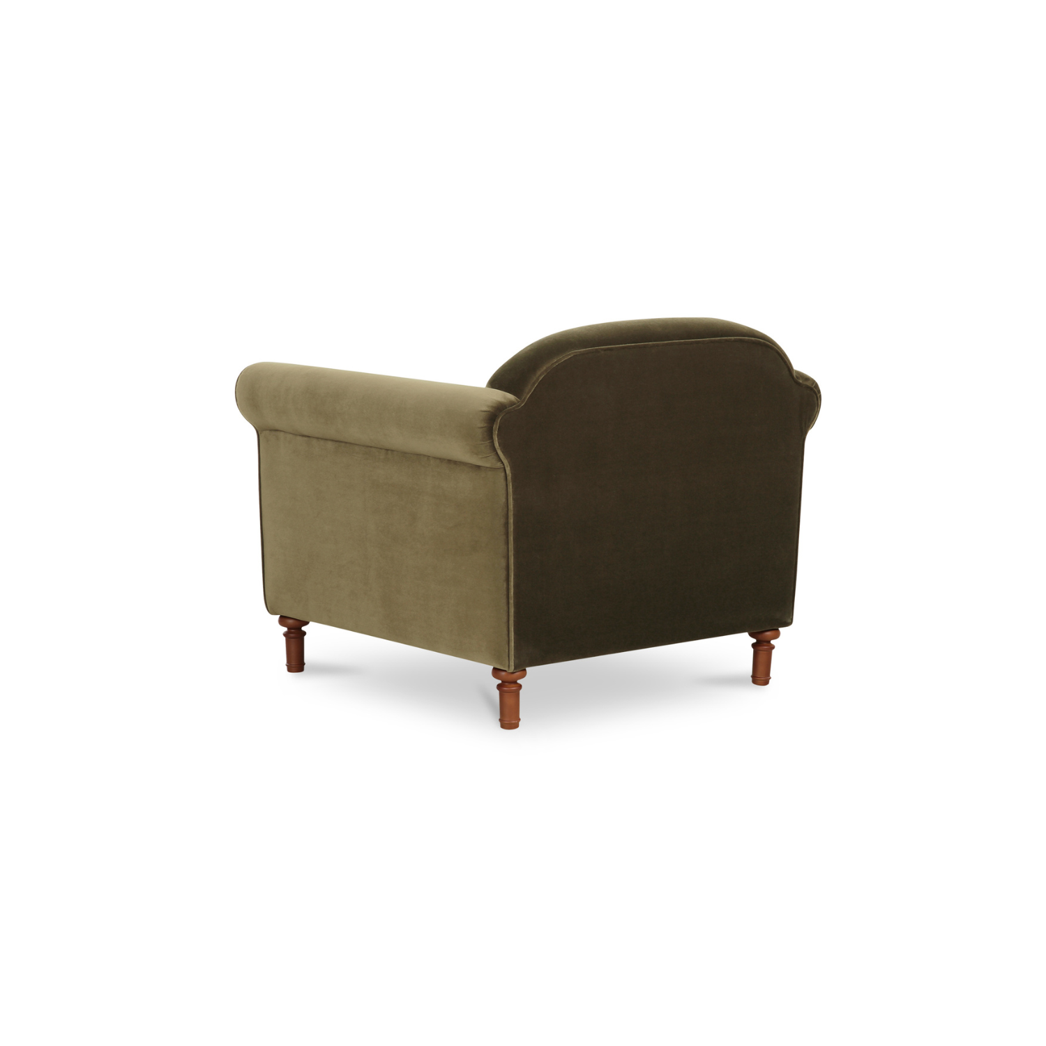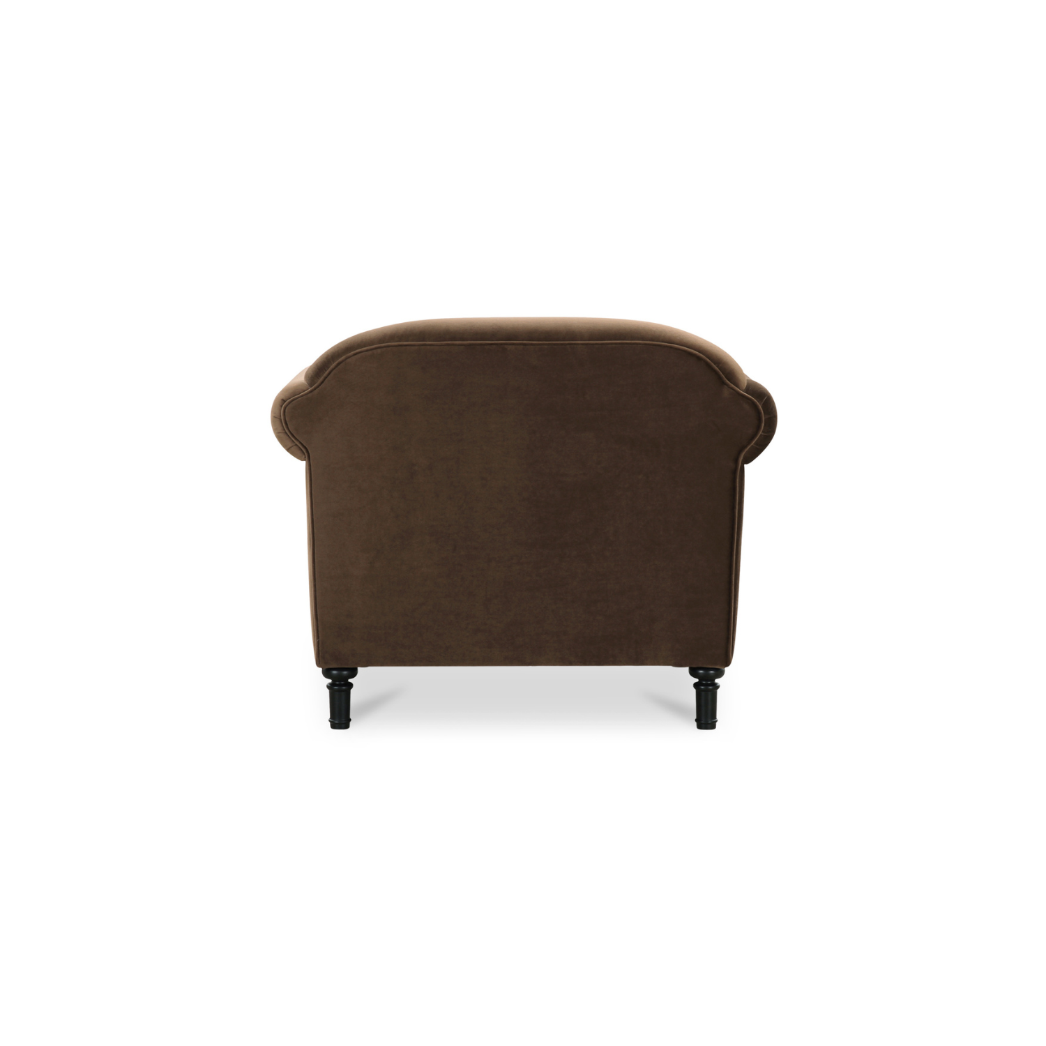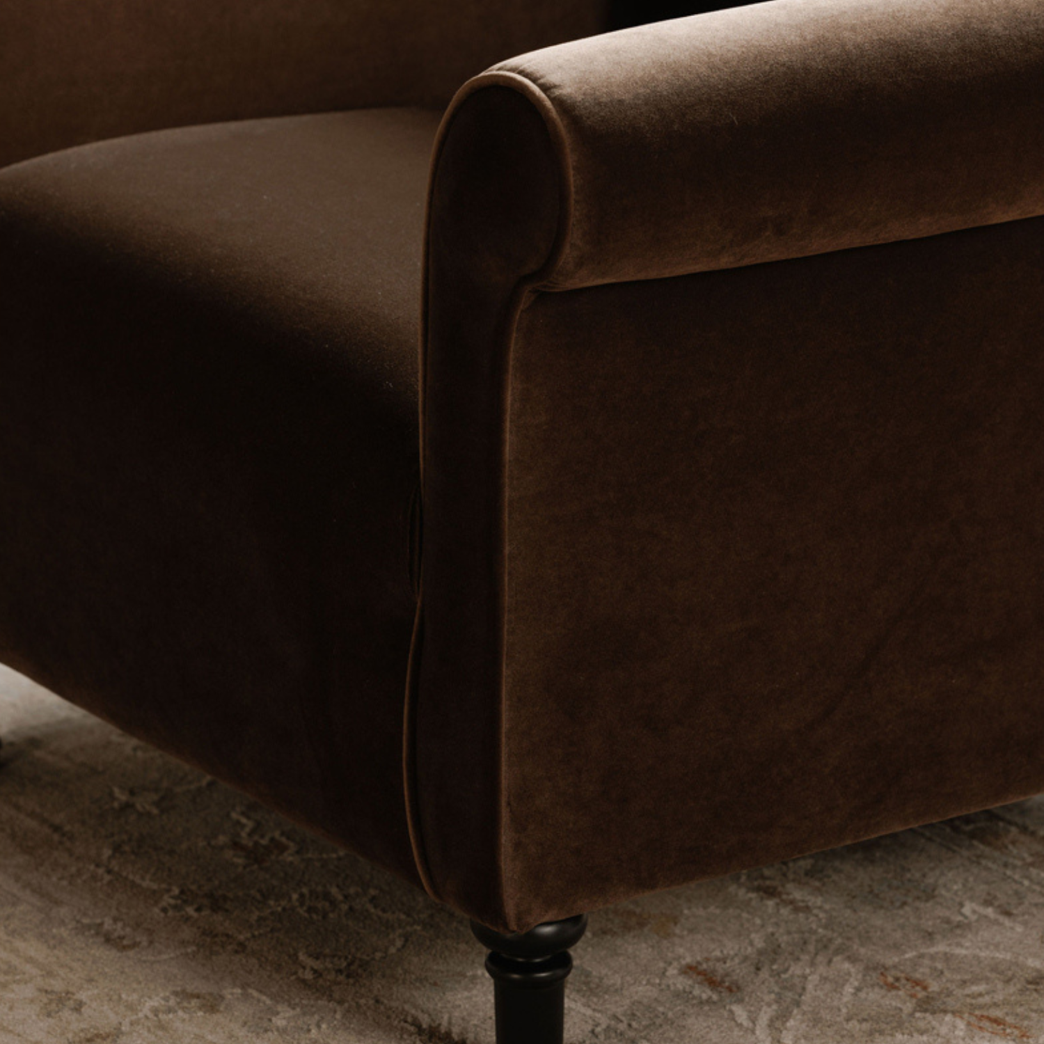Upholstered in dense velvet-like faux mohair, the Harmony accent chair embodies traditional elegance showcasing soft rolled arms with a subtle, gentle curve and finished with exquisite piping detailing that extends from the arms to the back.