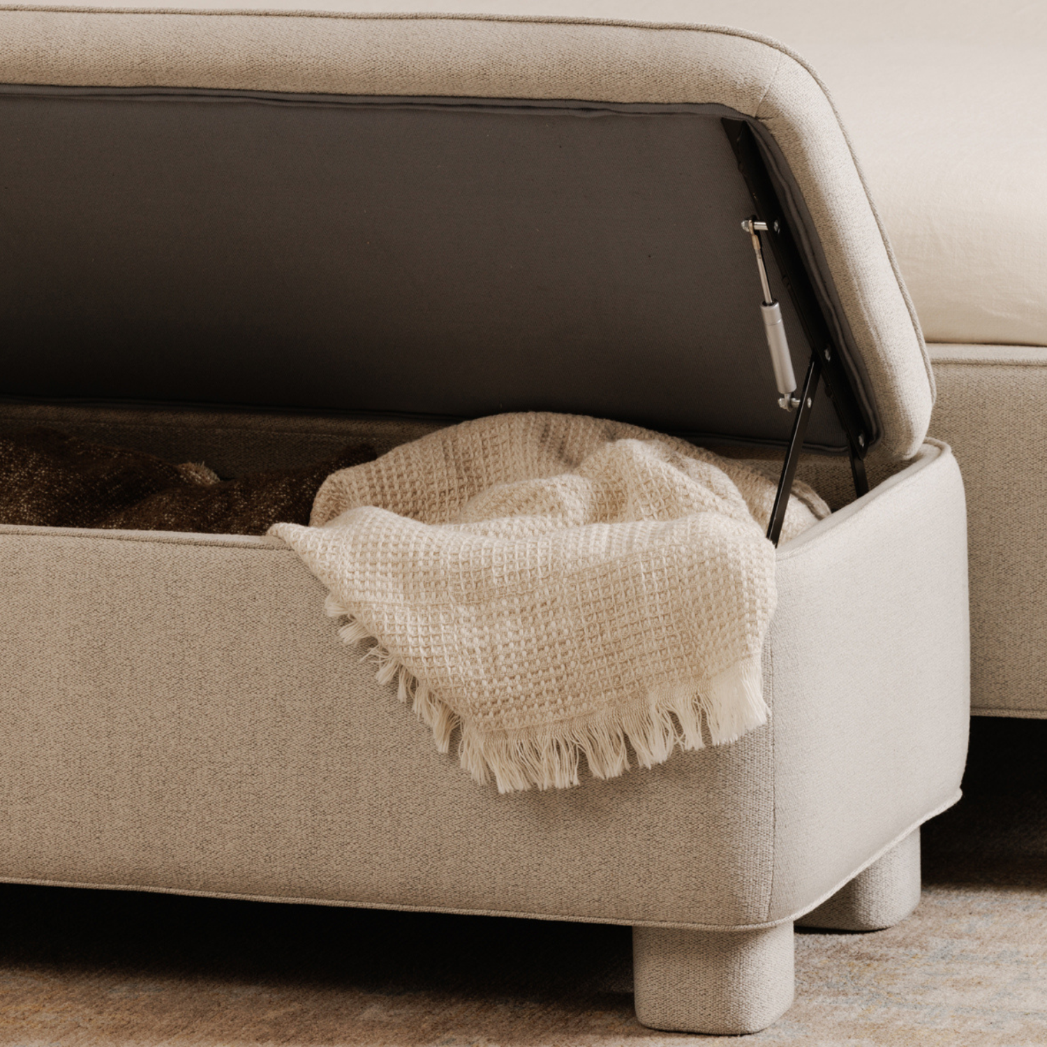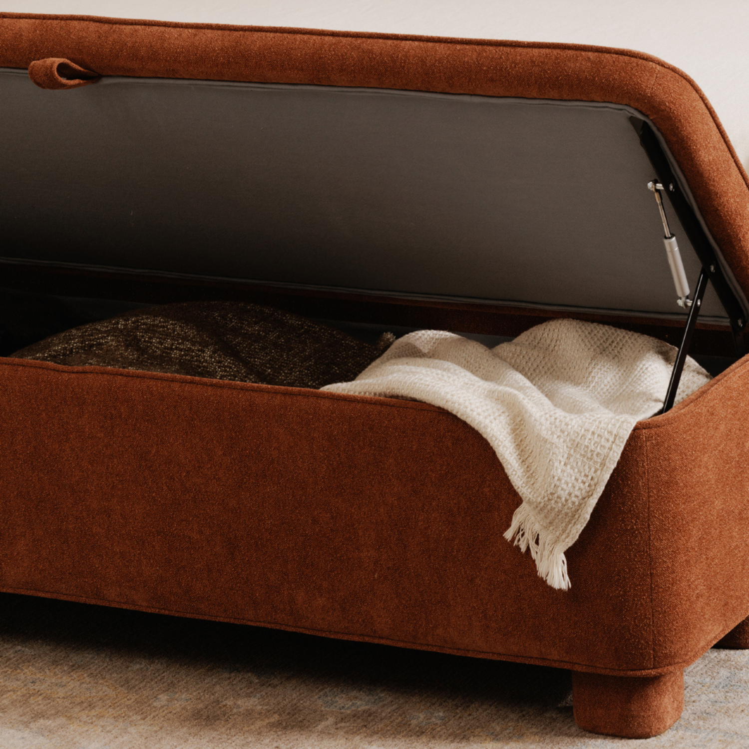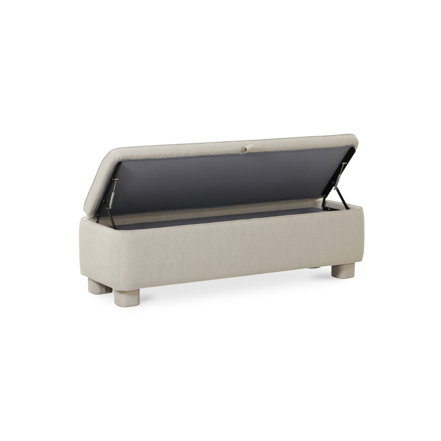 Designed with comfort in the forefront, the Ichigo storage bench is upholstered in a soft-touch polyester, accommodating two people with a convenient storage compartment discreetly tucked away beneath the seat.