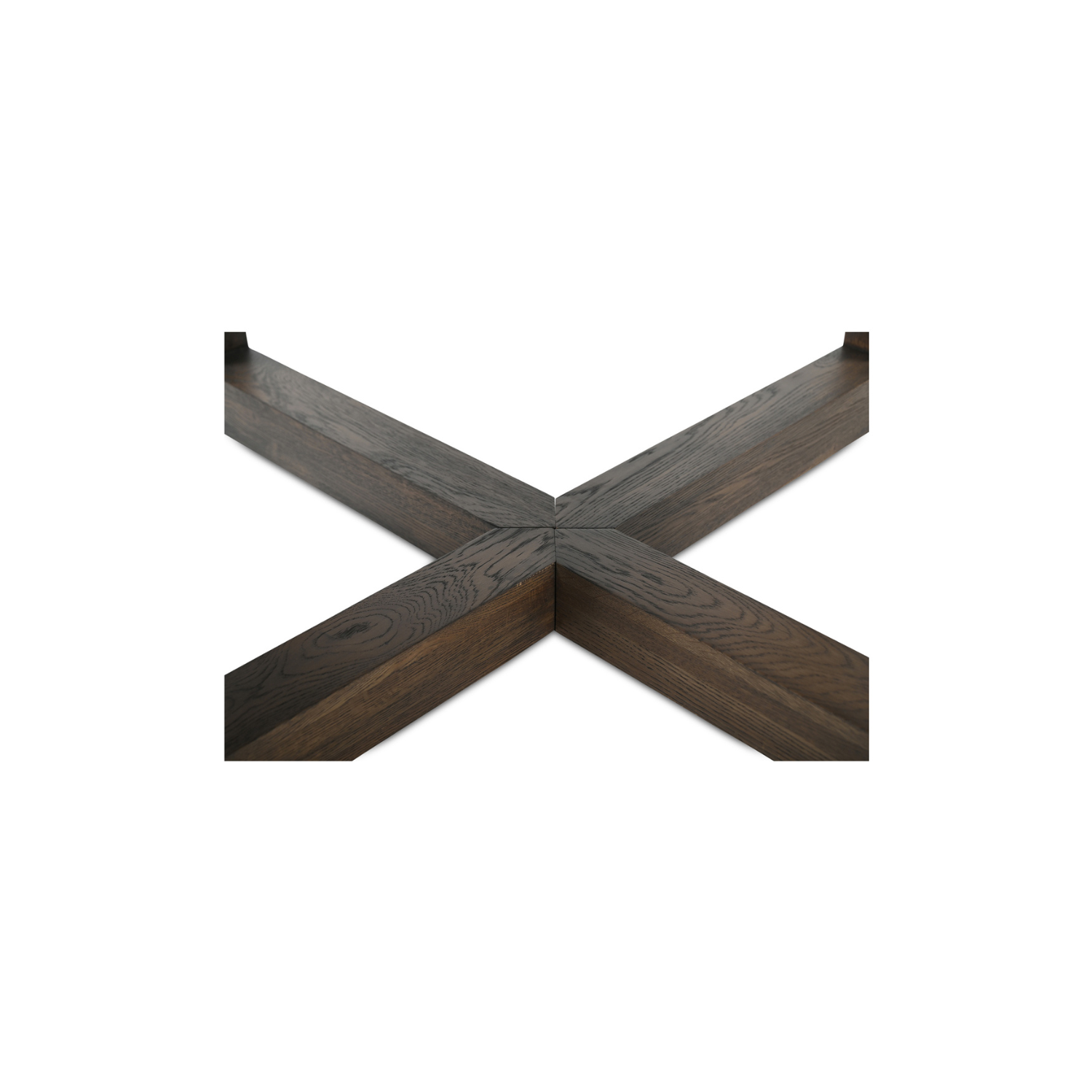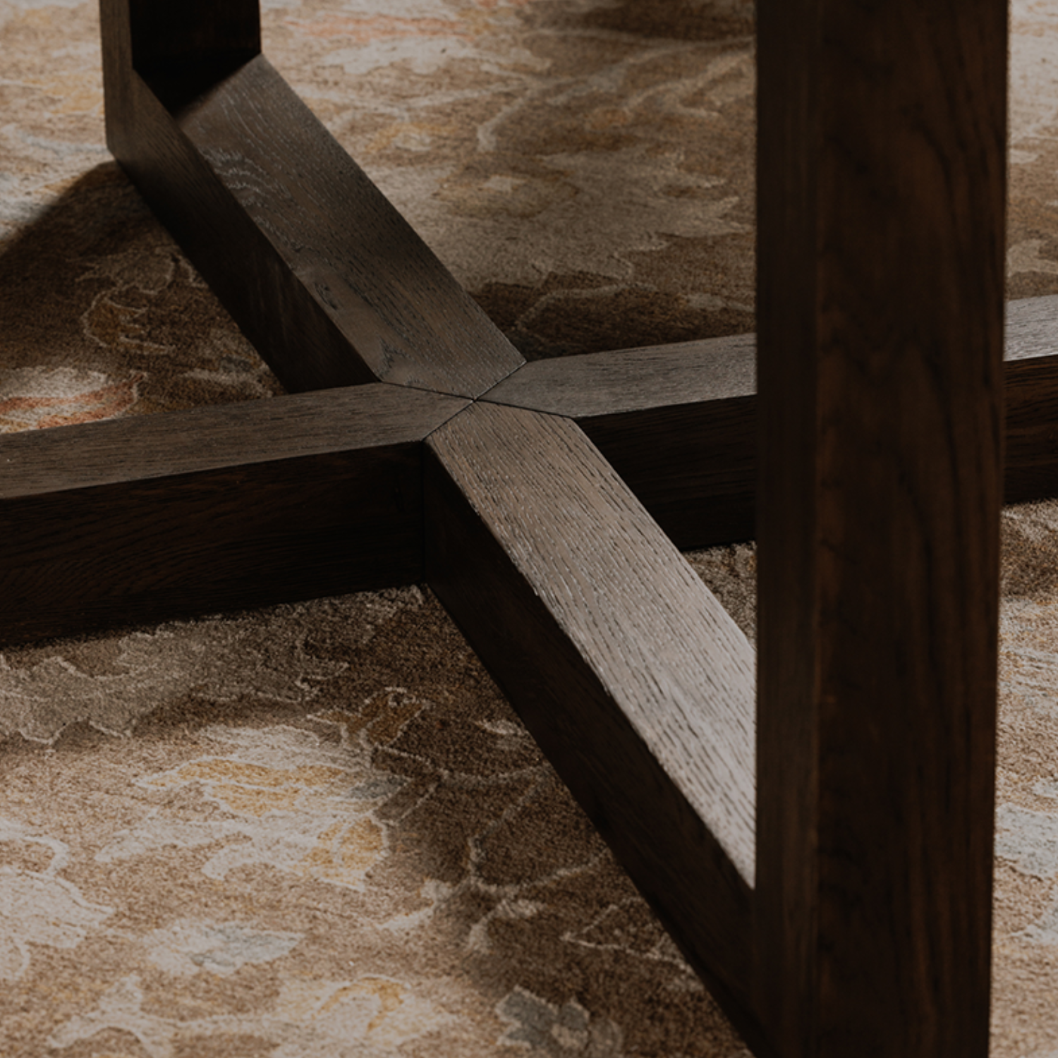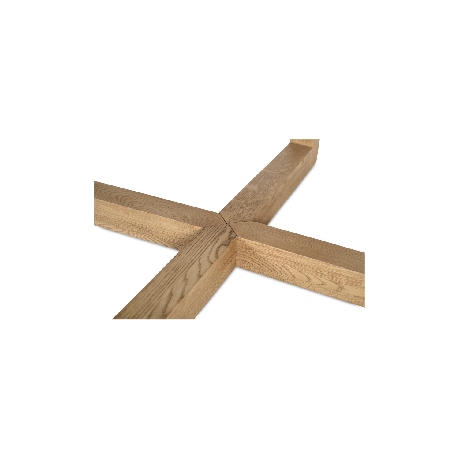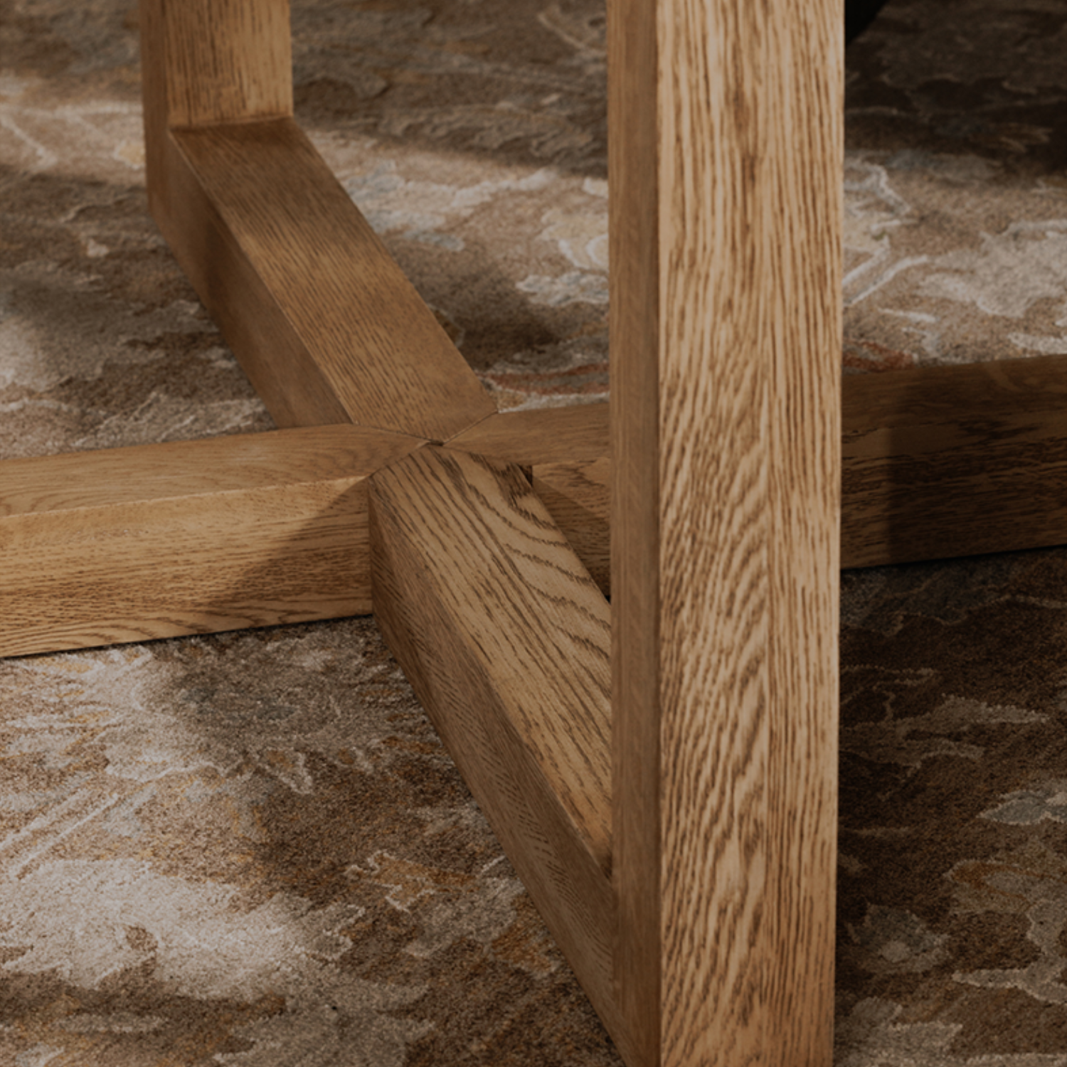 The geometric base, with crisscrossing stretchers, grounds the piece with quiet confidence. A natural, wire-brushed finish enhances the oak's organic beauty, creating a focal point of understated elegance.