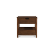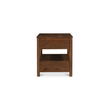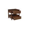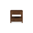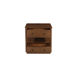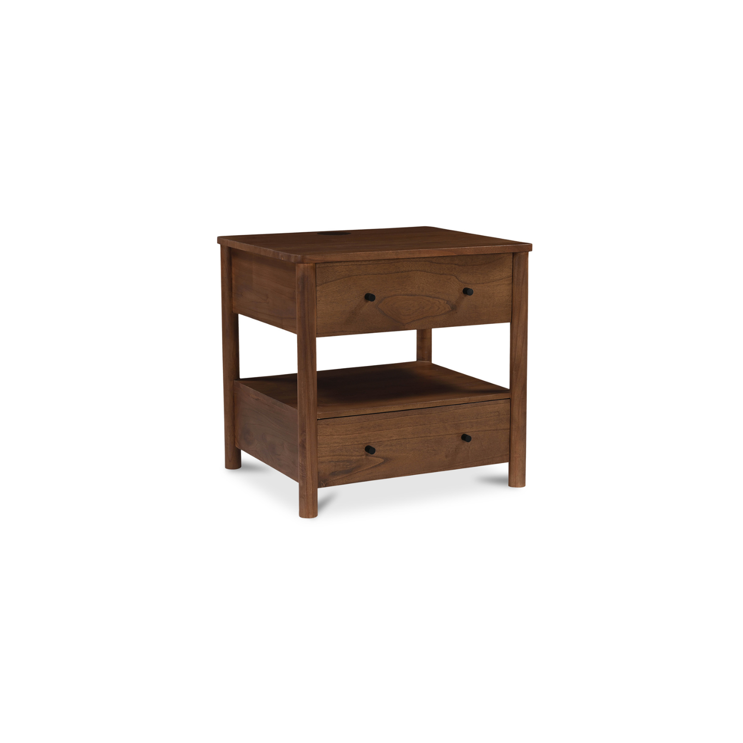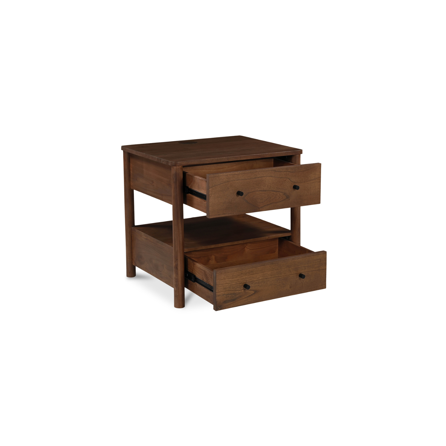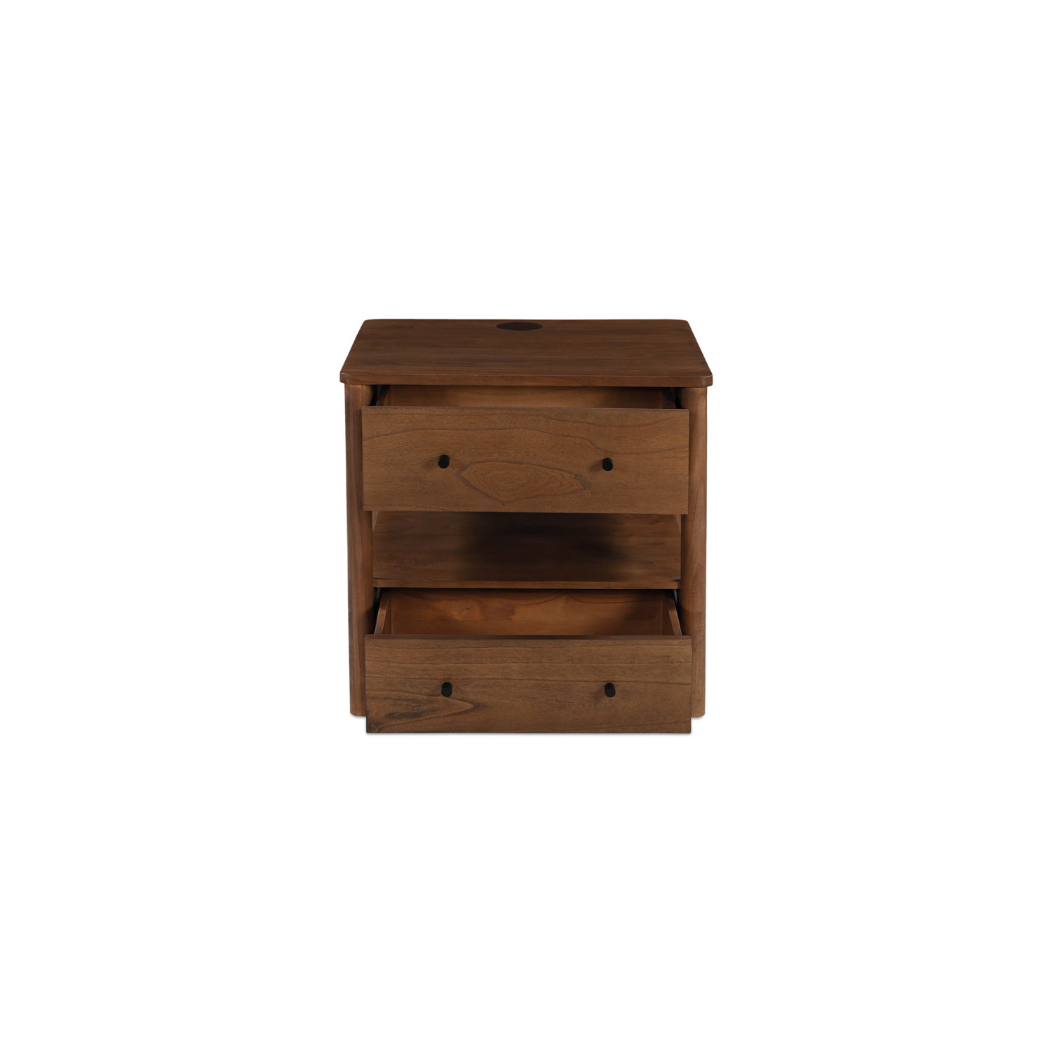 Meticulously crafted from new neem wood with mango veneer accents, the Lottie charging nightstand features two drawers and a central open space for versatile storage. The traditional silhouette is enhanced by sleek black handles, creating a timeless appeal.