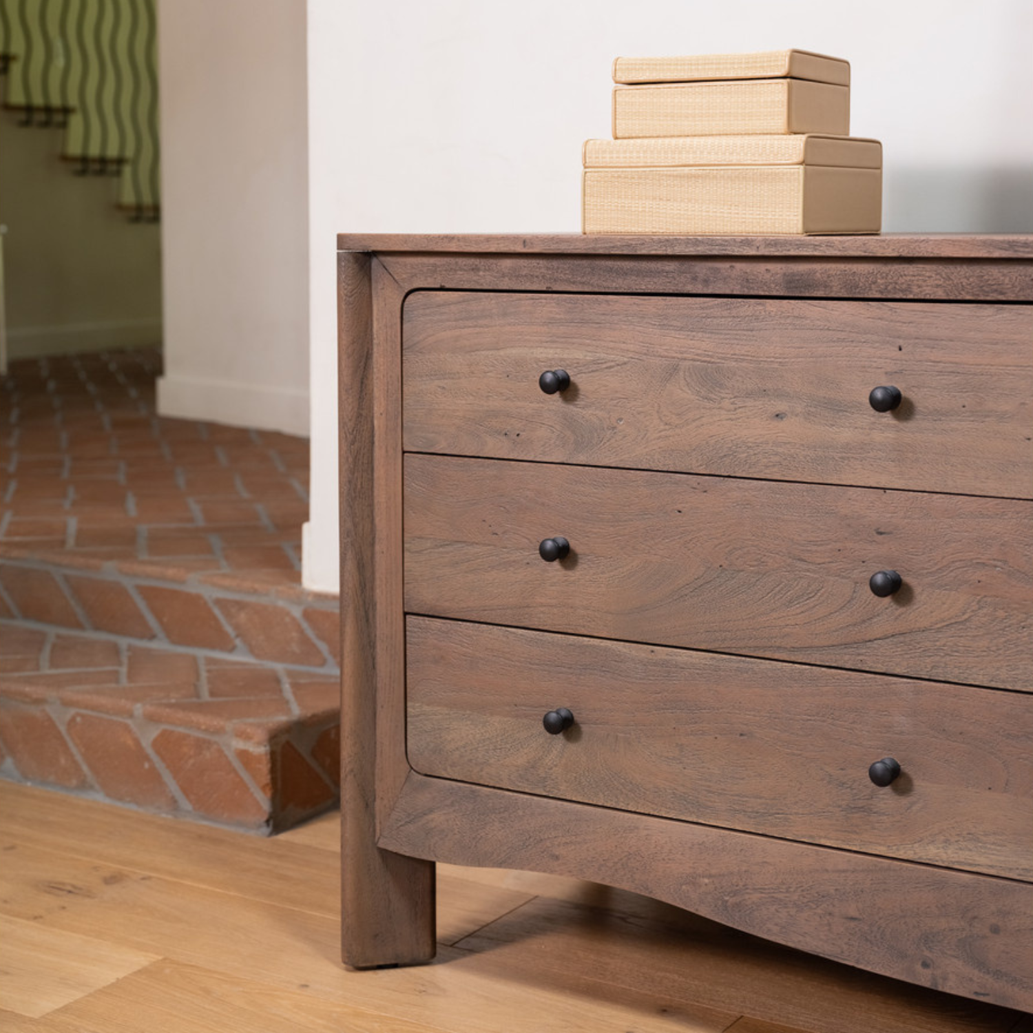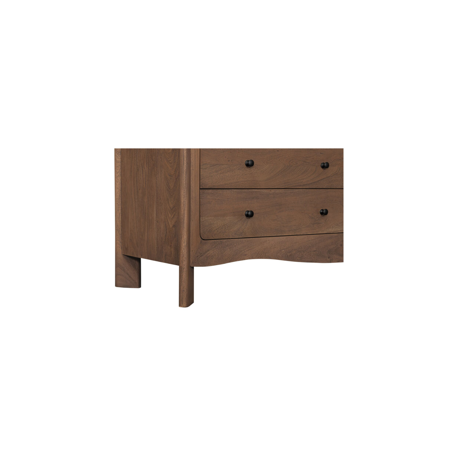 Curve meets edge. Mabel is all about sculptural detail done right. A curved base gives a subtle nod to tradition, while inverted diagonal legs add lift and a modern twist. The wire-brushed Acacia brings out texture and tone, highlighting the wood’s natural grain. Compact, confident, and grounded by design.