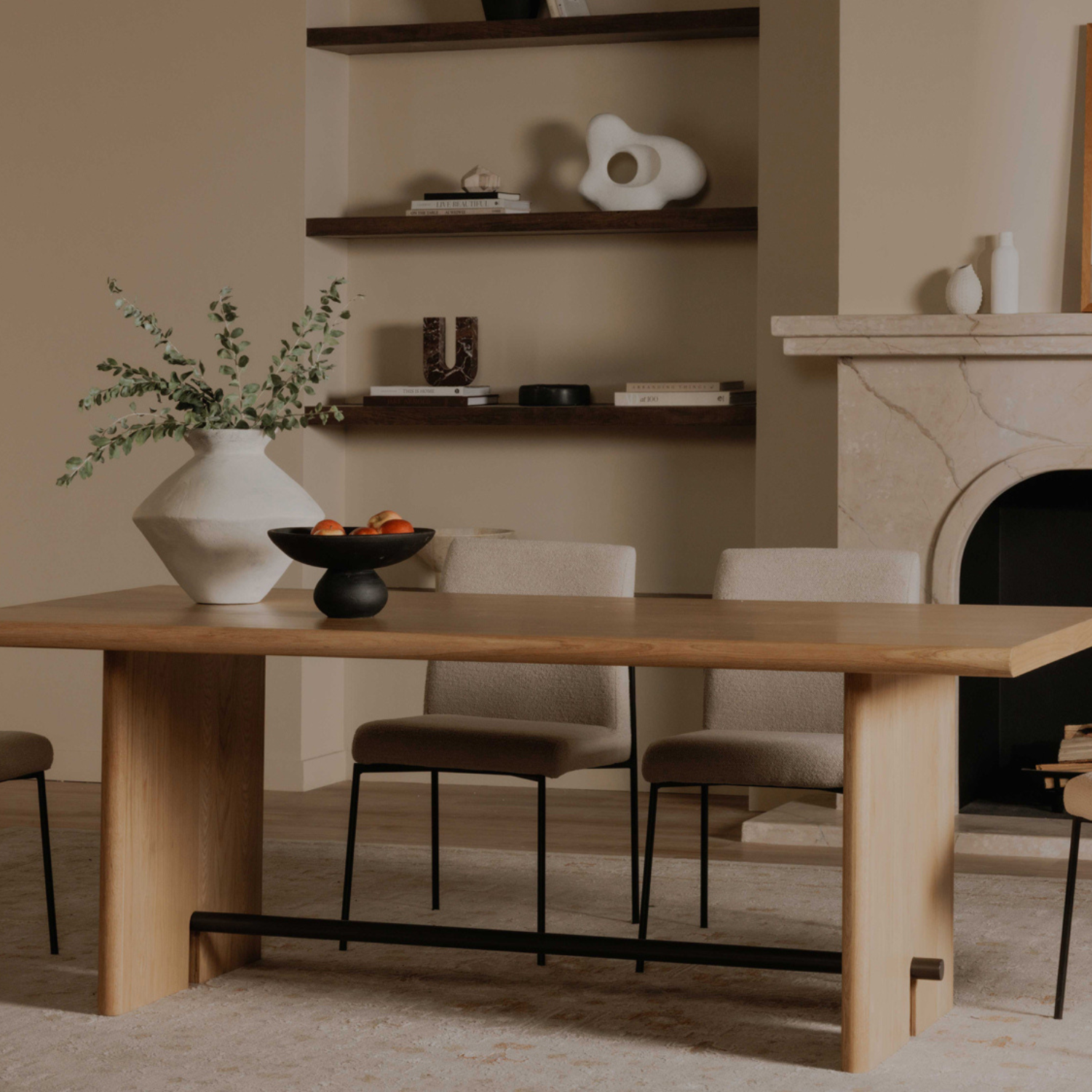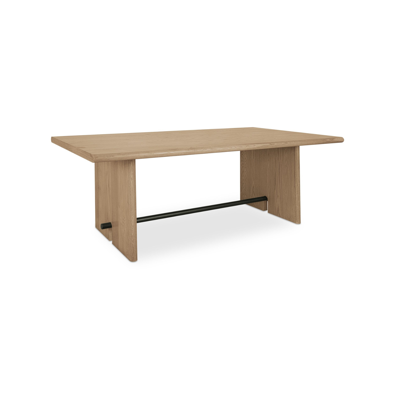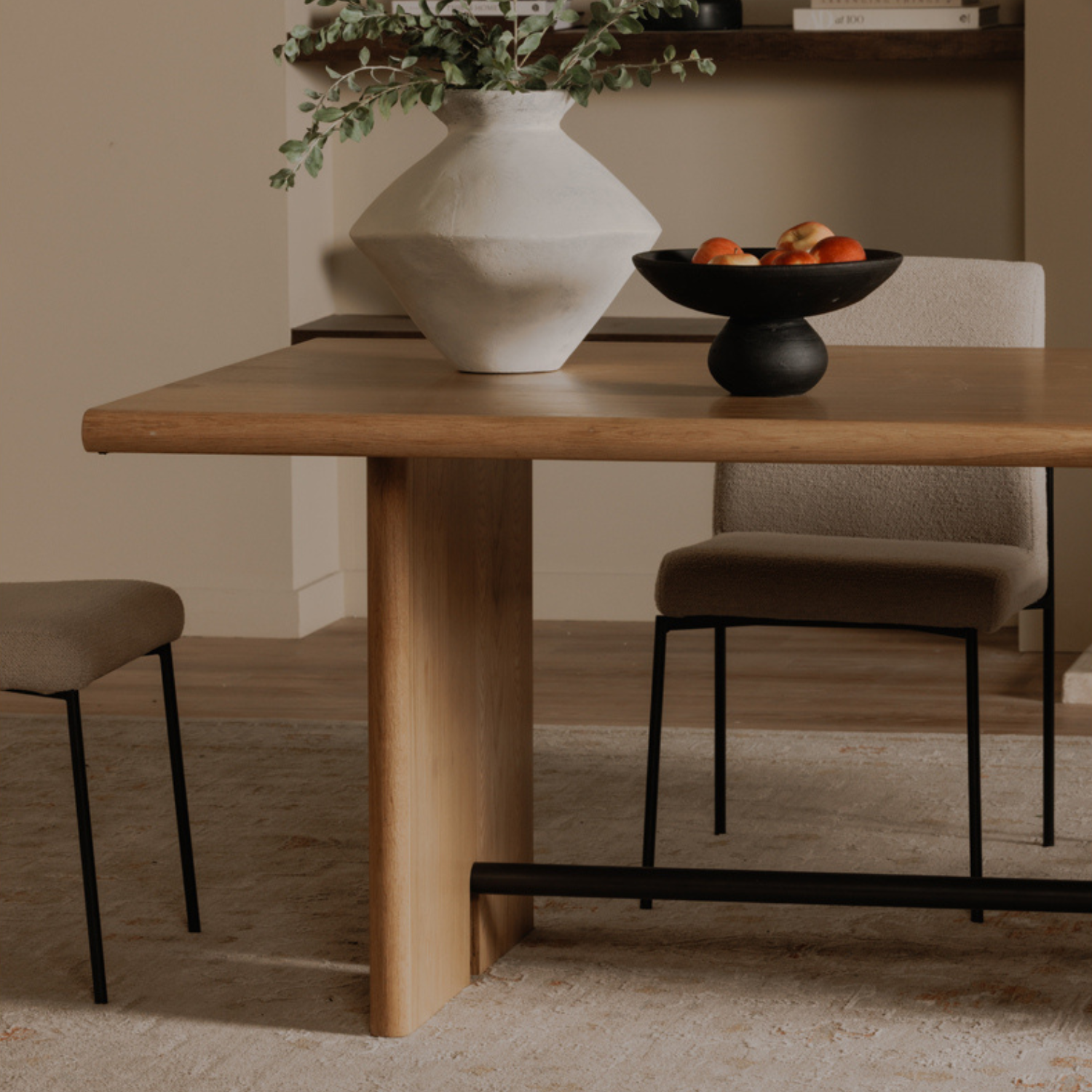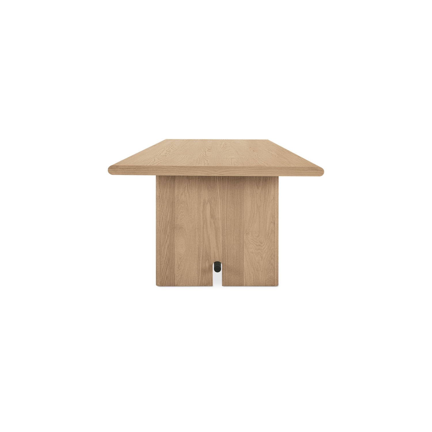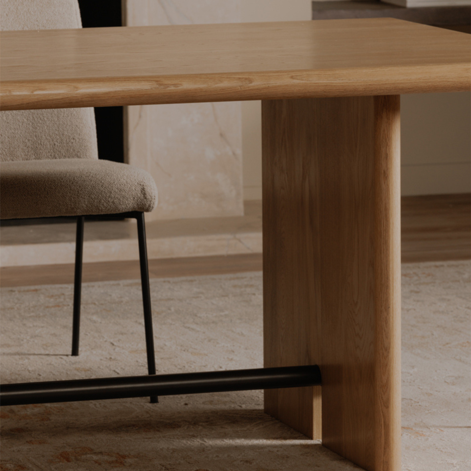 Crafted from solid oak and oak veneer, the Madison dining table's tabletop features elegant bullnose edges along the length, juxtaposed with crisp edges on the shorter sides.