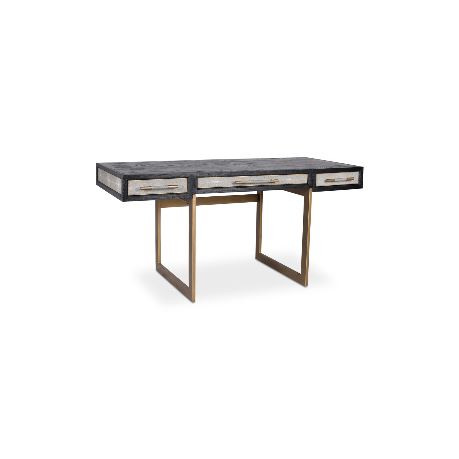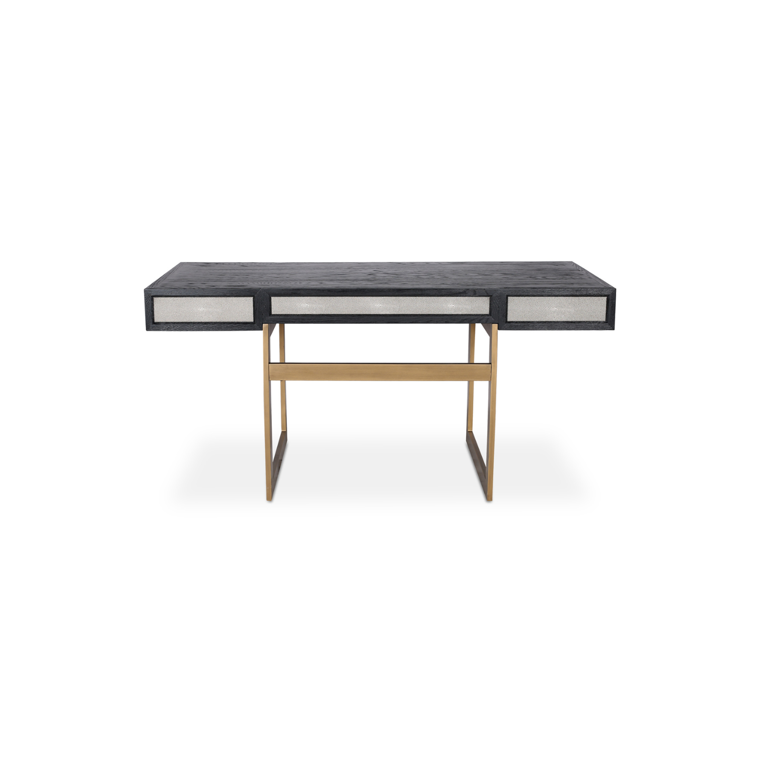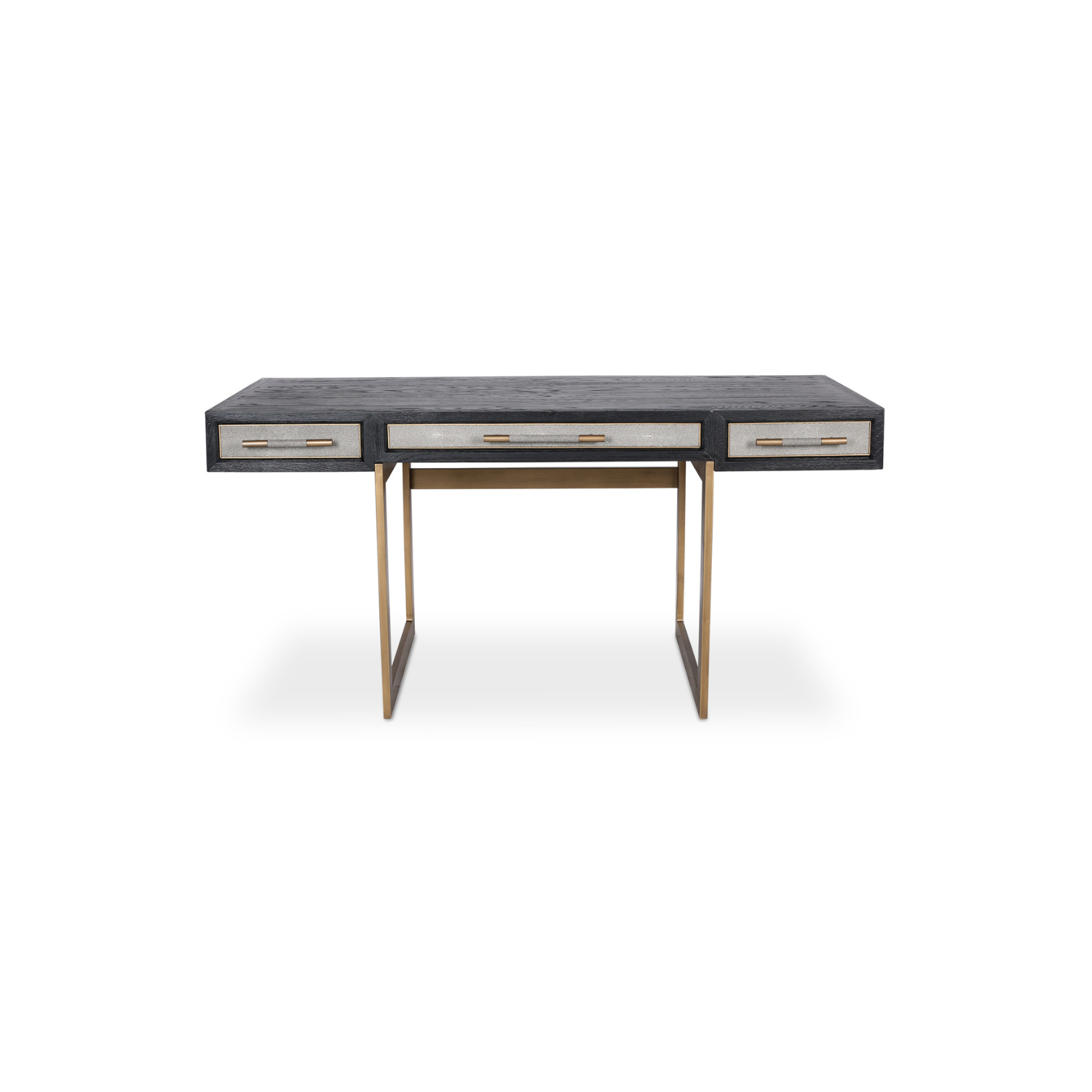 Feeling for the timeless glamor of art deco with a modern twist? Meet the Mako collection. With each item upholstered in the highest quality vegan leather shagreen, the Mako collection brings effortless style, visual texture and substance to your living space. With a three-drawer design and spacious tabletop, this desk offers an elemental chic to any office or living space. An elegant and minimalistic icon, the Mako desk will have you counting down the hours till you can get back to work.