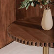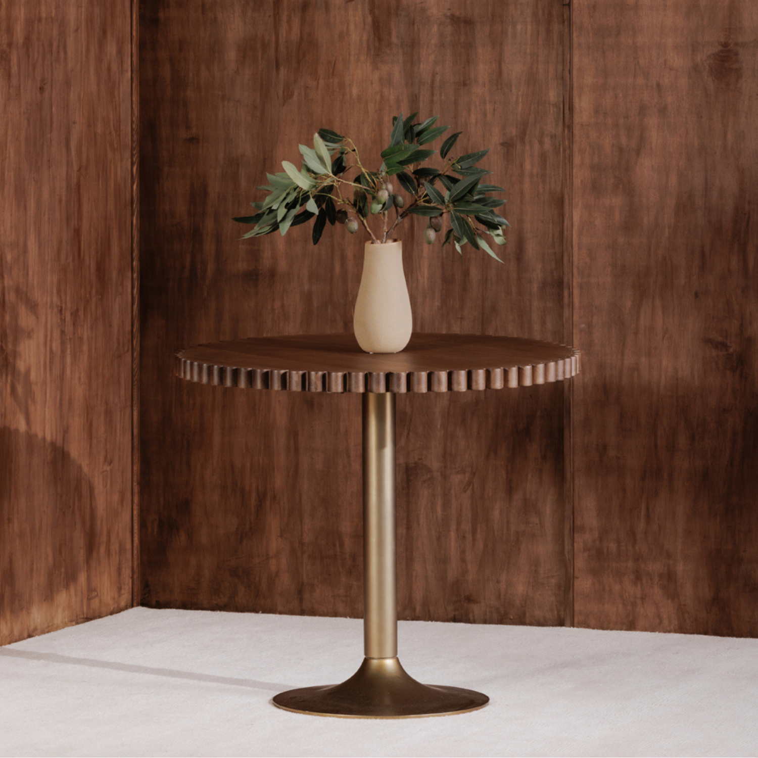 The repetition of the wave pattern creates an inviting rhythm, providing a memorable visual experience along with a brass base, nodding to vintage design while maintaining a contemporary refinement, together conveying a sense of future heirloom quality.
