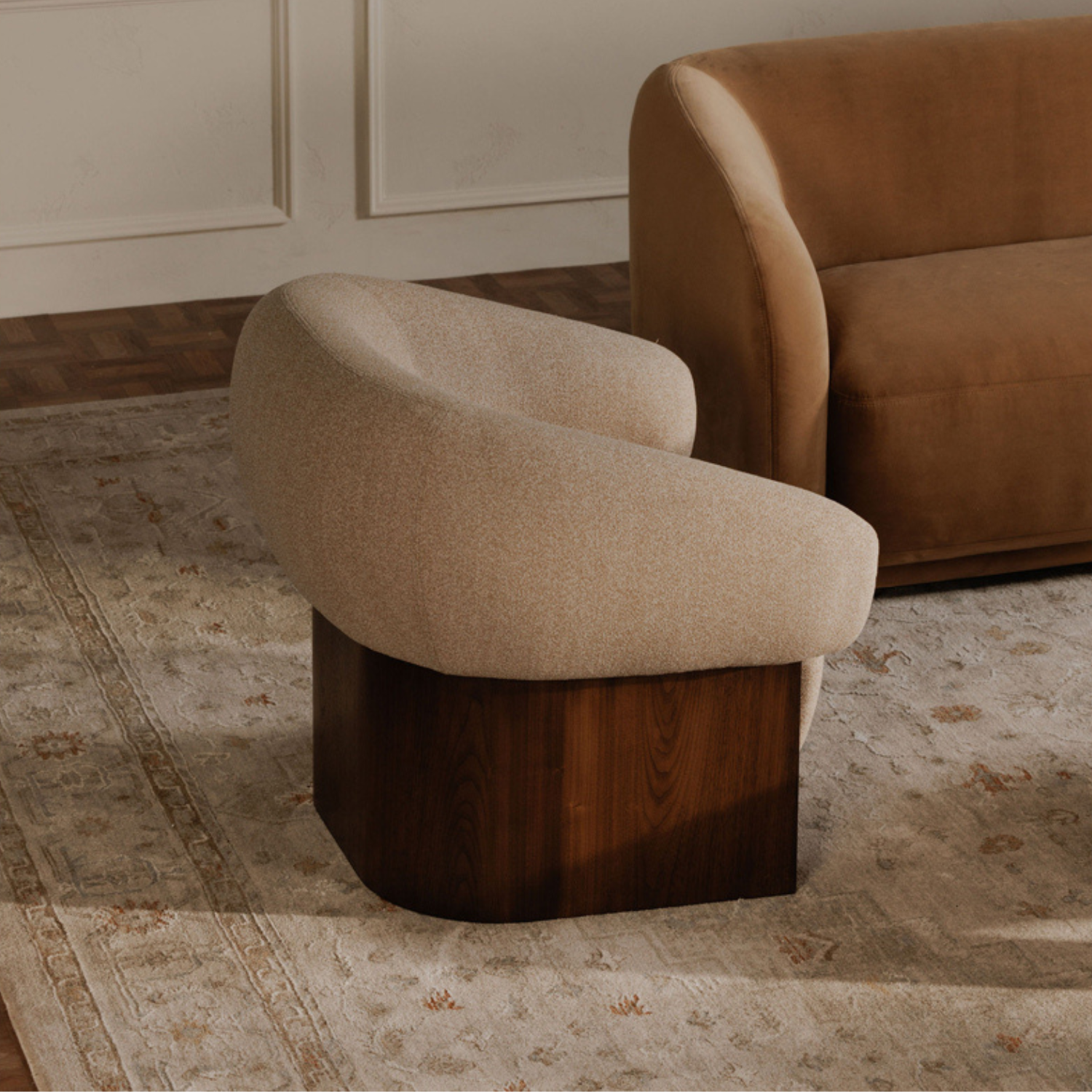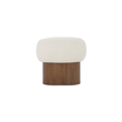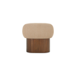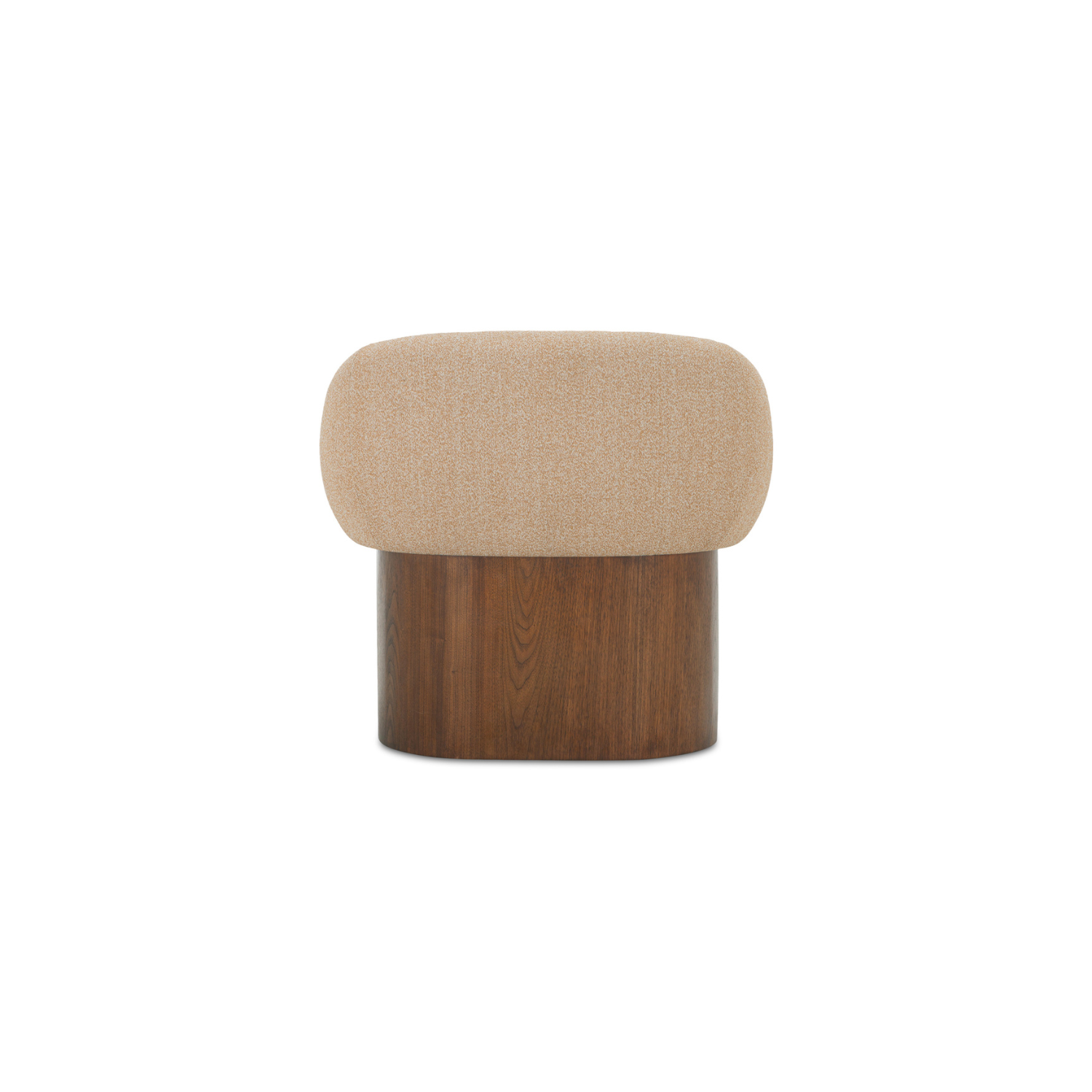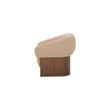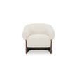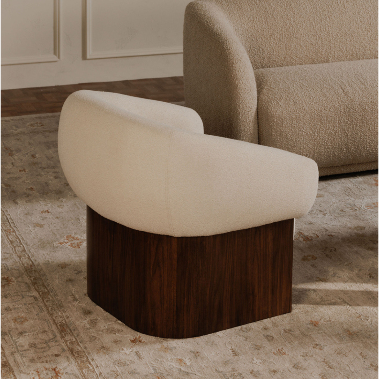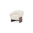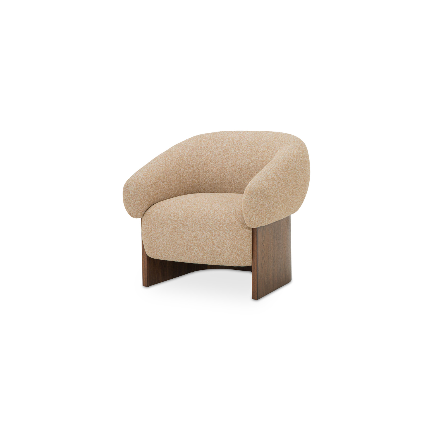The Otto accent chair merges the robust grace of a walnut veneer over solid rubber wood base with the delicate comfort of a plush, curved back and upholstered in a flecked micro bouclé of 100% recycled GRS-certified polyester that is OEKO Tex 100.