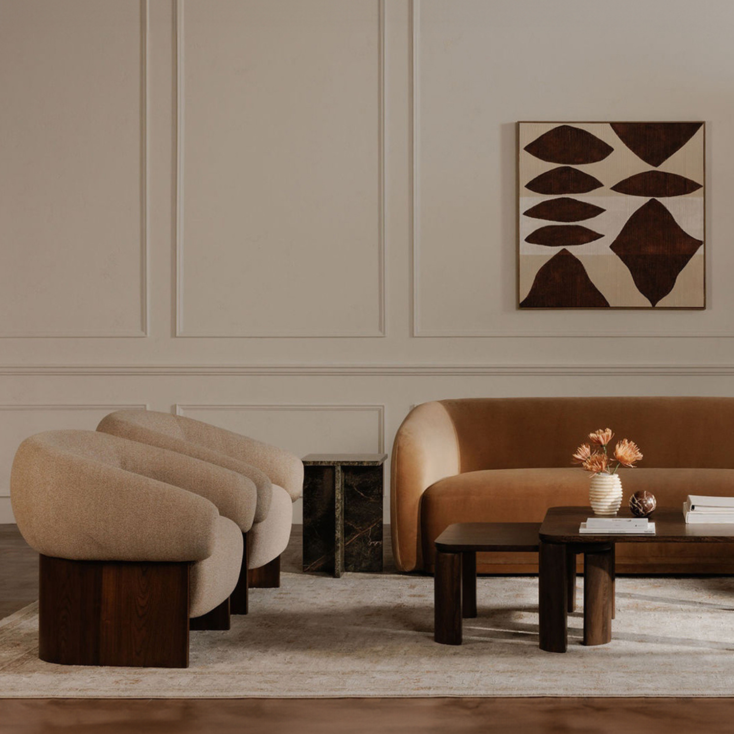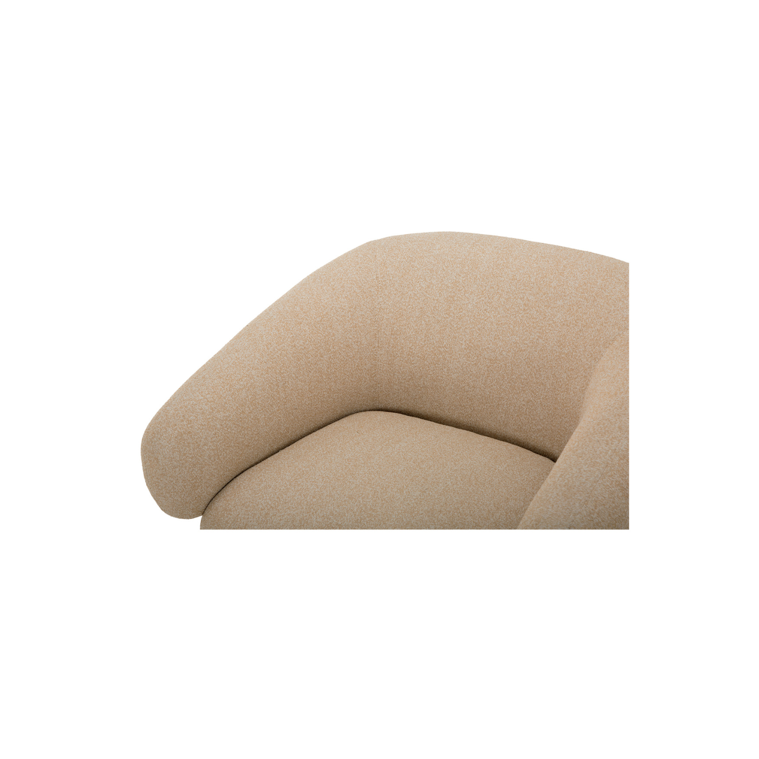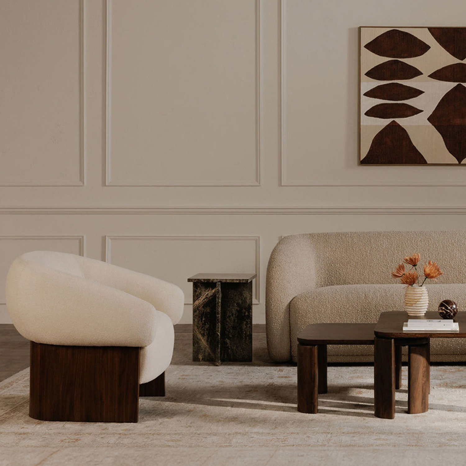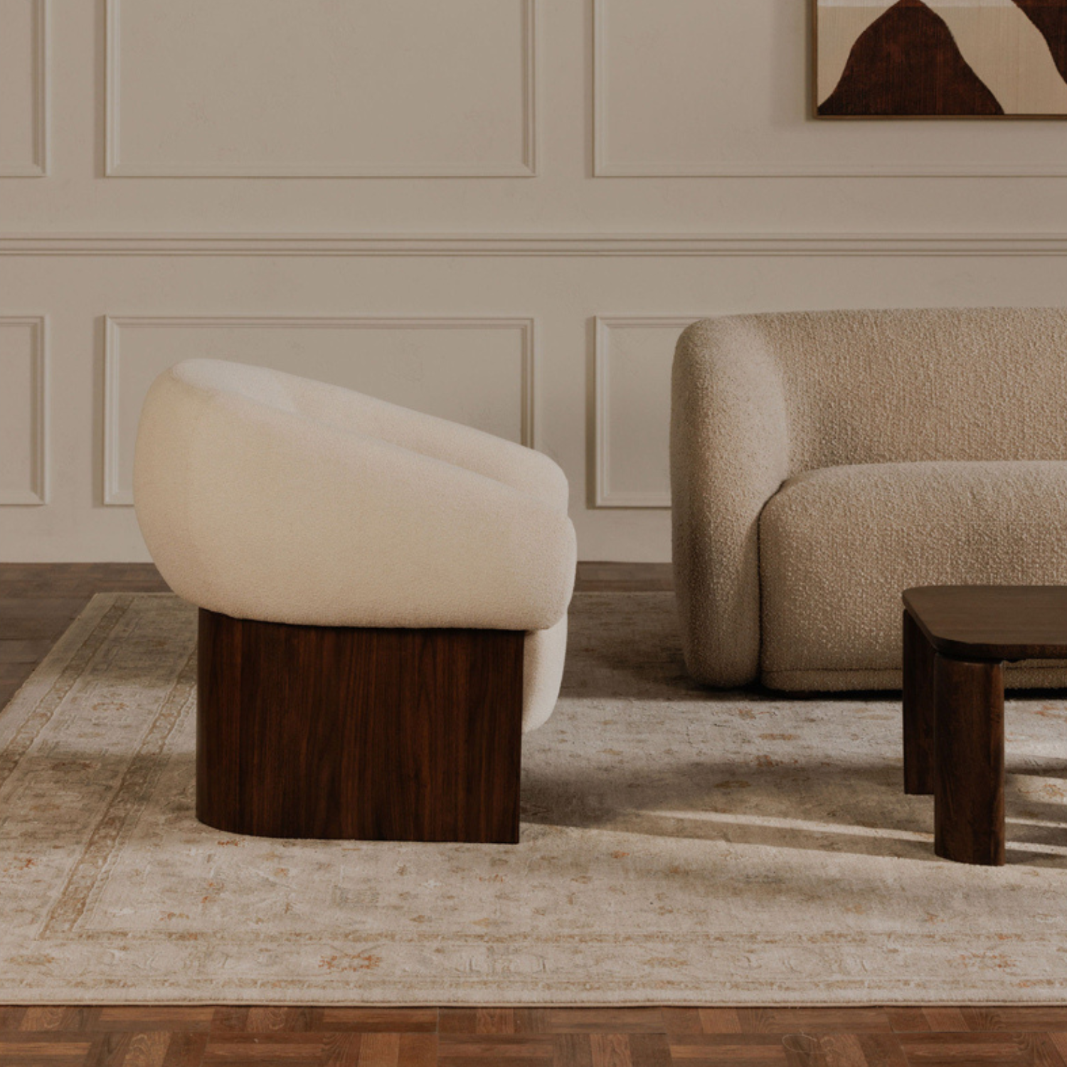 The Otto accent chair merges the robust grace of a walnut veneer over solid rubber wood base with the delicate comfort of a plush, curved back and upholstered in a flecked micro bouclé of 100% recycled GRS-certified polyester that is OEKO Tex 100.