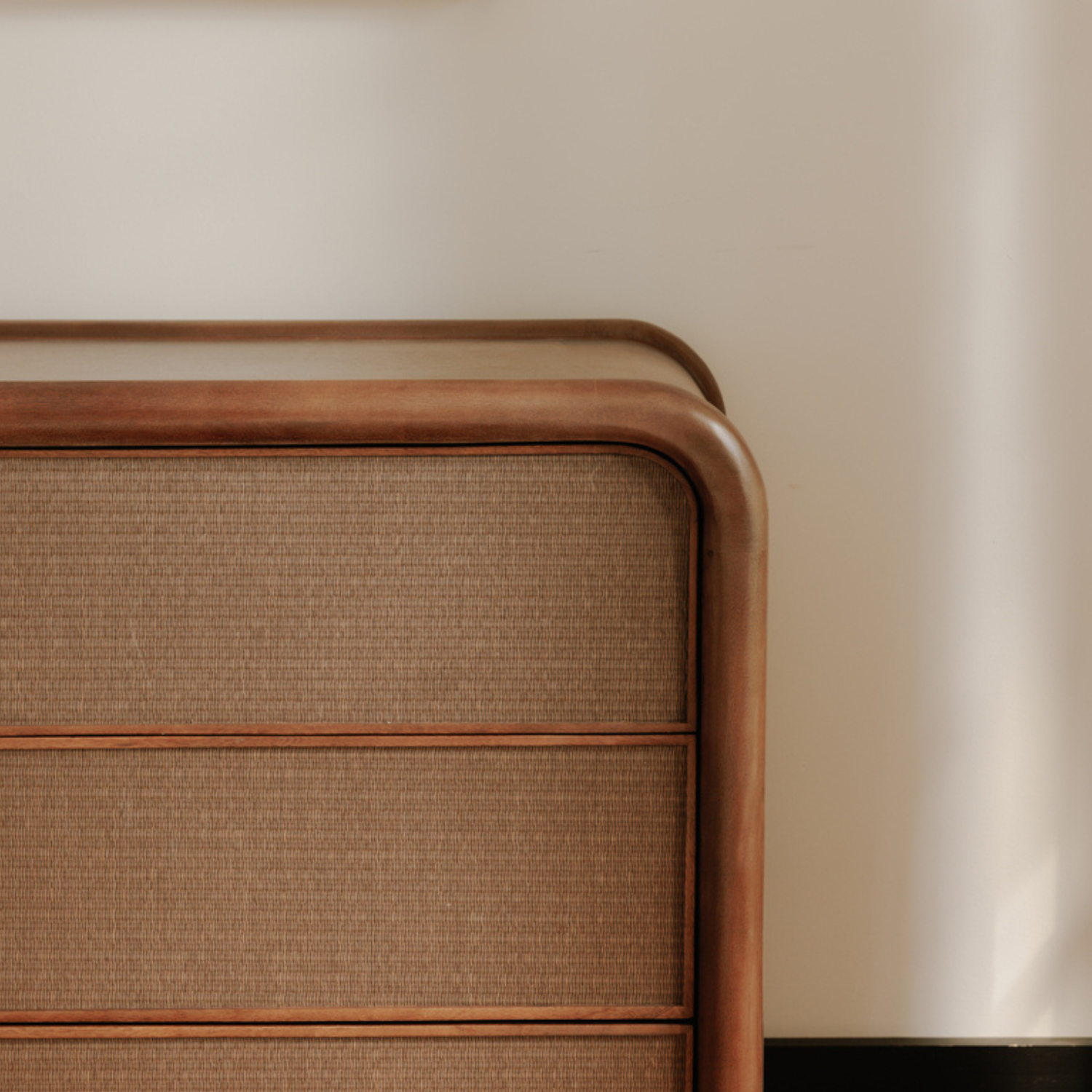 - Materials: Solid Mango Wood Frame, Tatami-Mat Drawer Fronts, Wood and MDF Drawer Boxes