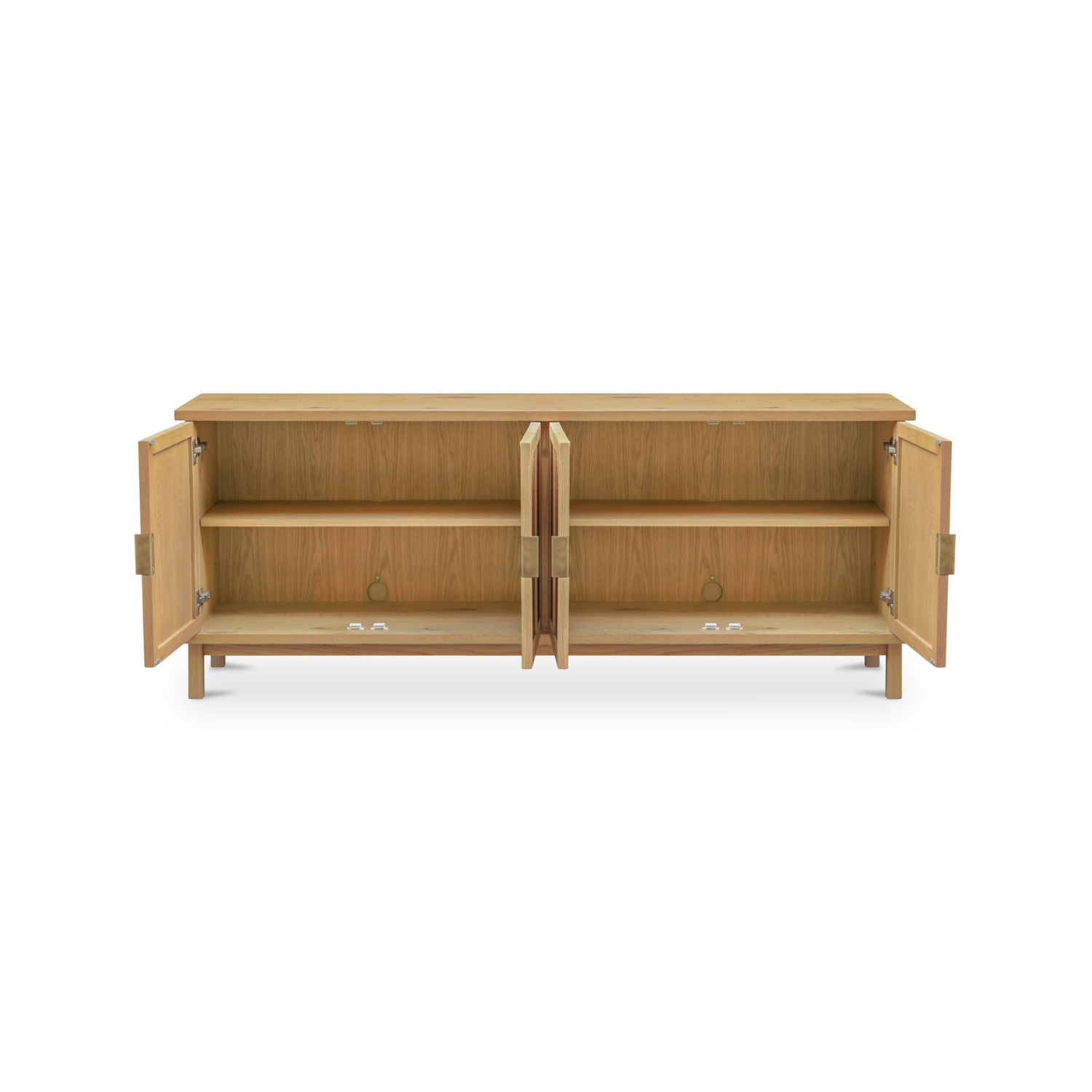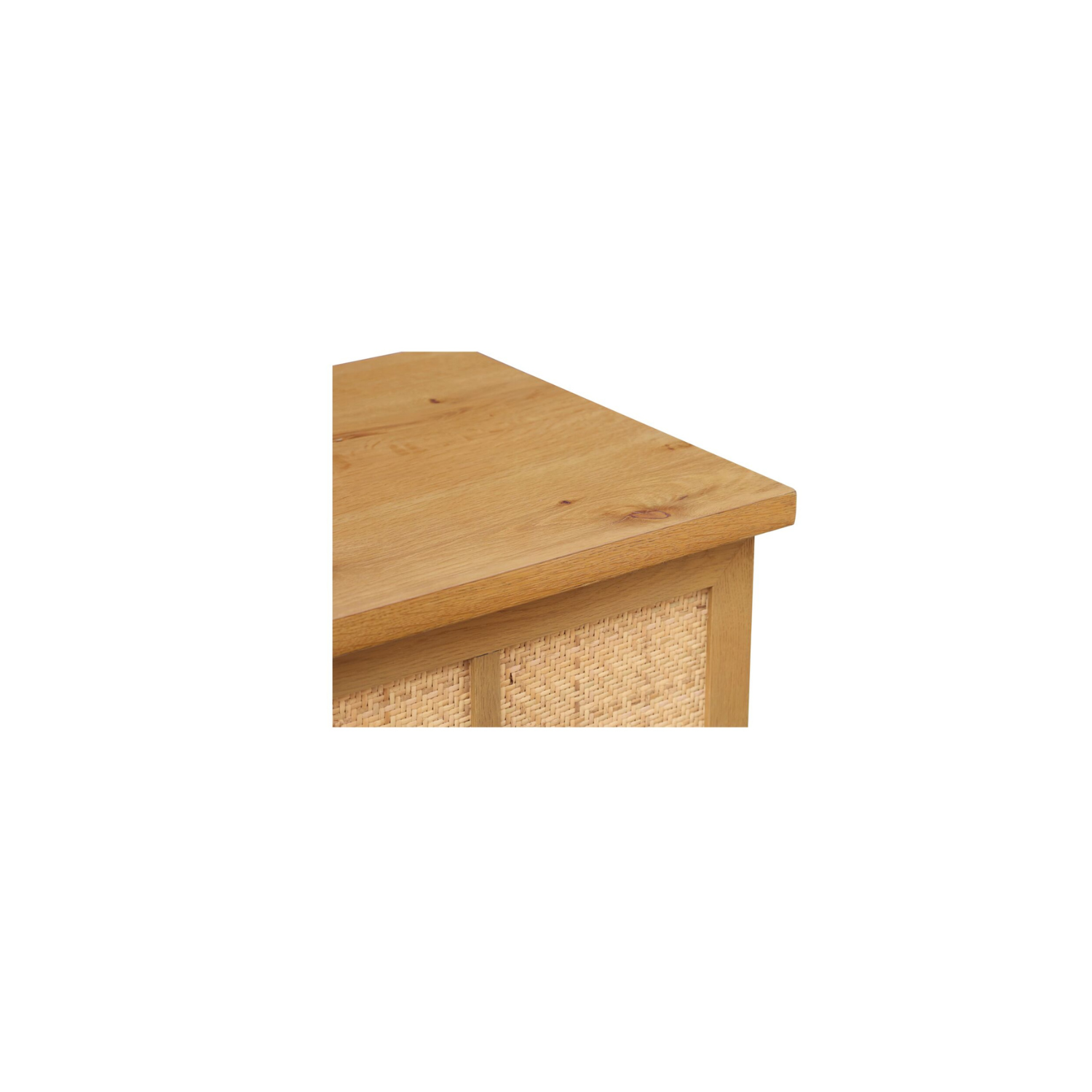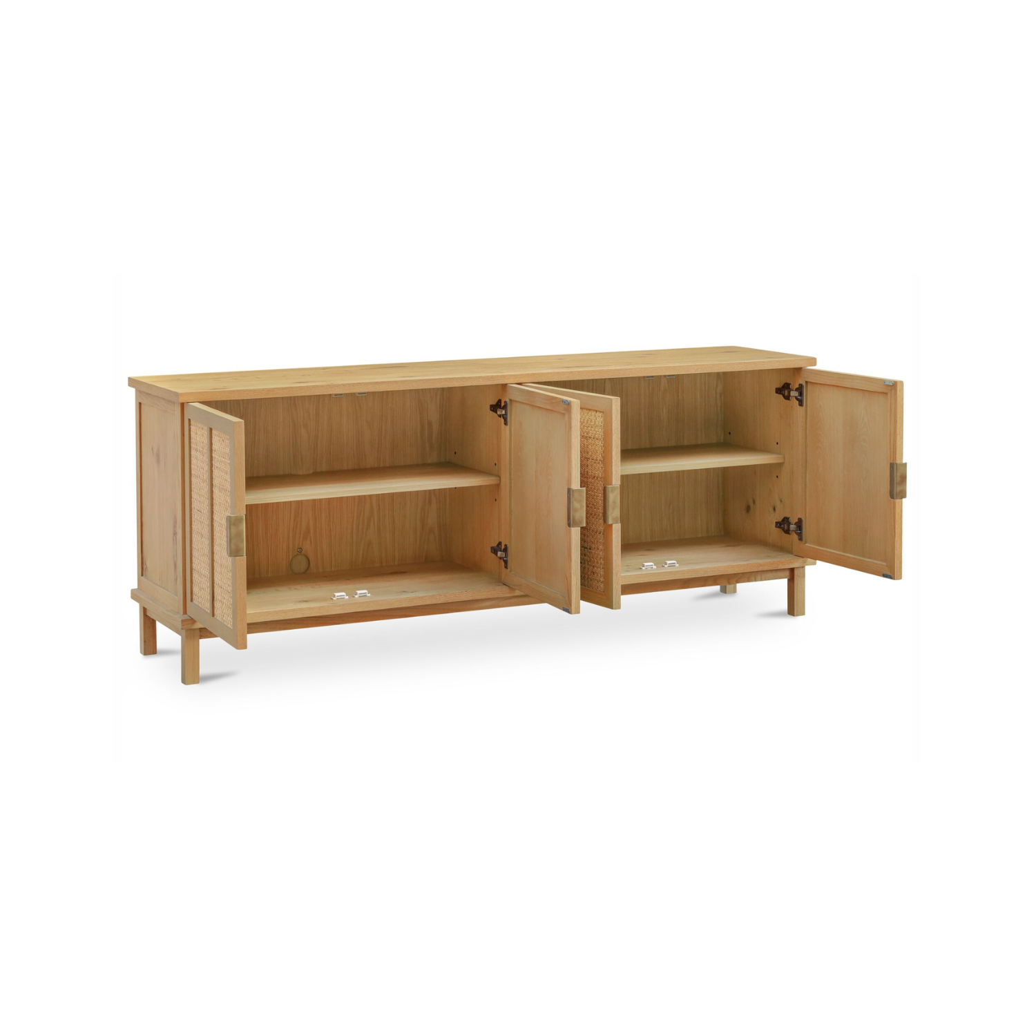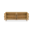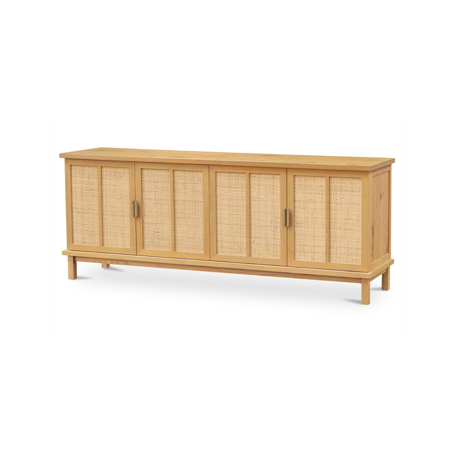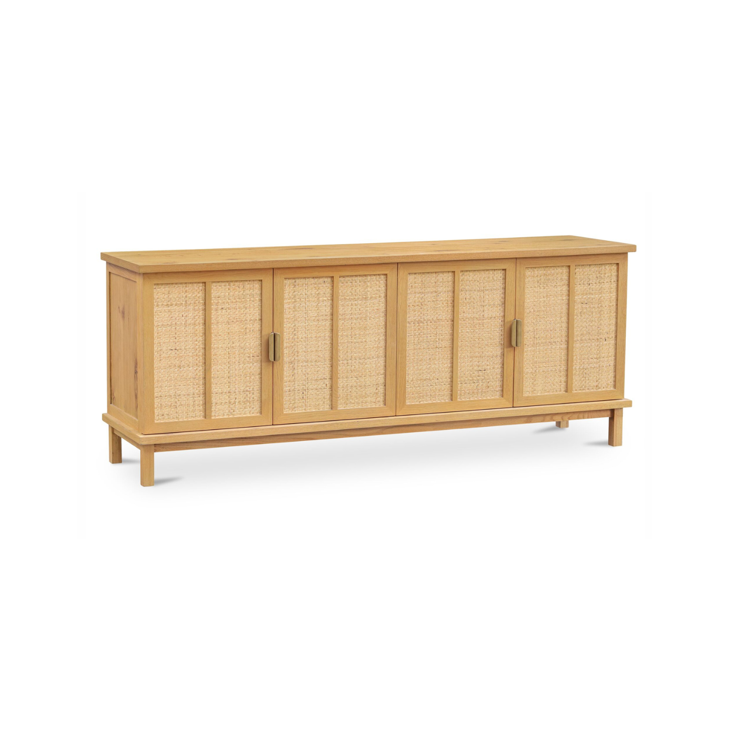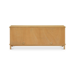 A solid oak frame in a rustic natural finish shows off the grain, while woven rattan doors bring texture and warmth. Slim legs and a soft top overhang add lift and dimension. Brass-finish handles? Just the right contrast. With soft-close doors and media holes in the back, it’s equal parts easygoing and well-considered.