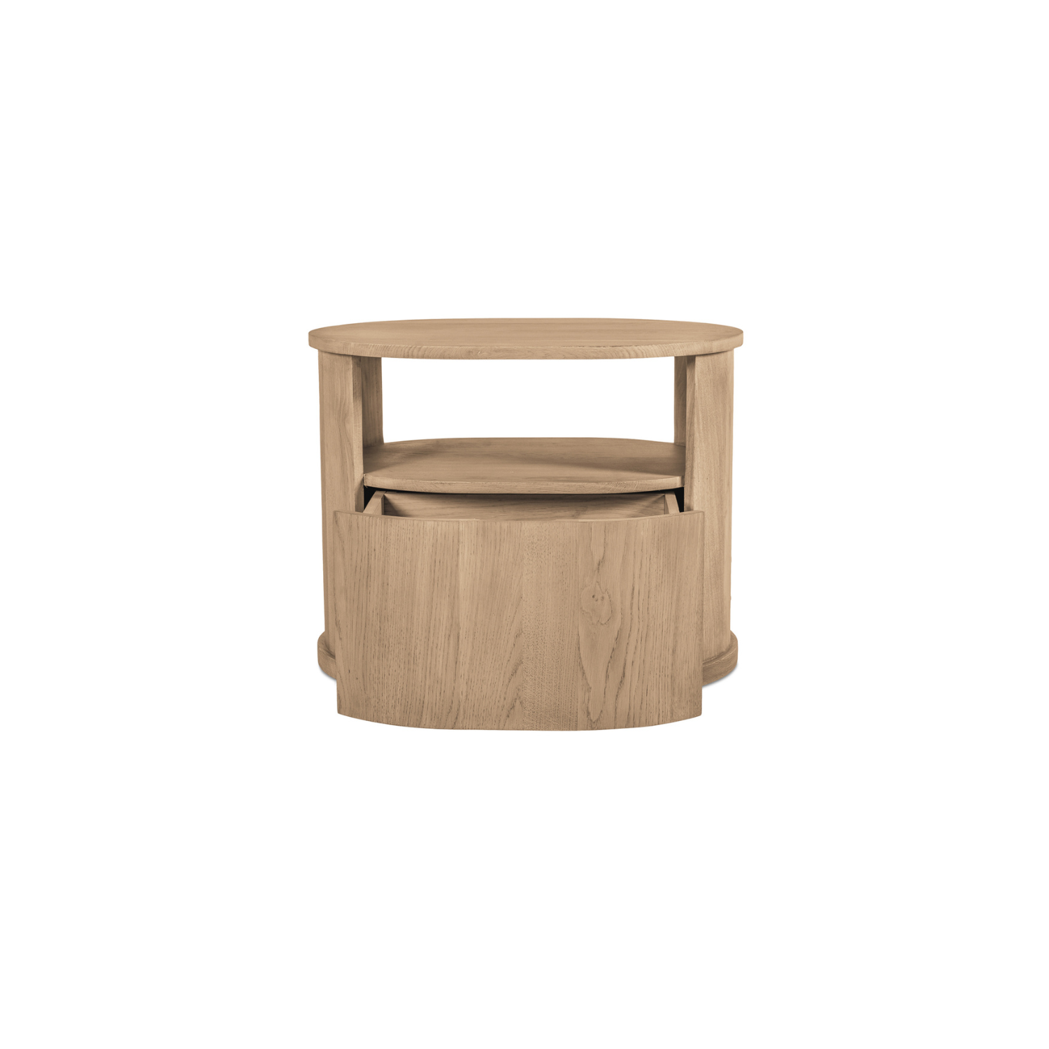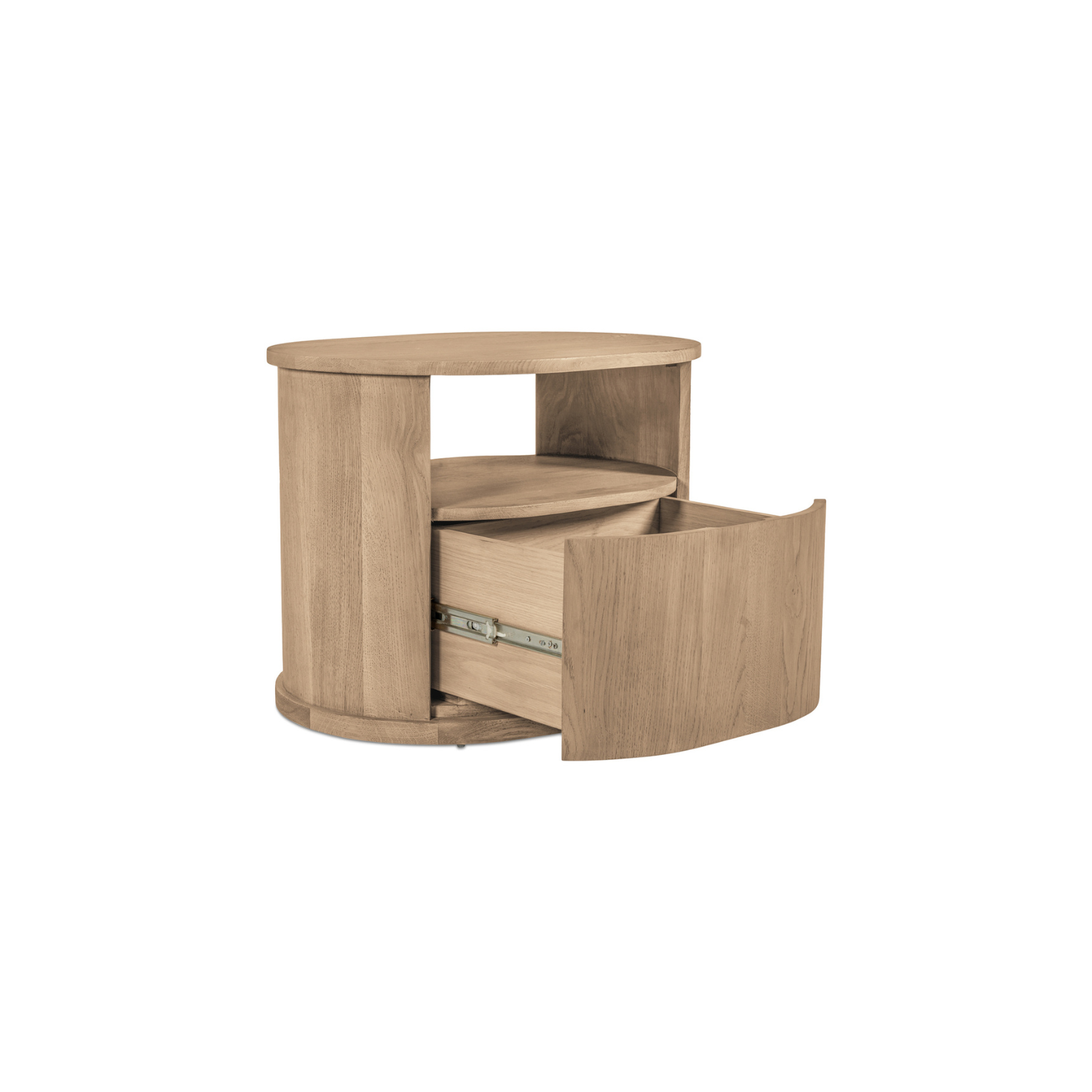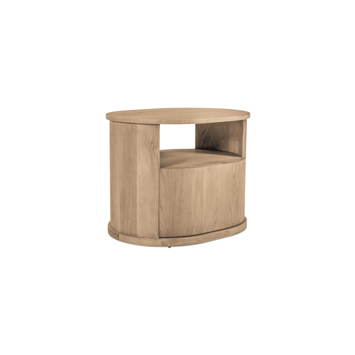 The Tommy nightstand embraces modern simplicity in a natural finish. Its distinctive racetrack capsule shape adds a contemporary touch to the bedroom, seamlessly blending form and function.