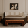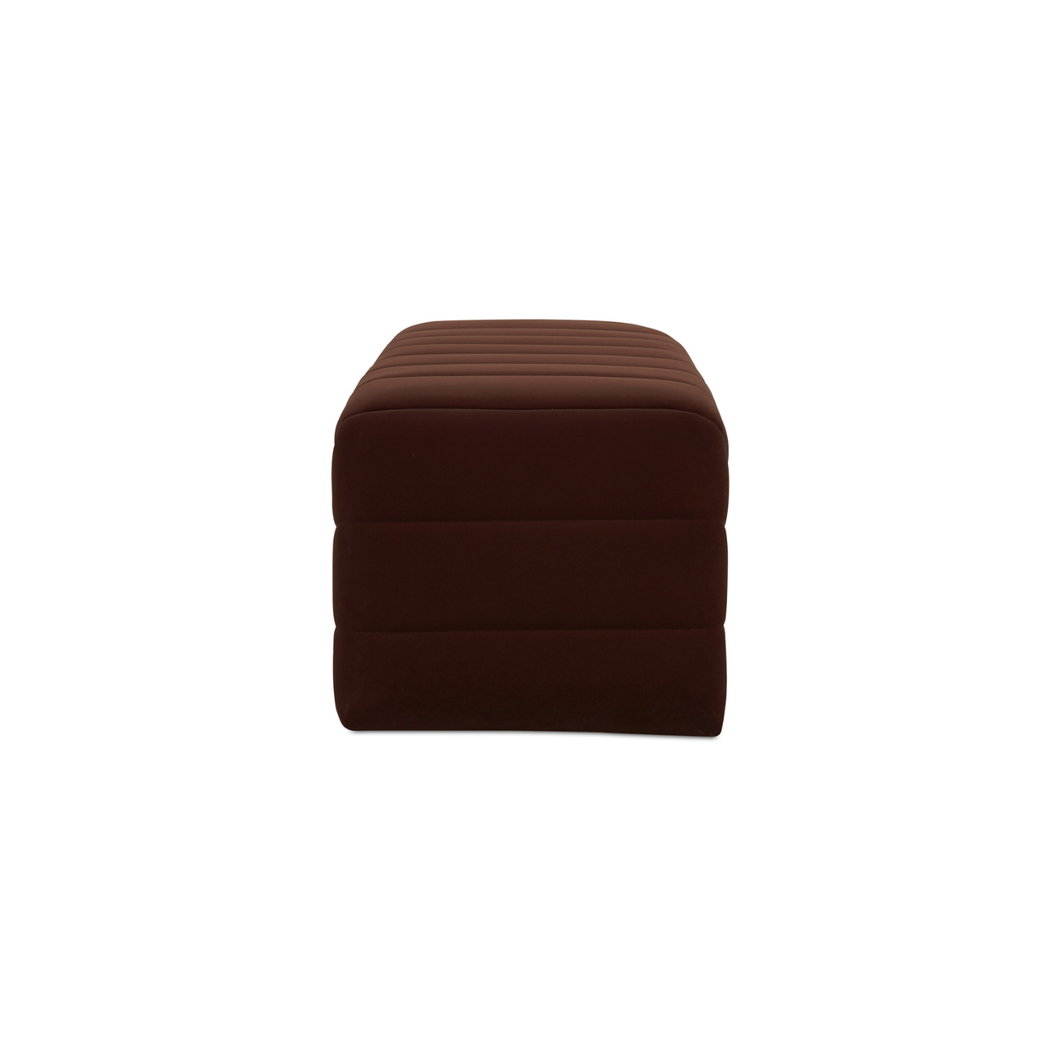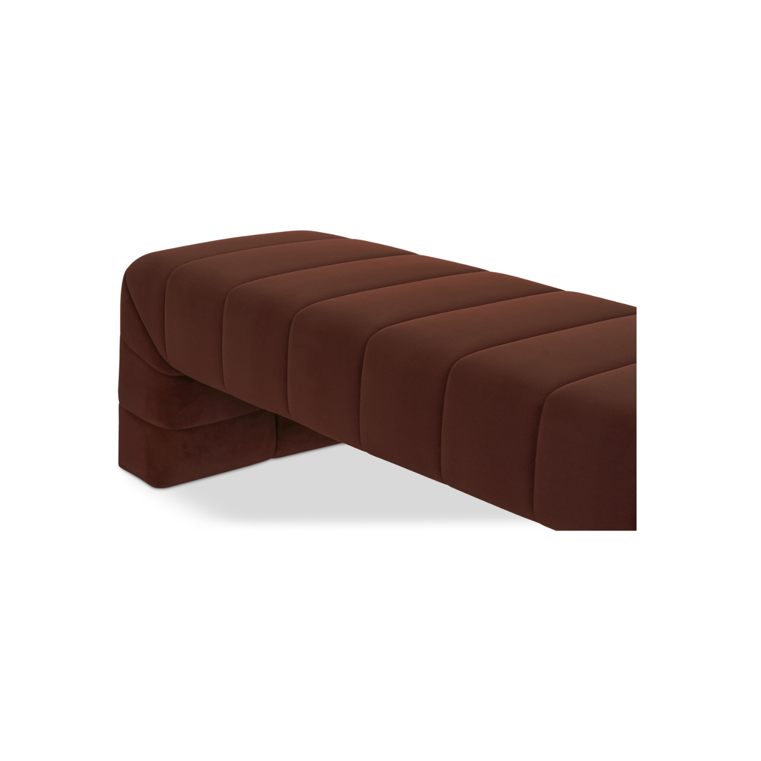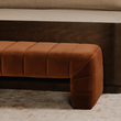 The Verity bench features a plump form enveloped in warm brown velvet upholstery for a touch of elegance. Wide channel detailing adds texture and visual interest, complemented by rich, warm tones that tell a story of comfort and coziness as the high-density foam seat provides a plush seating experience.