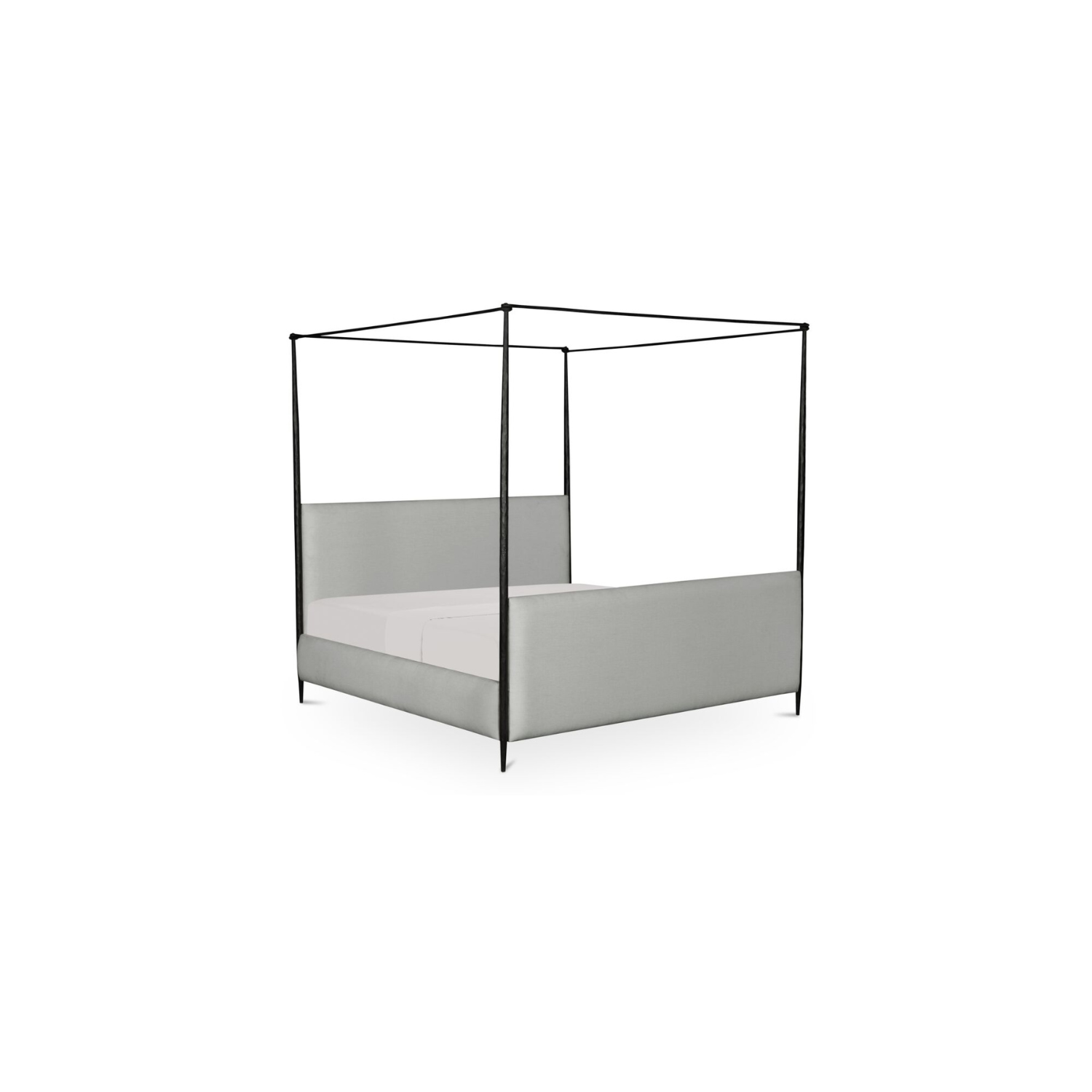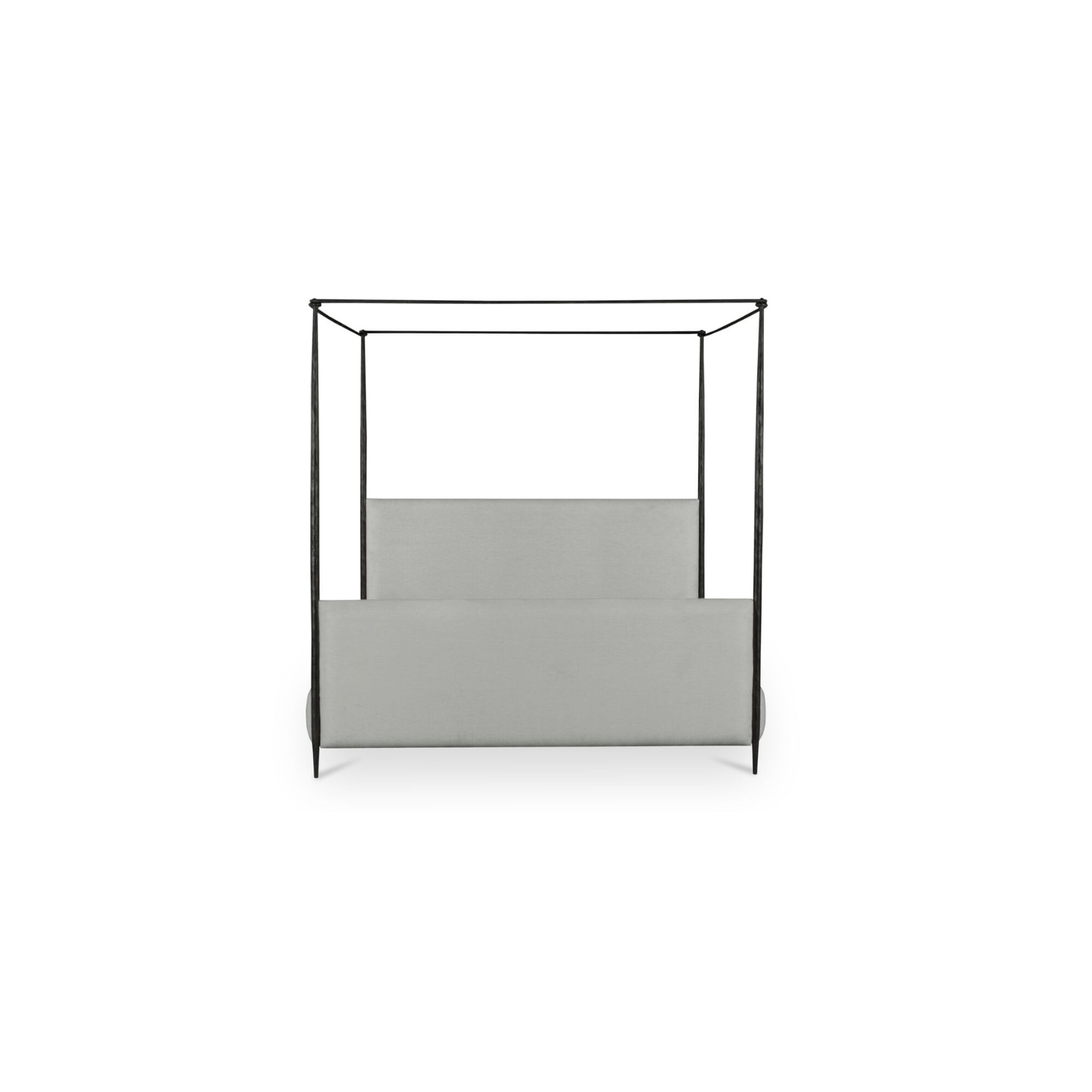 Linen-blend upholstery on the headboard and footboard adds height, warmth, and enough softness to balance the strength of the frame. Sculptural, tailored, and made to anchor the room.