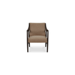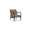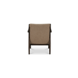 Its deep brown finish enhances the wood's natural grain, offering traditional charm to its slim, mid-century design. The curved, slender arms broaden for restful support, balancing the chair's sleek profile with practicality.